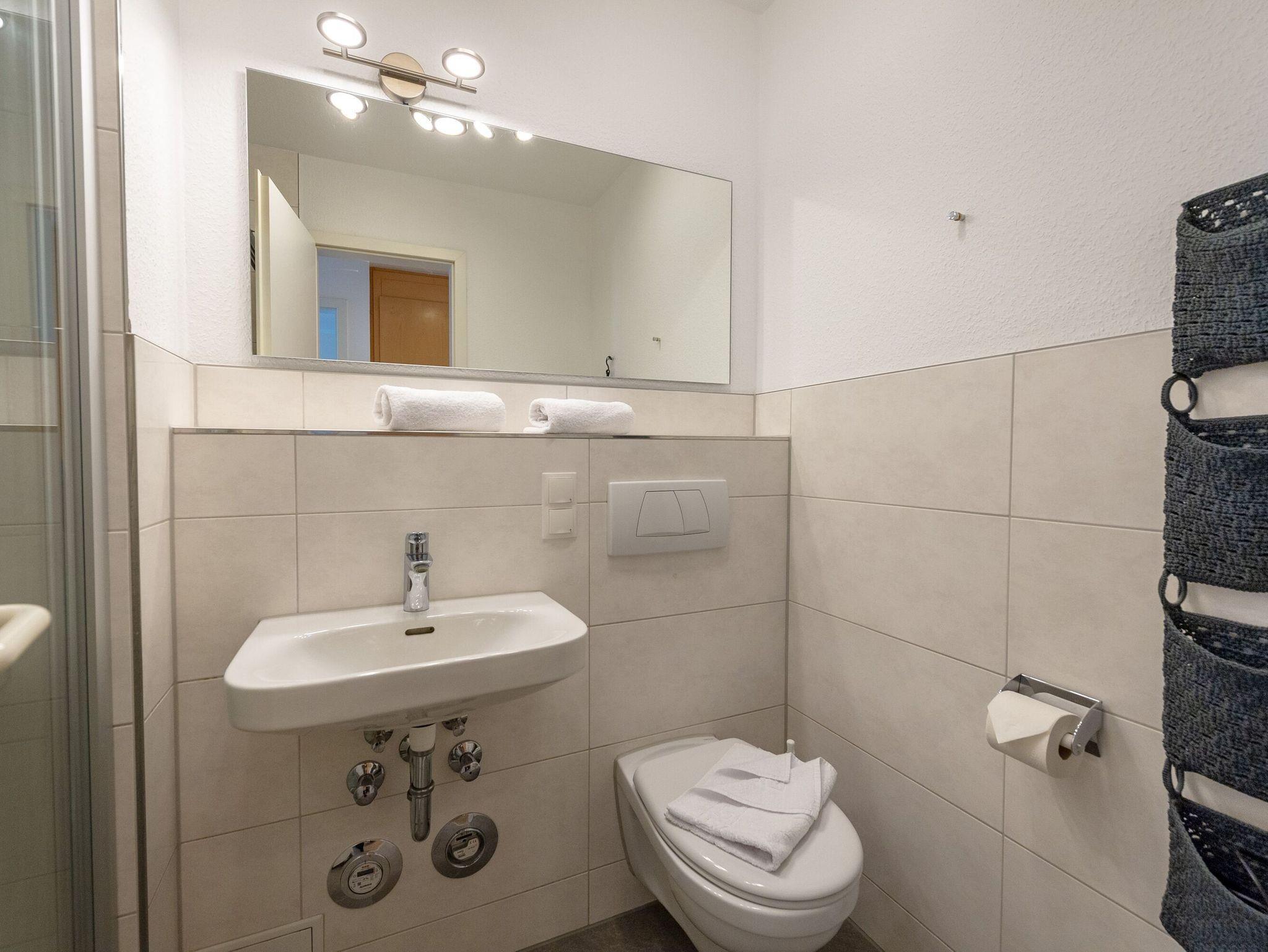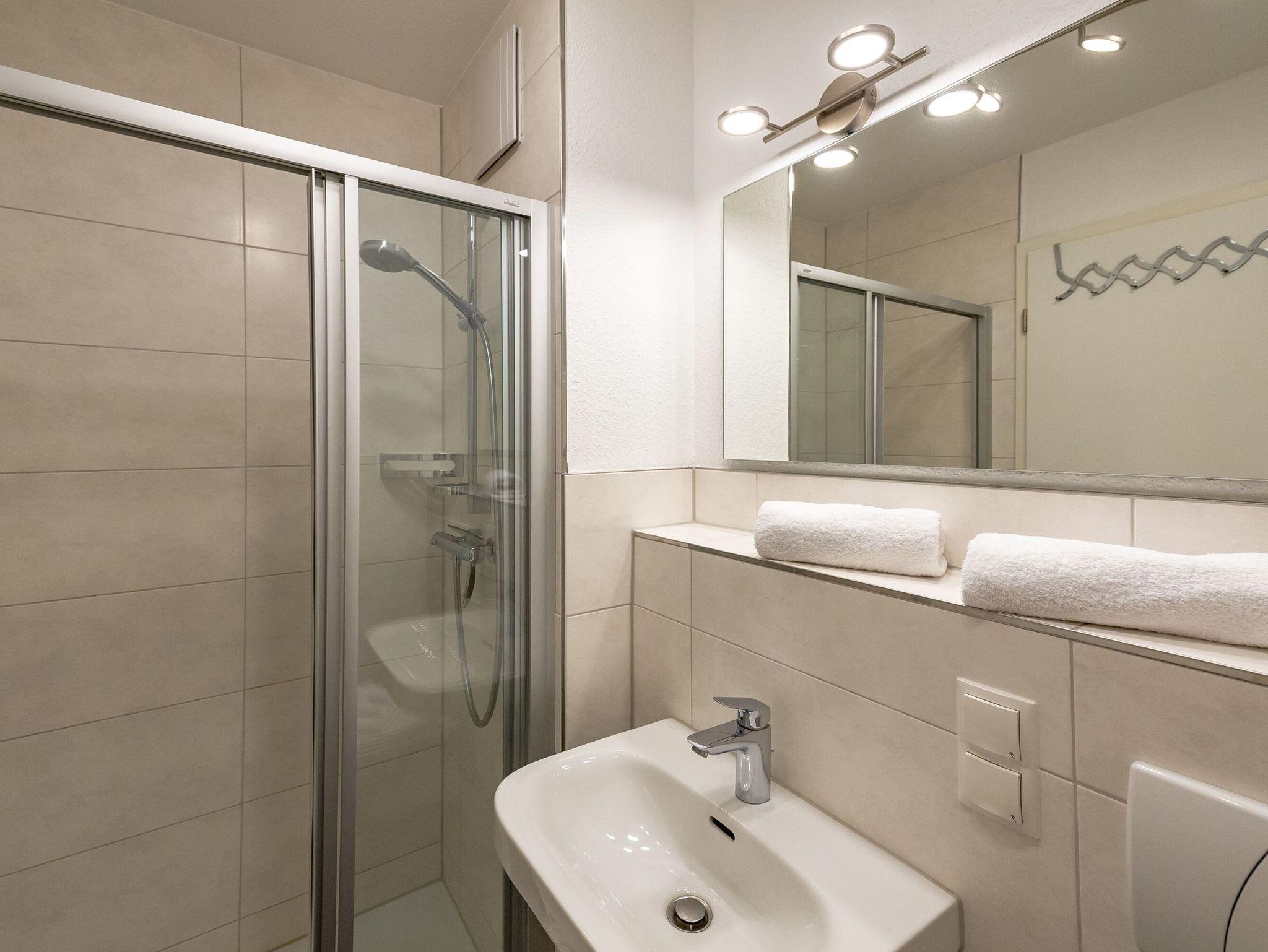 Die Wohlfühloase der Wohnung ist das moderne Duschbad mit großer Dusche, WC, beheizbarem Handtuchhalter und Fön.