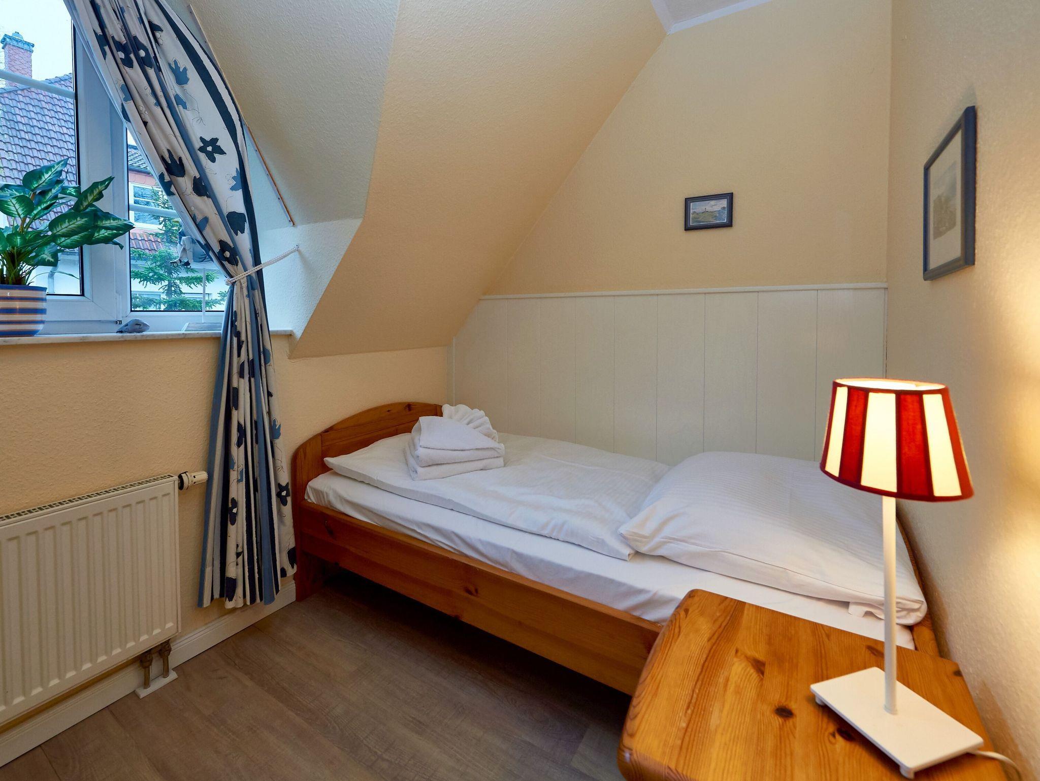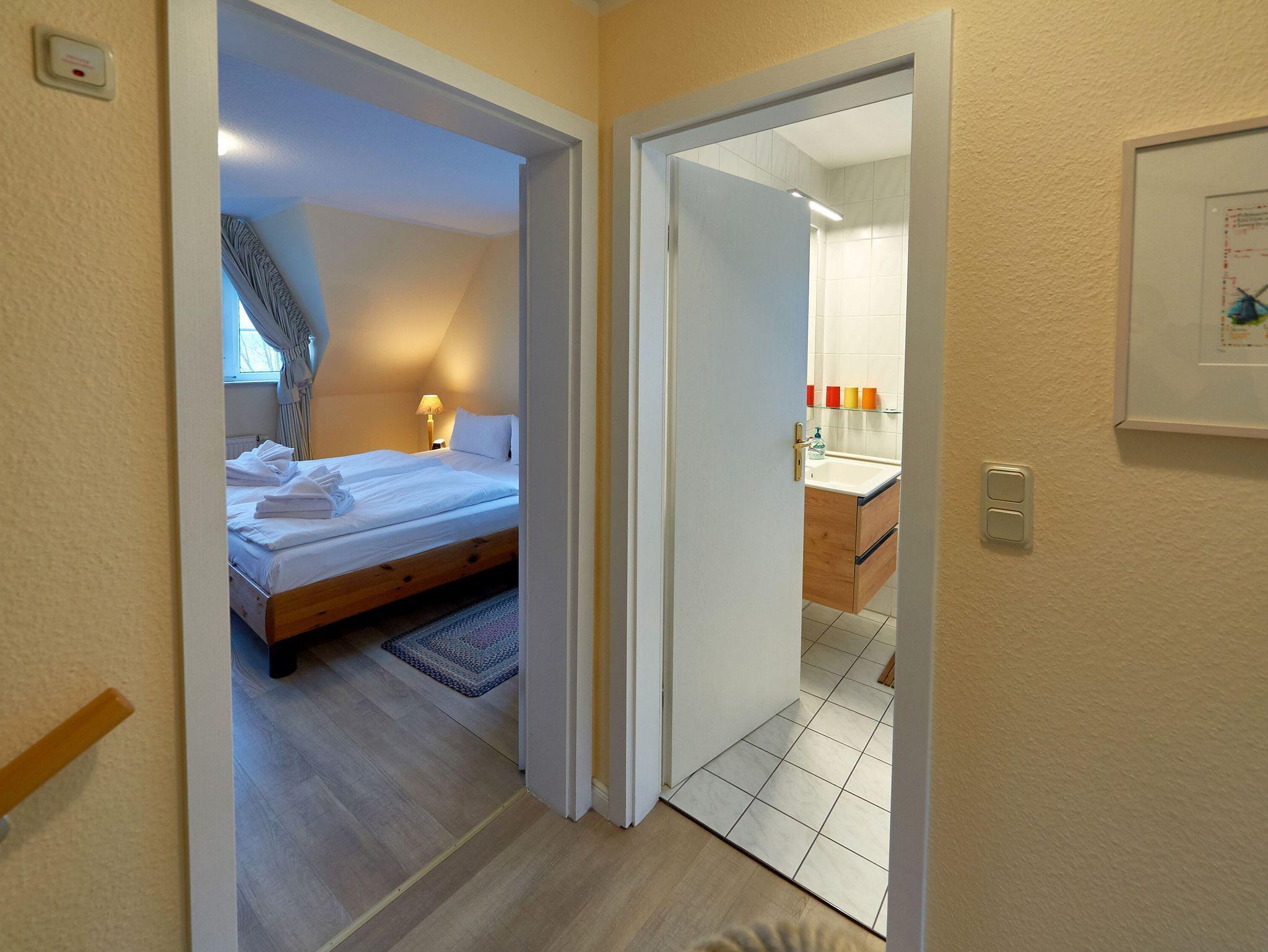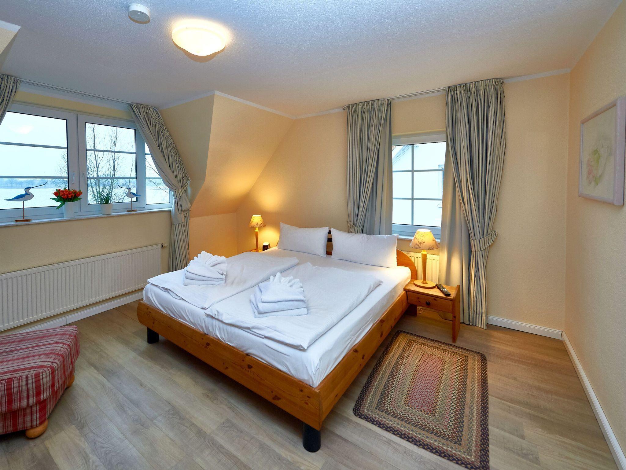 Im ersten Obergeschoss befinden sich das Badezimmer mit Dusche/WC und zwei Schlafzimmer. Das größere der Schlafzimmer ist mit einem Doppelbett (1,80 x 2,00m), einem großen Kleiderschrank und einem TV ausgestattet und bietet ebenfalls einen schönen Ausblick auf den Selliner See. Im kleineren Schlafzimmer sind zwei Einzelbetten (1,00 x 1,90m) untergebracht.