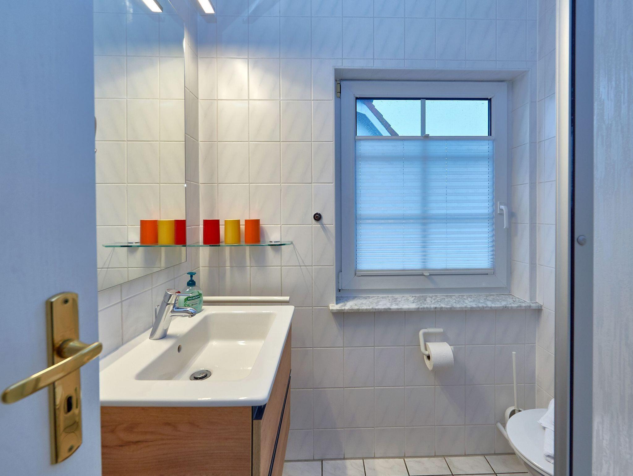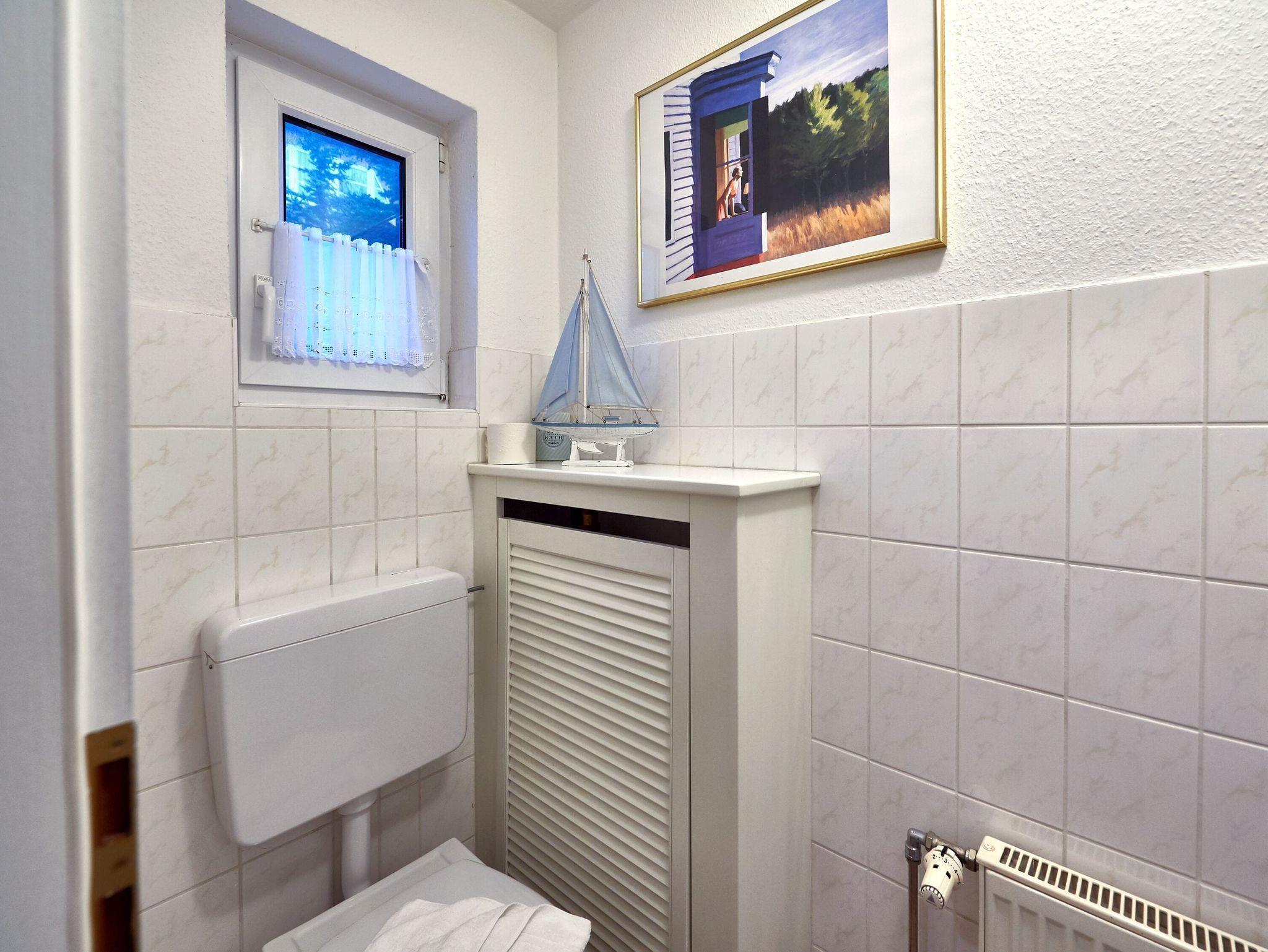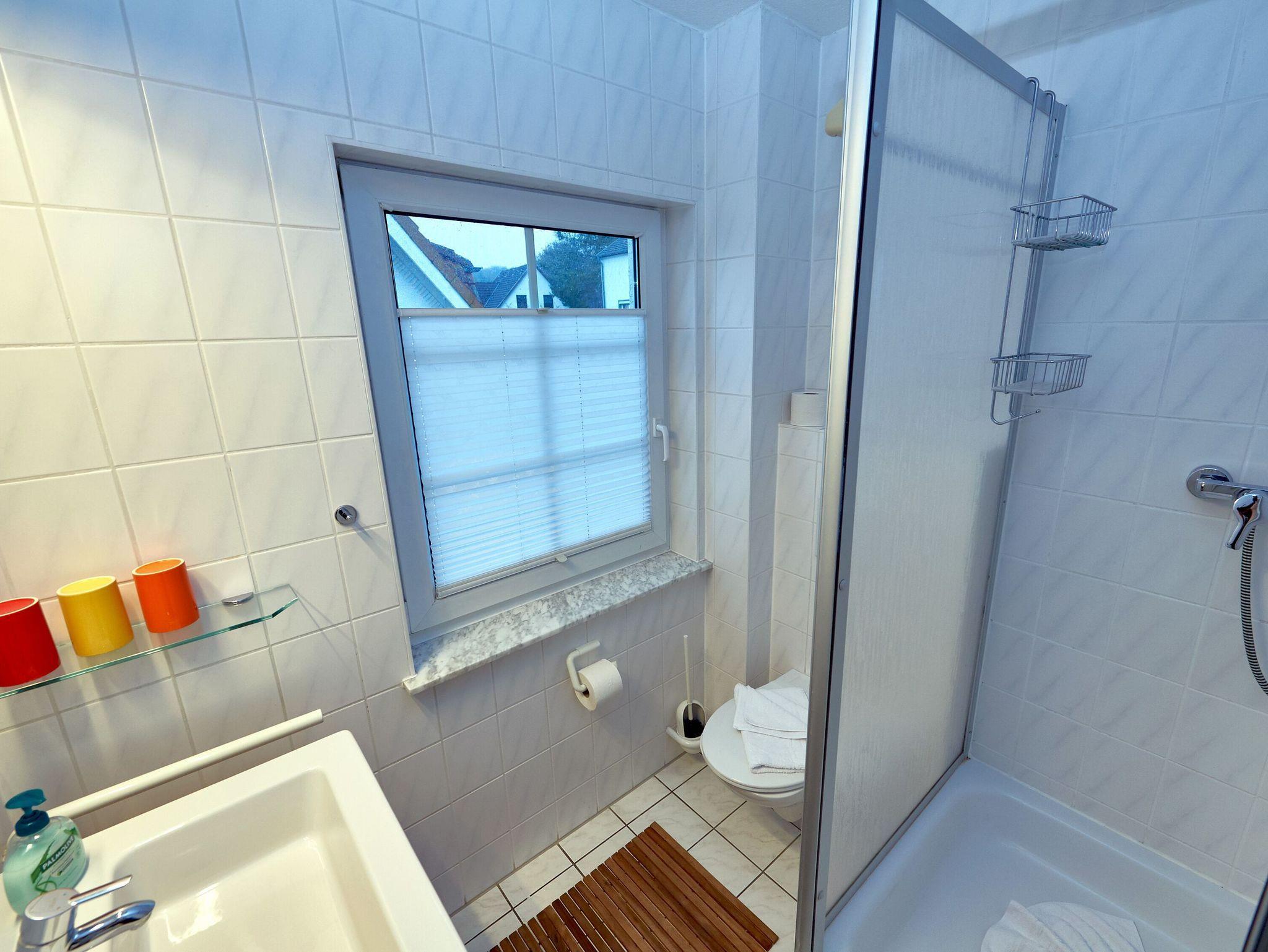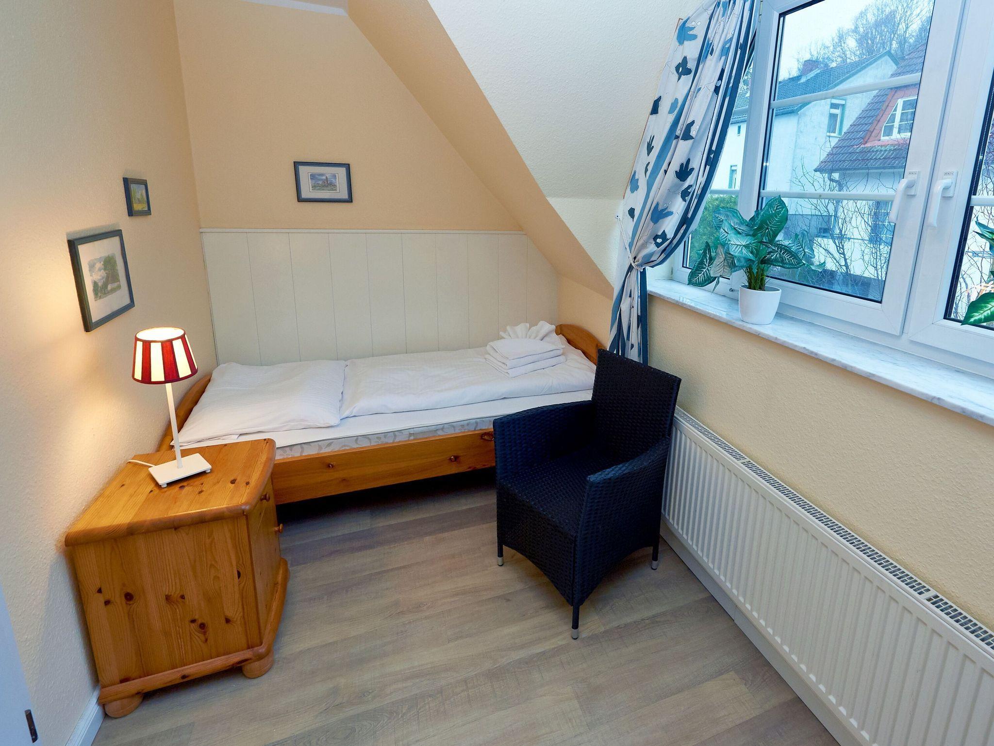 Im ersten Obergeschoss befinden sich das Badezimmer mit Dusche/WC und zwei Schlafzimmer. Das größere der Schlafzimmer ist mit einem Doppelbett (1,80 x 2,00m), einem großen Kleiderschrank und einem TV ausgestattet und bietet ebenfalls einen schönen Ausblick auf den Selliner See. Im kleineren Schlafzimmer sind zwei Einzelbetten (1,00 x 1,90m) untergebracht.