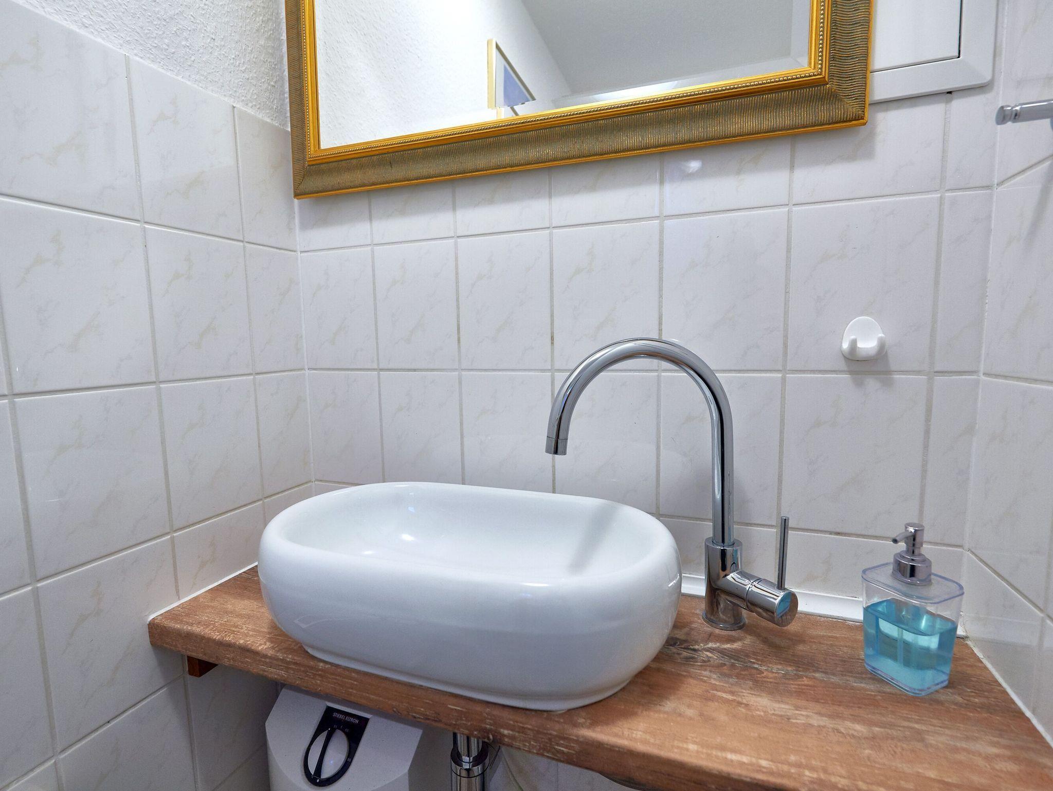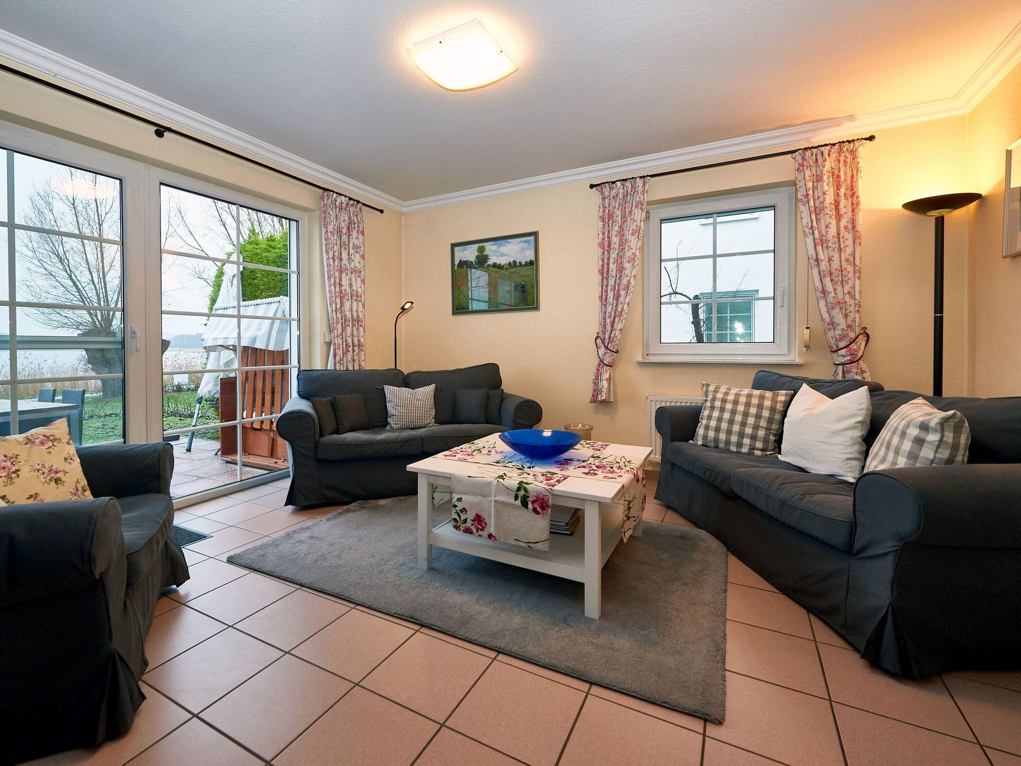 Im Erdgeschoss befinden sich das überaus geräumige Wohnzimmer mit bequemen Polstermöbeln und herrlichem Seeblick, die voll ausgestattete Küche mit gemütlicher Sitzecke, ein Gäste-WC sowie der Hauswirtschaftsraum.
