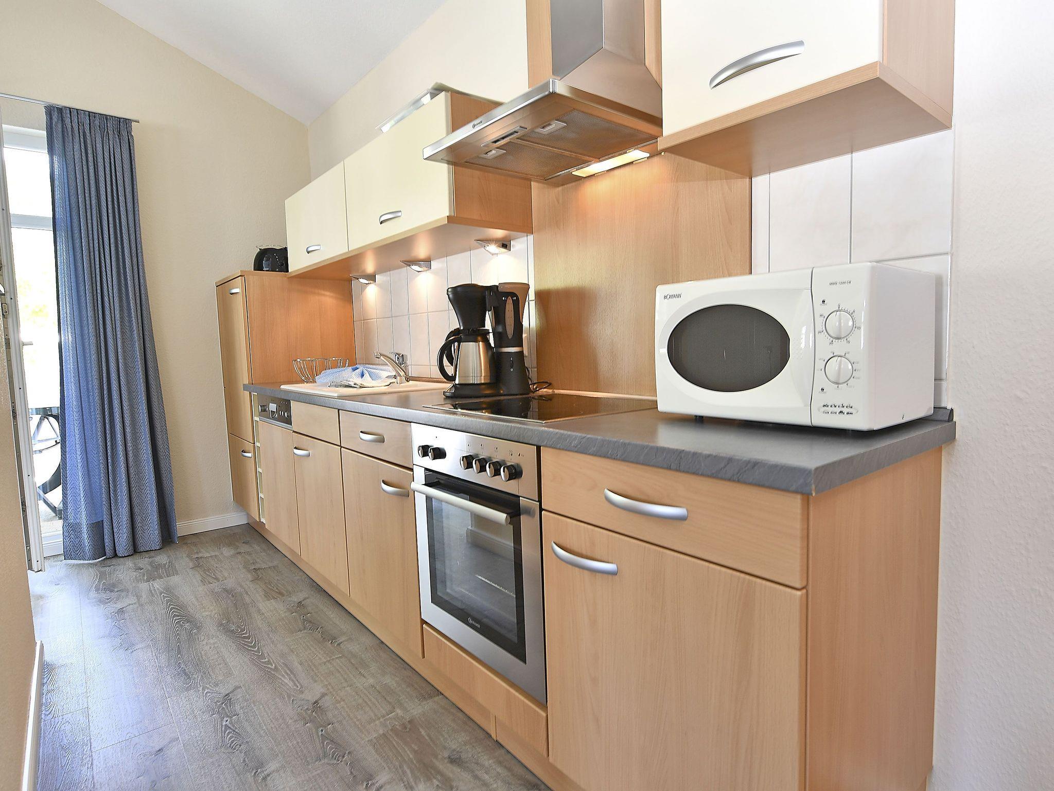 Die harmonisch im Wohnbereich integrierte Küchenzeile ist ausgestattet mit einem Kühlschrank mit Gefrierfach, einem 4-Platten-Cerankochfeld, einem Backofen, einer Geschirrspülmaschine, einer Mikrowelle, Wasserkocher, Kaffeemaschine, Toaster und diversem Kleininventar, das die Küchenausstattung komplettiert.