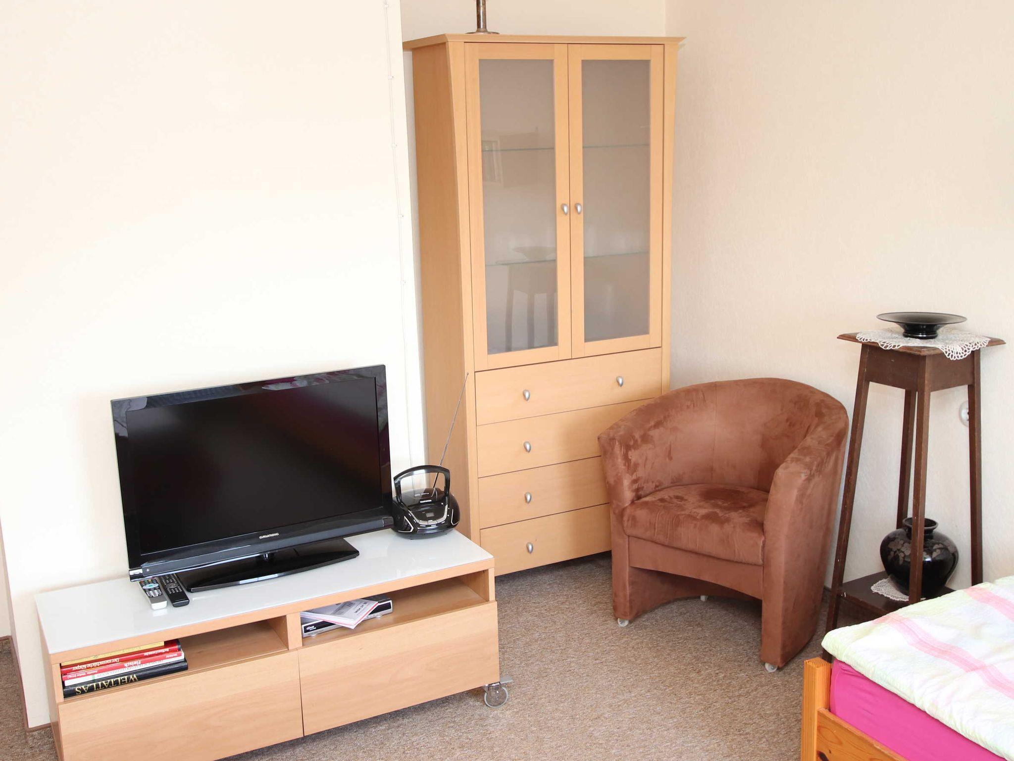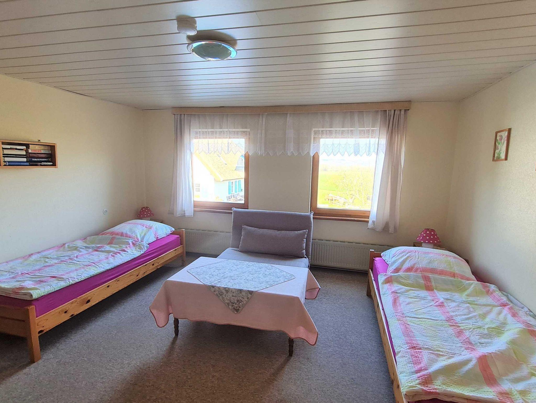 Die große Ferienwohnung befindet sich im Obergeschoss des Hauses und hat zwei Zimmer, die modern und freundlich eingerichtet sind. Im ersten Wohn- und Schlafzimmer befindet sich ein Doppelbett mit Nachttischen und Leselampen, eine Couch mit Sessel und ein TV-Gerät, sowie Radio.