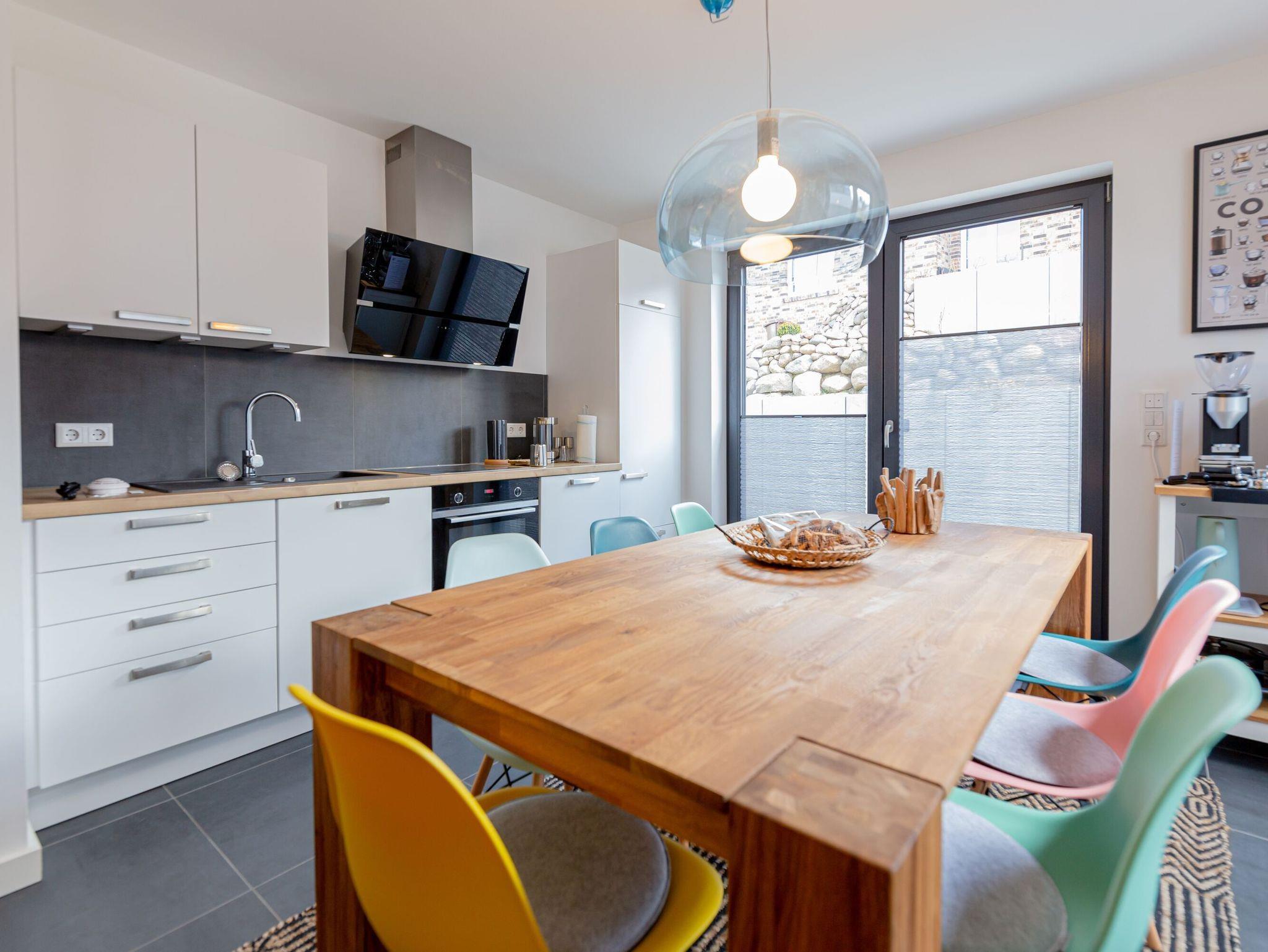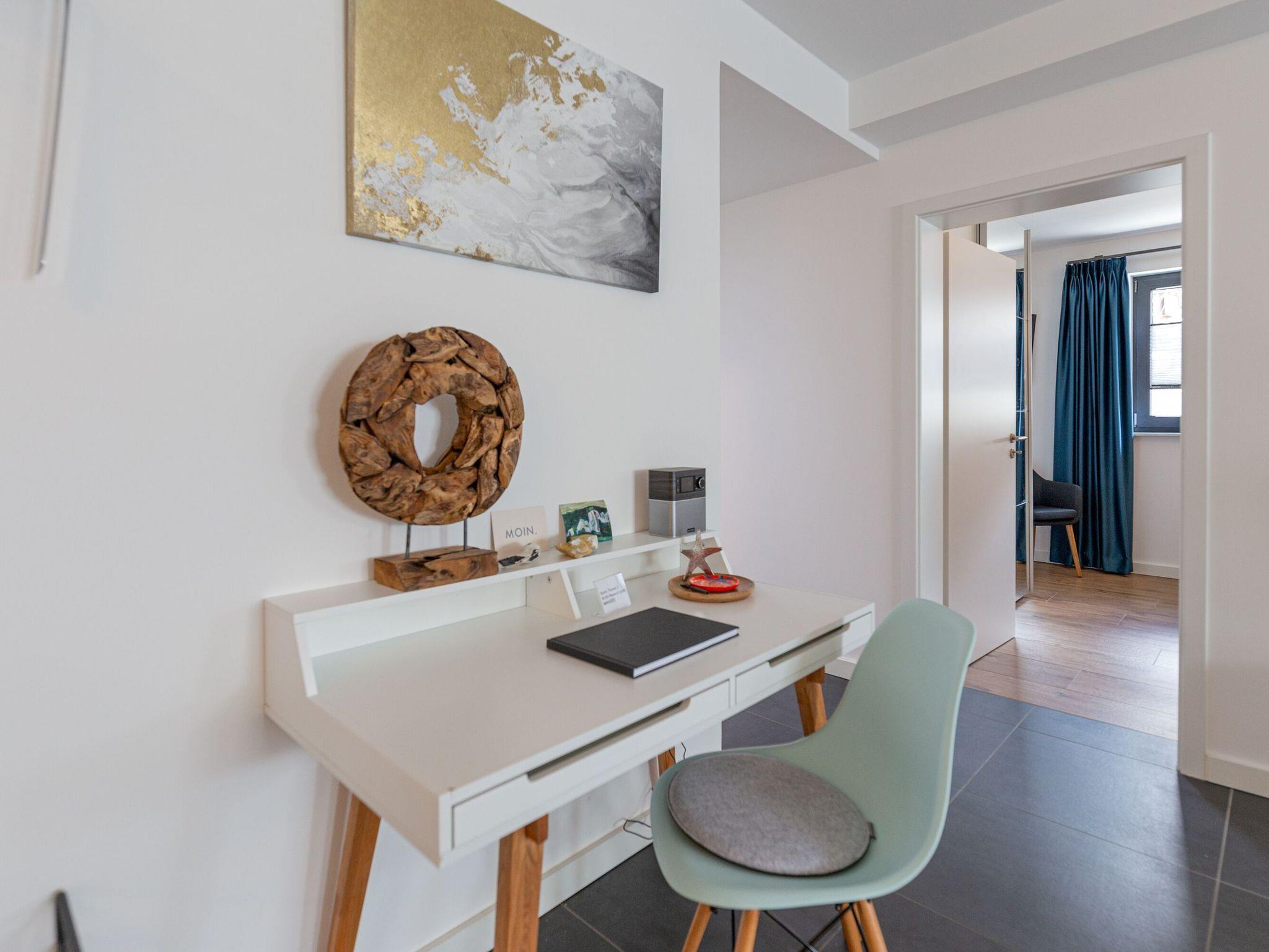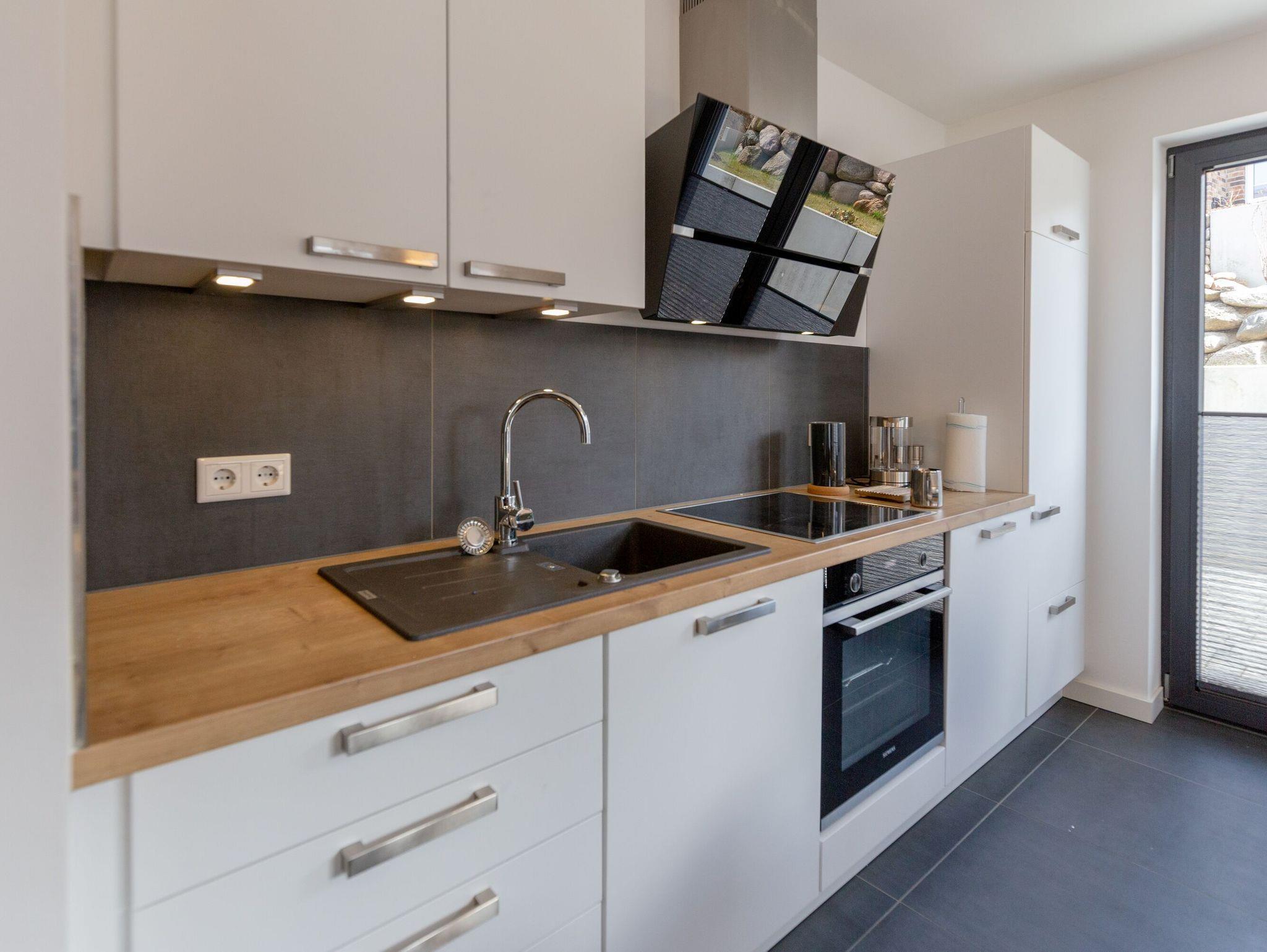 Betreten Sie die Ferienwohnung Mare, erwartet Sie eine herrlich maritime Atmosphäre zum Wohlfühlen und eine sonnige Terrasse. Der freundliche Wohnbereich verfügt über eine hochwertige, voll ausgestattete Küche mit einladendem Essbereich.