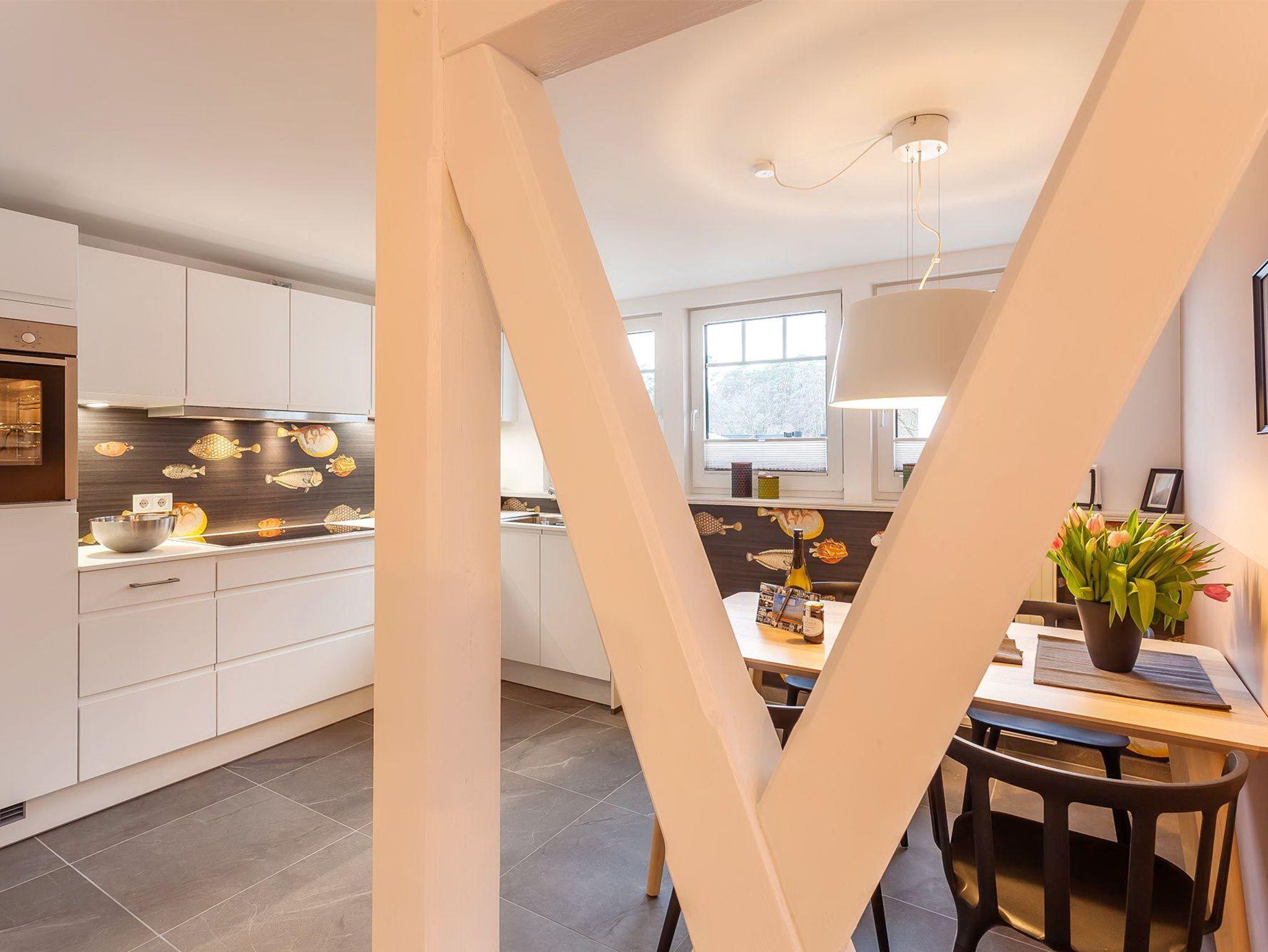Die Ferienwohnung Muschelsucher befindet sich im Obergeschoss der Villa Granitz und strahlt mit ihren Dachschrägen und der stilvoll-eleganten Einrichtung das ganz besondere Etwas aus. Mit zwei Zimmern und rund 65 Quadratmetern Wohnfläche ist sie für zwei bis maximal vier Personen geeignet. Alles wirkt sehr liebevoll arrangiert und ausgestattet, so dass man sich hier richtig wohlfühlen kann. Im kombinierten Wohn- und Schlafraum befinden sich ein Doppelbett, eine gemütliche Sitzgarnitur und natürlich ein Flachbild-TV. Auch die offene Küche fügt sich harmonisch ins Gesamtbild ein und verleitet dazu, mal wieder die Kochkünste auszuprobieren. Abgerundet wird Ihr Urlaubsdomizil in einer der schönsten Bäderstil-Villen Rügens durch ein separates Schlafzimmer mit ausziehbarem Bett sowie ein Bad mit Dusche und WC. Herzlich Willkommen!