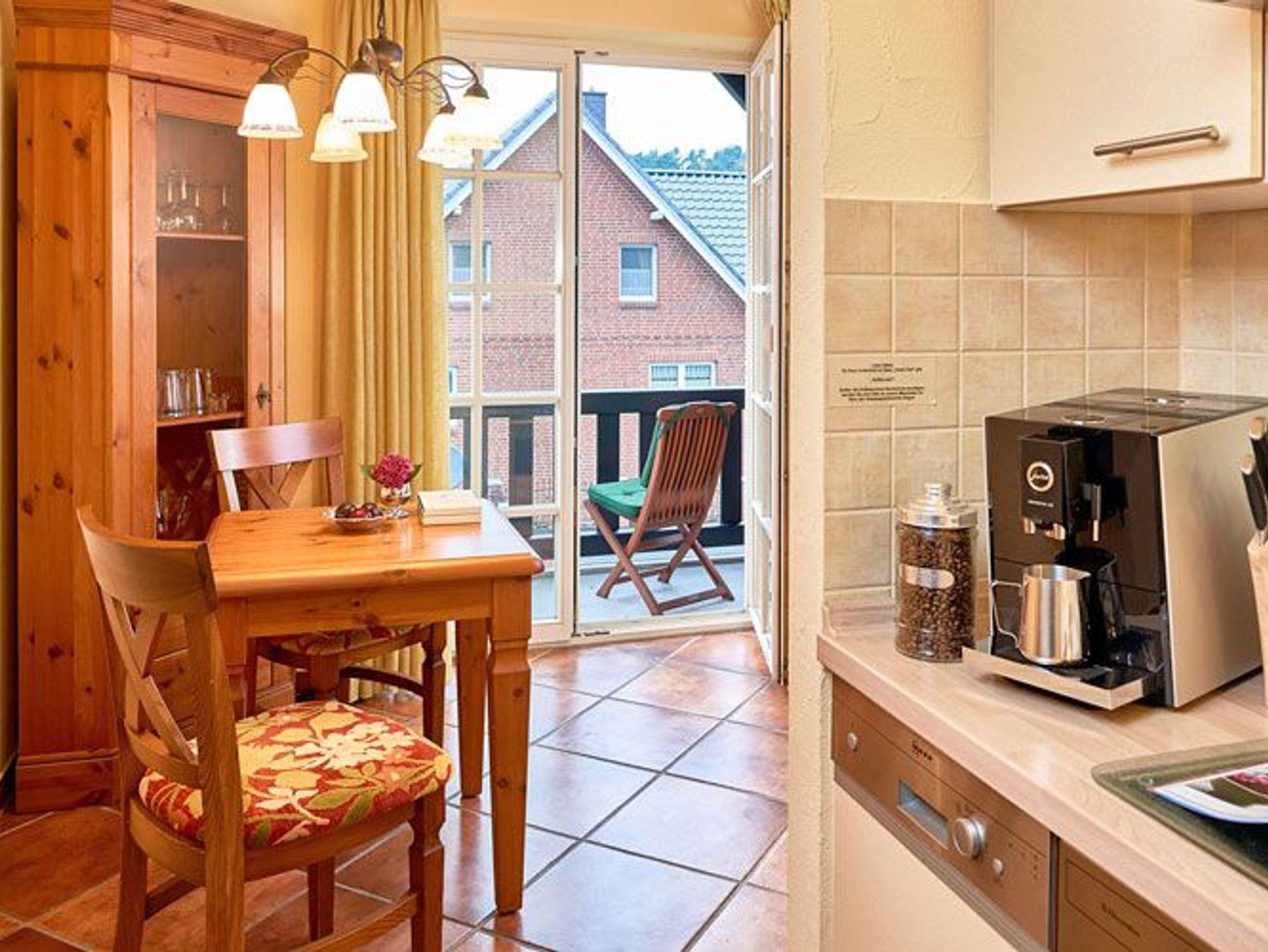 Ebenfalls ist ein Esstisch für 2 Personen vorhanden und die im Wohnraum integrierte und sehr gut ausgestattete Küchenzeile verfügt über einen Backofen, ein 4-Platten-Ceranfeld, eine Mikrowelle, eine Spülmaschine sowie einen Jura-Kaffeeautomaten (inkl. Kaffee satt).