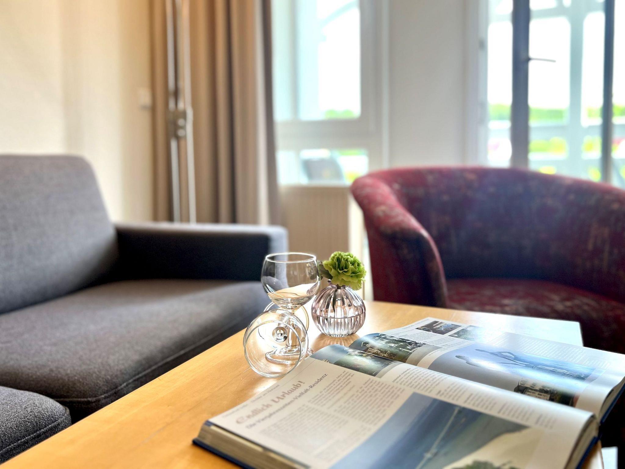 Die Ausstattung umfasst einen TV-Flachbild, eine Kaffeemaschine (Filter), eine Mikrowelle, einen Geschirrspüler und Bettwäsche ist inklusive. Die Wohnung verfügt über einen Balkon und eine offene Wohnküche. Ein Fahrradkeller steht den Gästen ebenfalls zur Verfügung. Der WLAN-Anschluss sowie ein TV mit Sky-Sendern sind ebenfalls vorhanden. Das Badezimmer ist mit einer Badewanne ausgestattet und ein Tiefgaragenstellplatz ist dazu buchbar. Auf Wunsch kann ein Brötchenservice genutzt werden.