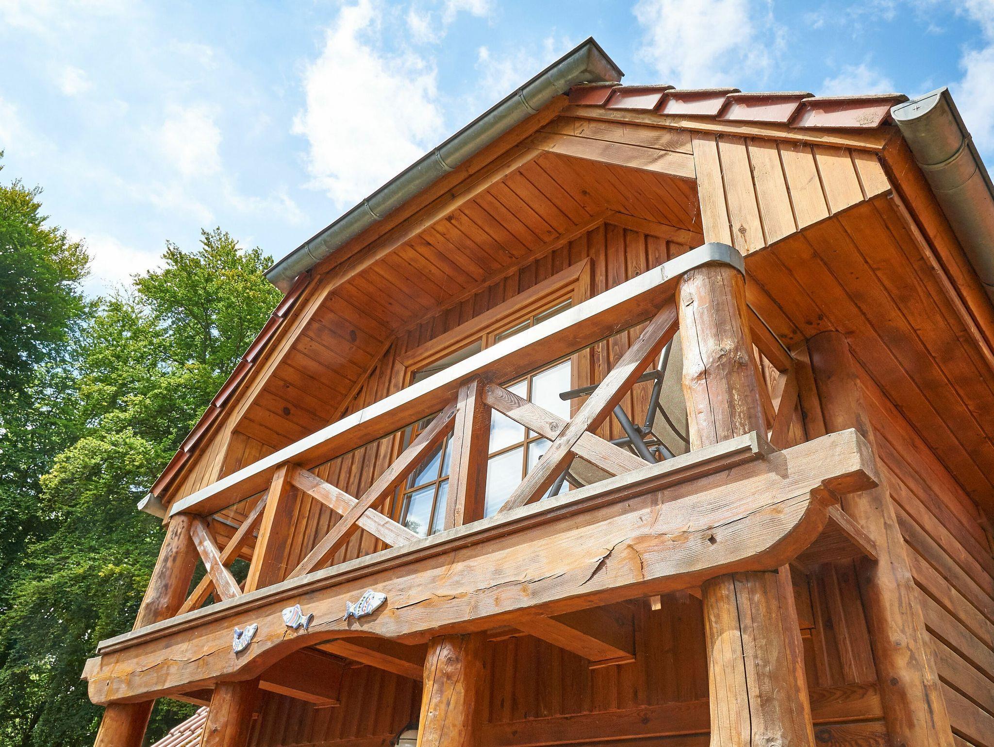 Die Haushälfte 2 erstreckt sich auf zwei Etagen über ca. 100 m² Wohnfläche und verfügt im Erdgeschoss über ein großes und funktional eingerichtetes Wohnzimmer, das durch die offenen Balken besonders gemütlich wirkt. Die Terrasse zur Westseite ist mit Sonnenliegen und Sitzgruppe ausgestattet.