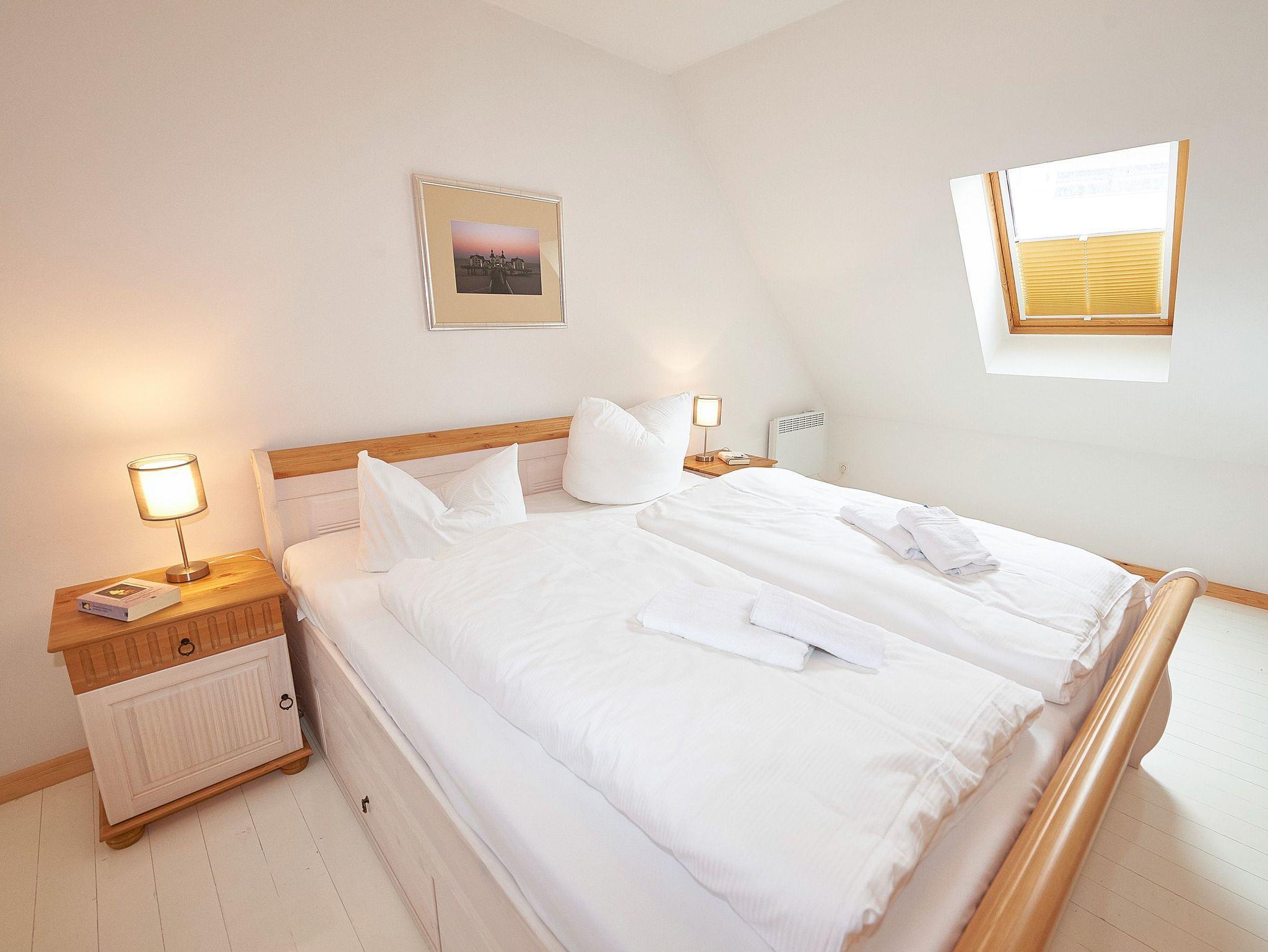 Die beiden Schlafzimmer befinden sich im Obergeschoss. Das größere ist mit einem Doppelbett und einem zusätzlichen Flachbild-TV, das kleinere mit zwei Einzelbetten und Stauraum für Ihre Garderobe ausgestattet.
