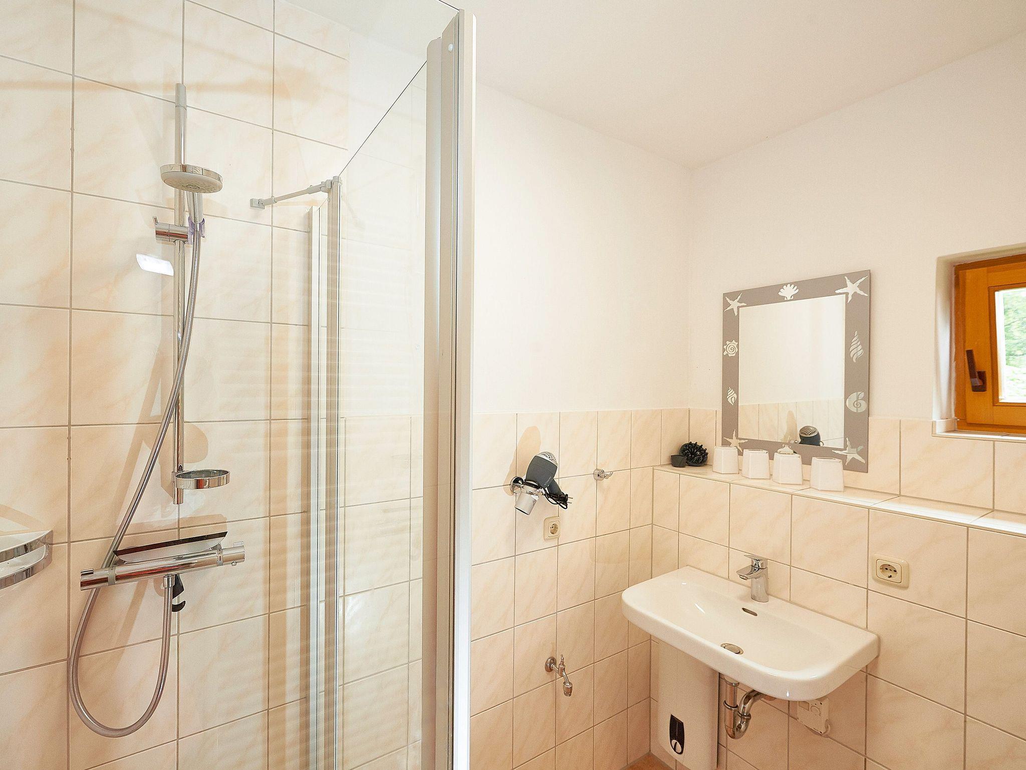 Das Badezimmer Ihrer Unterkunft befindet sich ebenfalls im Erdgeschoss und ist mit Dusche/WC, einem beheizbaren Handtuchtrockner sowie einem Waschtisch inkl. Fön ausgestattet.
