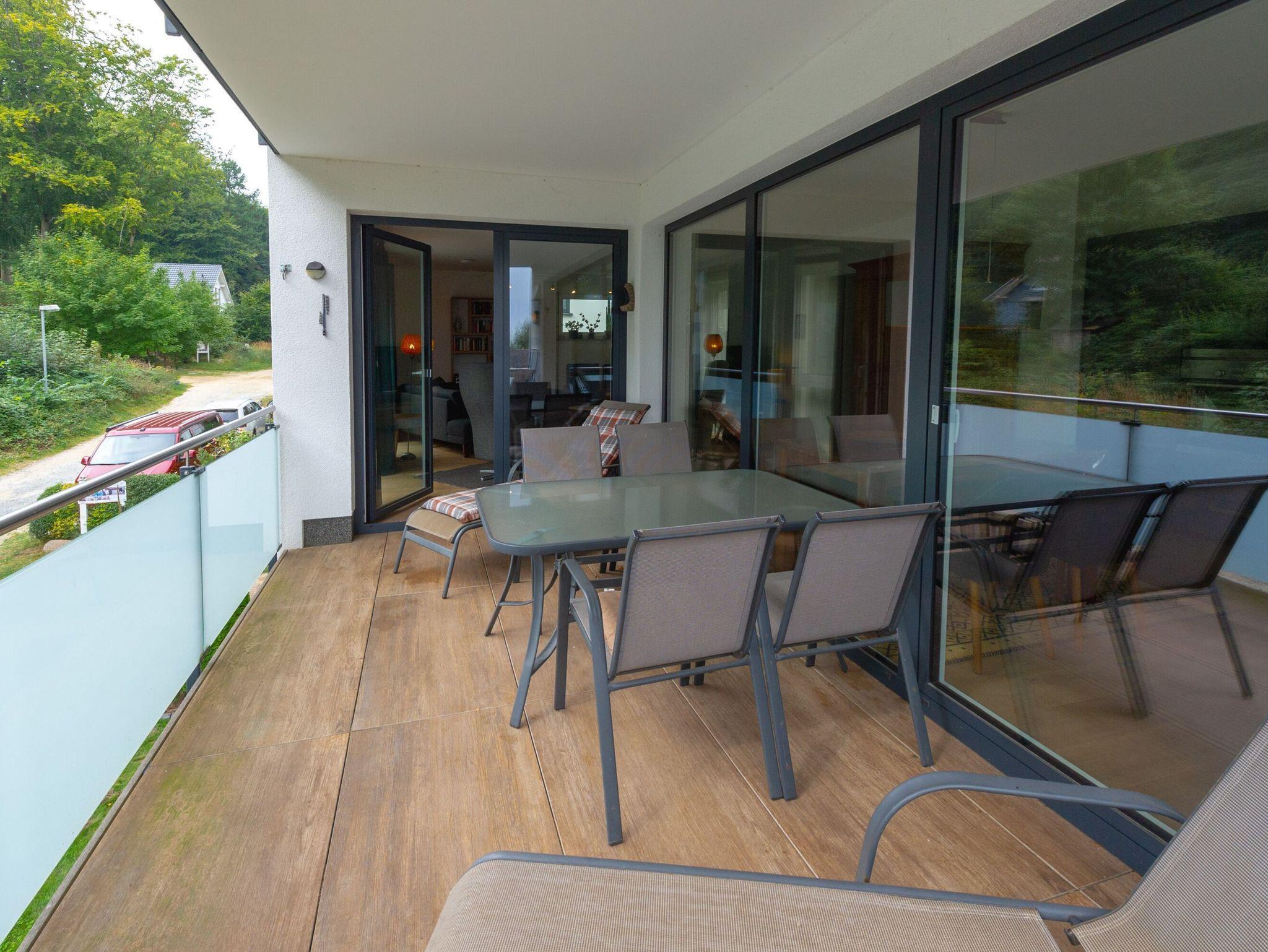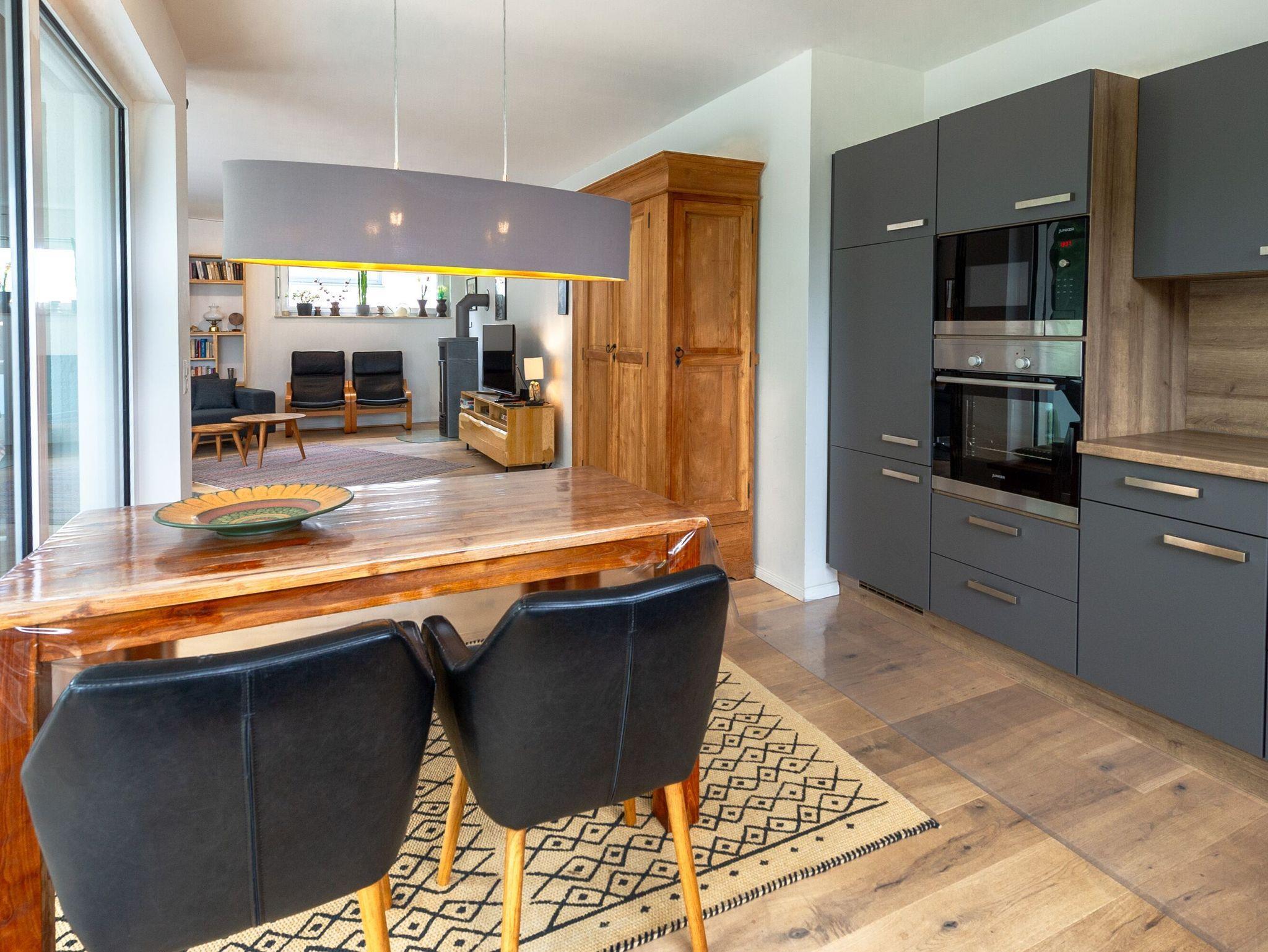 Die harmonisch in diesen Bereich integrierte Küchenzeile verfügt über ein Ceran-Kochfeld, Kühlschrank mit Gefrierfach, Backofen, Mikrowelle, Geschirrspülmaschine und diverses Kleininventar. Vom Küchen- wie auch vom Wohnbereich aus gelangen Sie auf die ca. 13m² große Südwestterrasse, ausgestattet mit Esstisch, Stühlen und 2 Liegen.