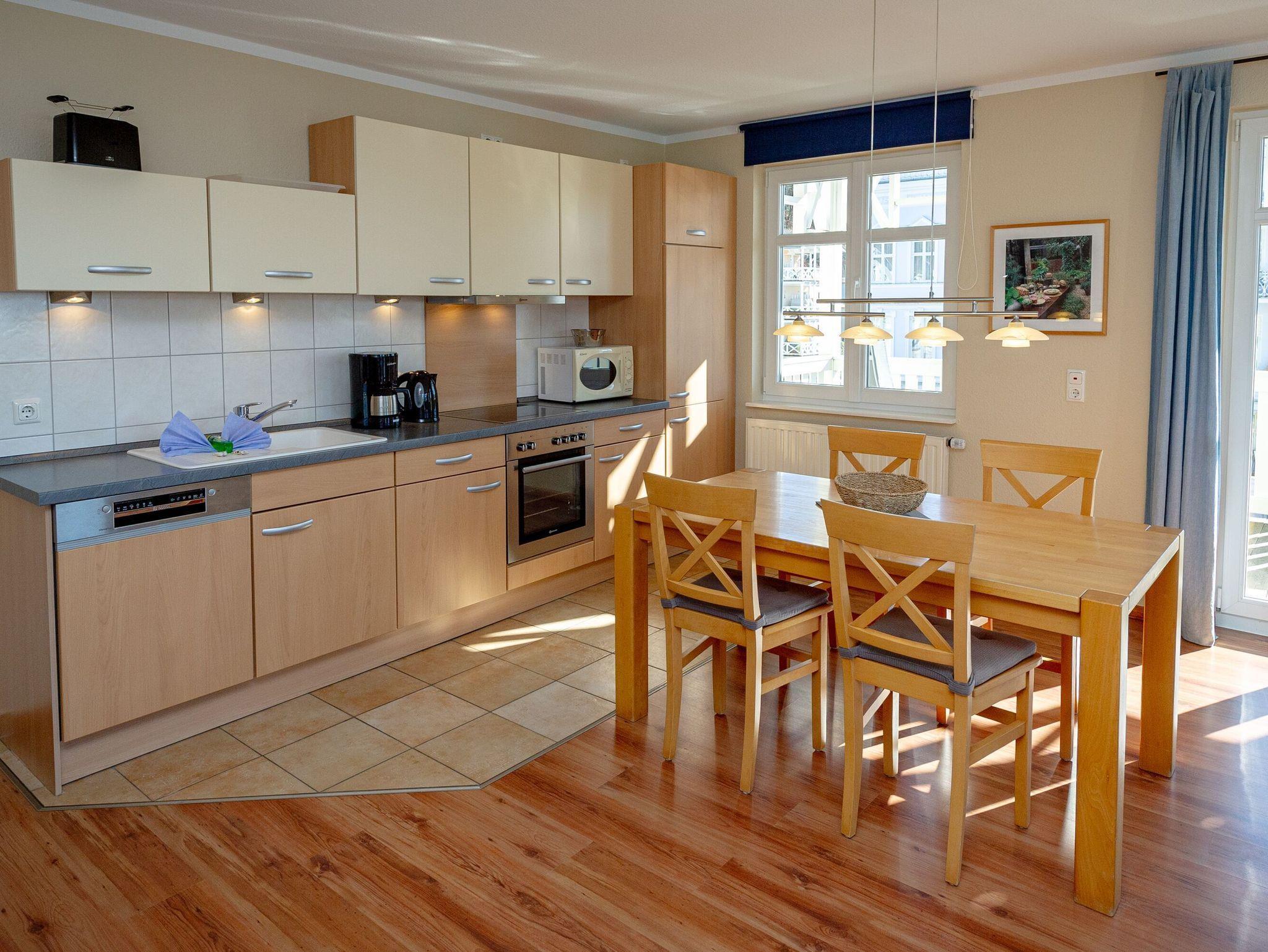 Der helle, freundliche Wohnraum ist mit einer bequemen Lederschlafcouch (die als Aufbettung für 2 Personen genutzt werden kann), 1 Sessel, 2 Korbsesseln, einem Flachbild-TV, einer Mini-Stereoanlage mit CD-Player und einem Esstisch eingerichtet. Die harmonisch in den Wohnbereich integrierte Küchenzeile ist ausgestattet mit einem Kühlschrank mit Gefrierfach, einem 4-Platten-Cerankochfeld, einem Backofen, einer Geschirrspülmaschine, einer Mikrowelle, Wasserkocher, Kaffeemaschine, Toaster und diversem Kleininventar, das die Küchenausstattung komplettiert.