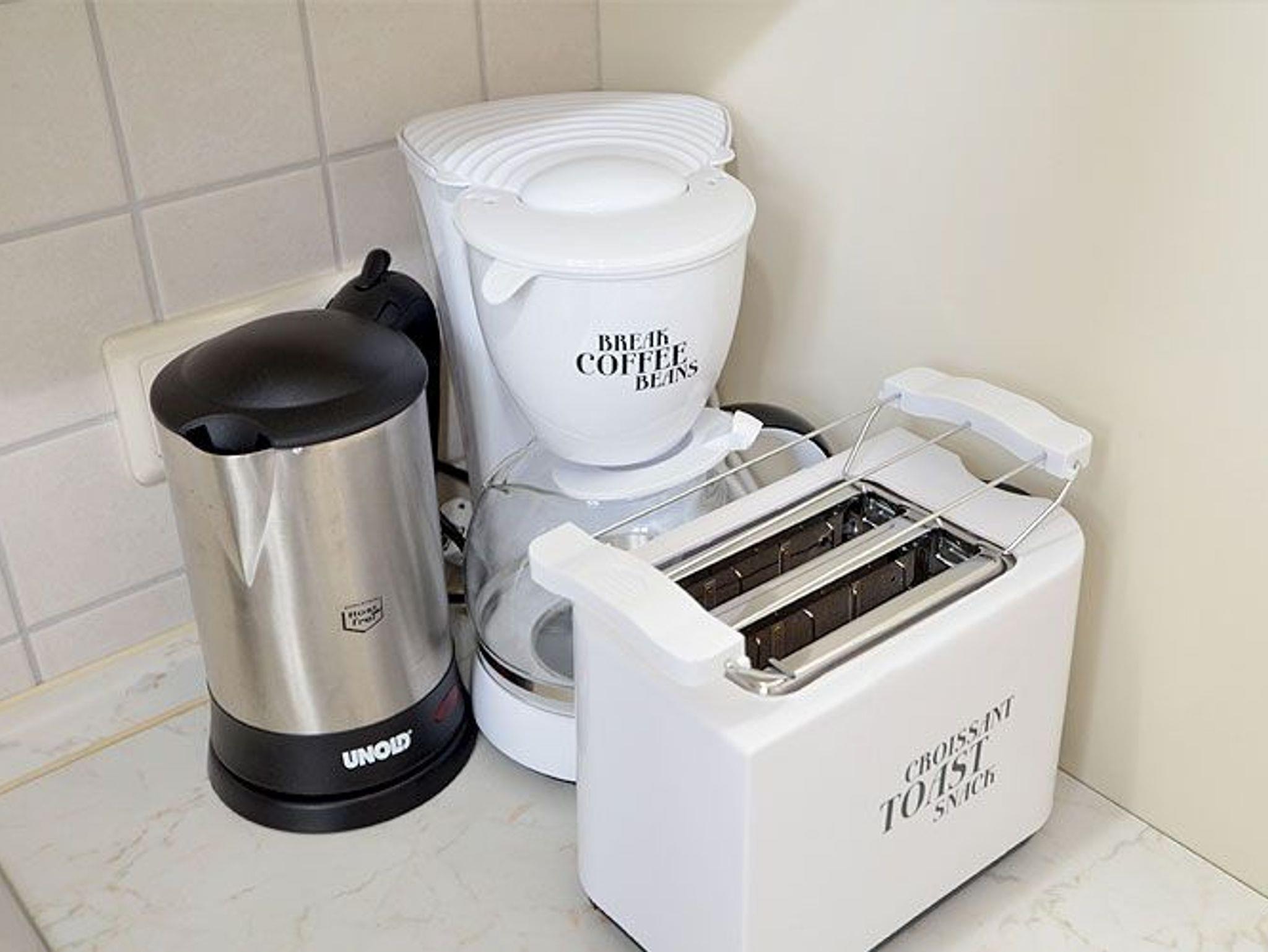 In der separaten Küche mit einem Esstisch für zwei Personen finden Sie u.a. einen Kühlschrank mit Gefrierfach, einen 4-Platten-Ceranherd, eine Spülmaschine, eine Mikrowelle mit Grillfunktion und diverses Kleininventar, das die Küchenausstattung komplettiert.