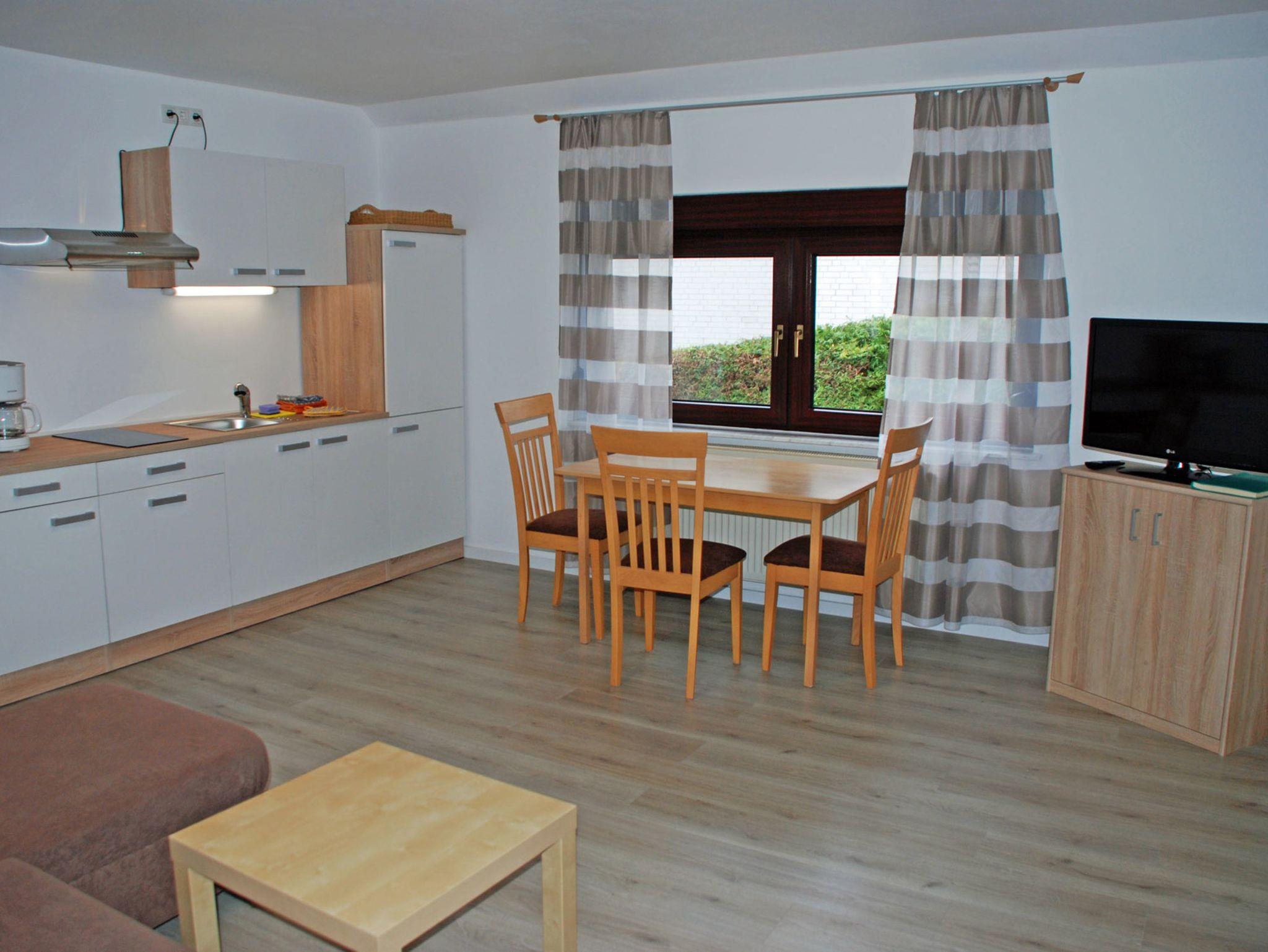 Im Wohnzimmer gibt es eine Sitzcouch mit Tisch, eine Lesestehlampe und ein Flachbild-TV. Hier steht auch ein Esstisch mit Stühlen. Die moderne Küche verfügt über eine Spüle, einen 2-Cerankochfeldherd, Kaffeemaschine und Wasserkocher sowie einen Kühlschrank.