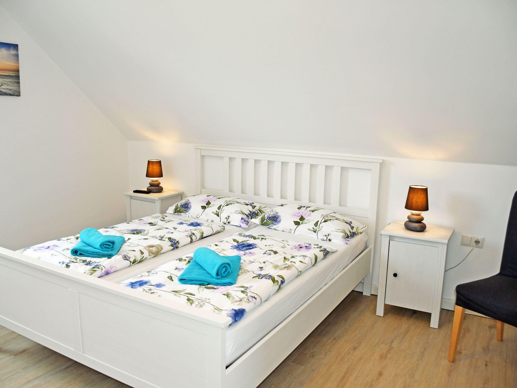 Über eine Holztreppe erreicht man das Obergeschoss. Hier befinden sich die zwei großen Schlafzimmer mit jeweils großem Doppelbett bzw. 2 Einzelbetten mit Nachtkästen, Weckradio und geräumigen Spiegelschrank. Im Obergeschoss liegt auch das zweite Bad mit Dusche, WC und Waschtisch, es verfügt über Tageslicht.