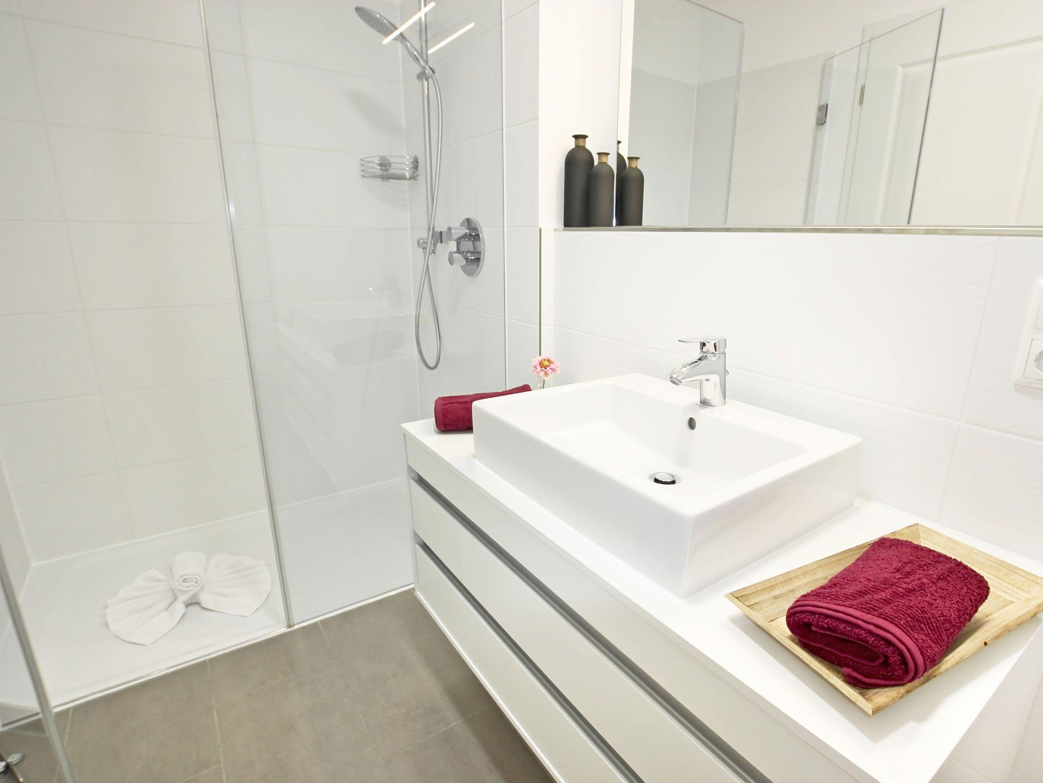 Die zwei Bäder im Appartement sind jeweils mit einer geräumigen Glasdusche, einem großen Waschtisch mit geräumigem Unterschrank und einem Handtuchheizkörper ausgestattet.
