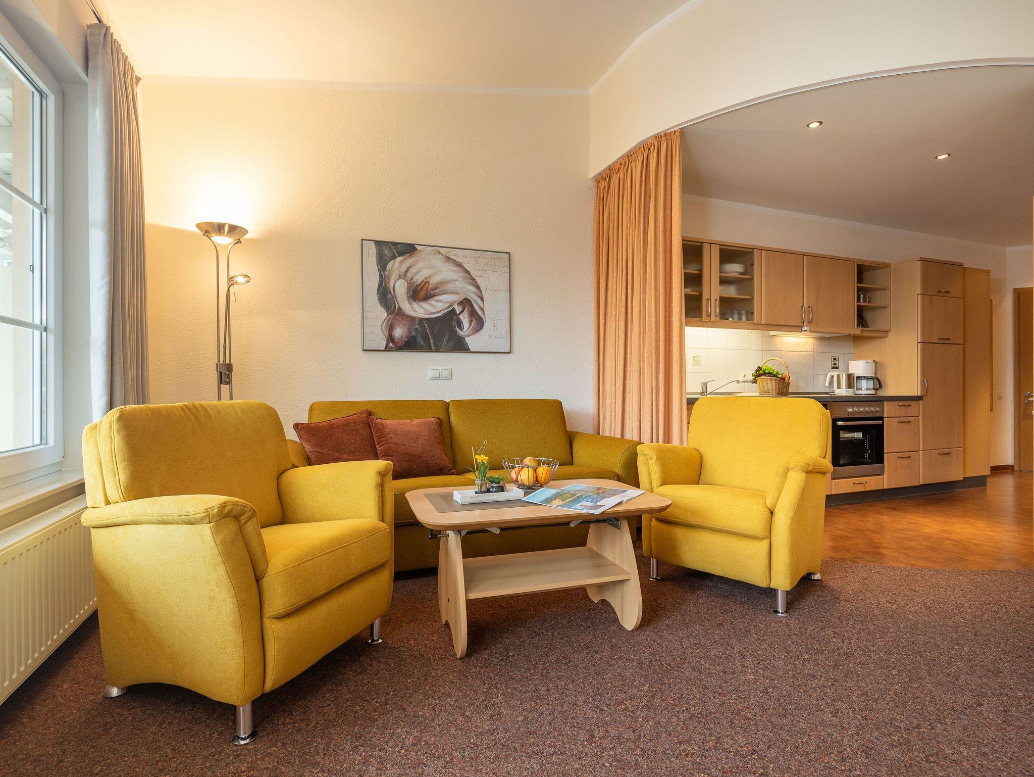 Die freundlich eingerichtete Wohnung 15 in der Ferienanlage Margaretha ist ca. 58 m² groß und für bis zu 4 Personen ausgelegt.