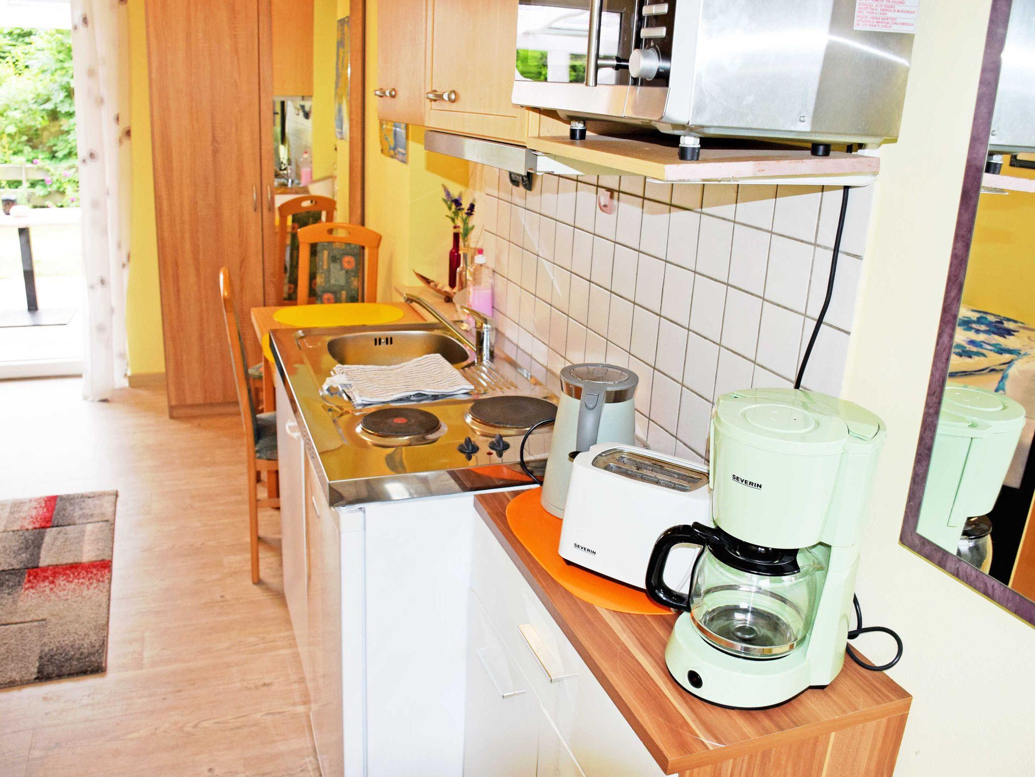 Die kleine Pantryküche ist mit einem Herd, Wasserkocher, Kaffeemaschine, Toaster und Kühlschrank komplett ausgestattet.