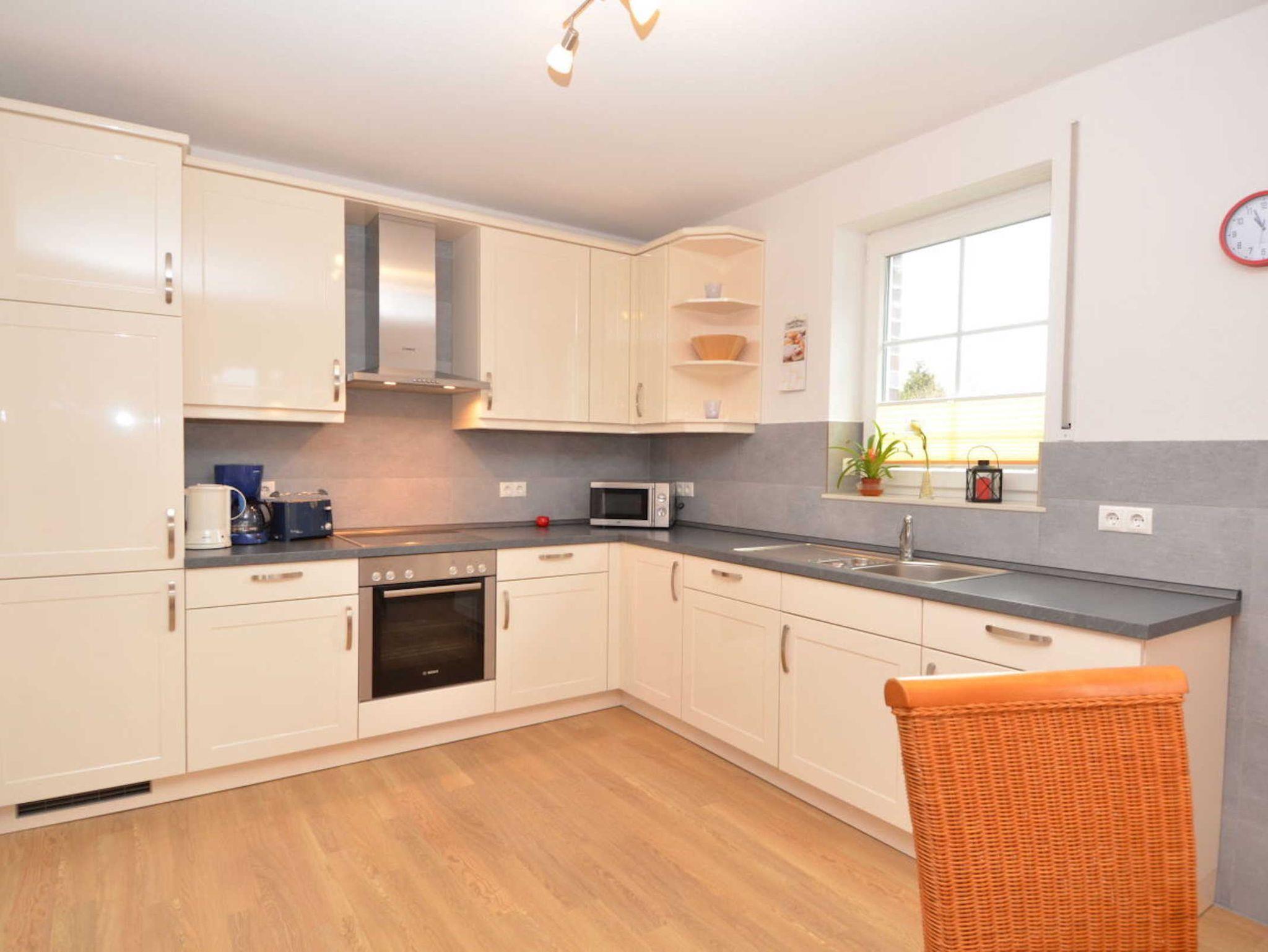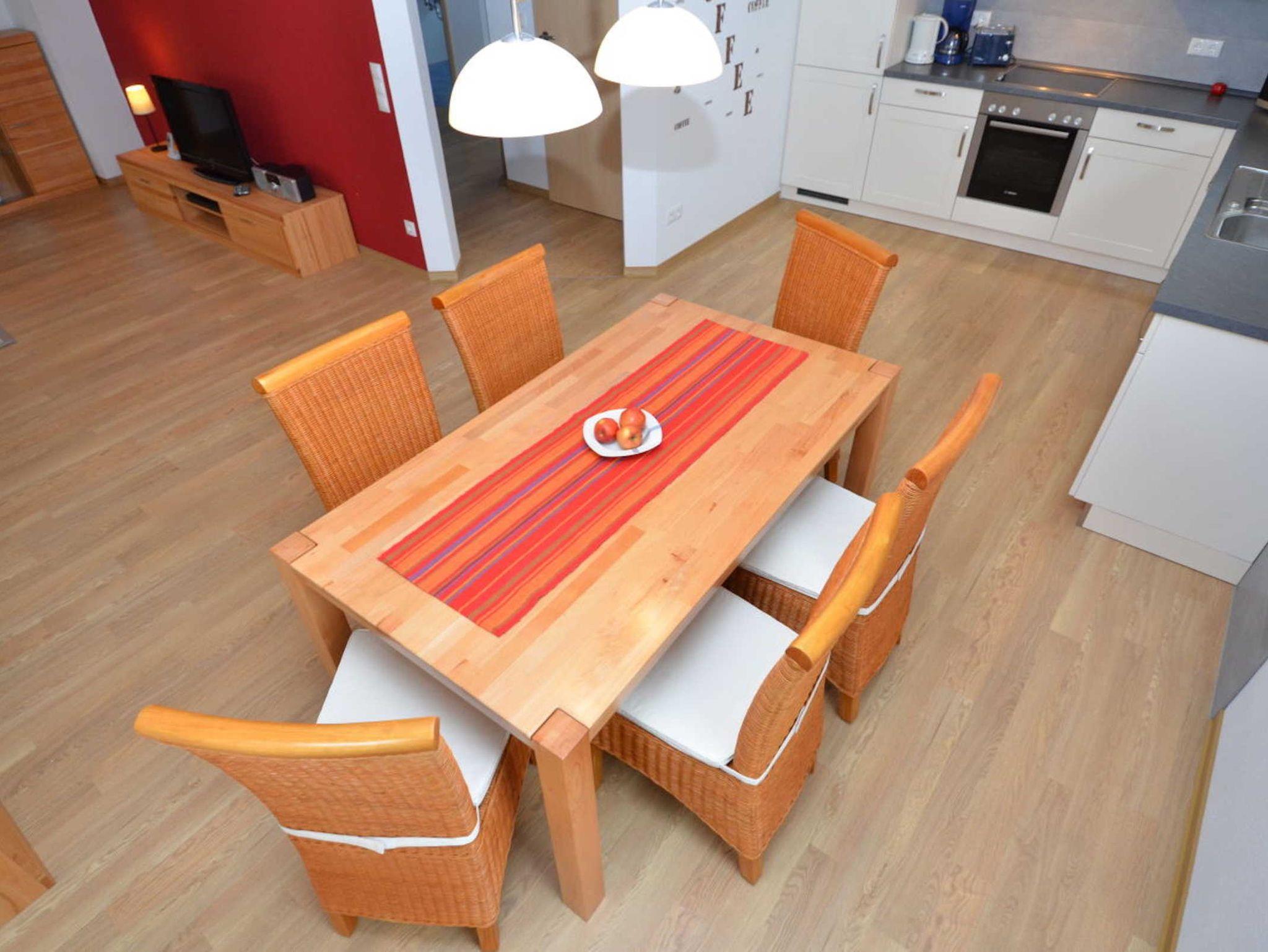 Das 3-Raum-Appartement mit ca. 90 qm Wohnfläche befindet sich im EG des Hauses. Der große, offene, lichtdurchflutete Wohn-/Essbereich ist ausgestattet mit einer gemütlichen Couchgarnitur (eine Aufbettung ist hier für eine 5. und 6. Person auf Anfrage möglich), einen LCD-TV, Bluray-Player und einer Stereoanlage. Die im Wohnbereich harmonisch integrierte Küchenzeile verfügt über einen Kühl-/Gefrierschrank, Cerankochfeld, Backofen, Spülmaschine, Mikrowelle, Kaffeemaschine, Wasserkocher, Toaster, Handmixer und div. Kleinutensilien. 2 Schlafzimmer mit je 1 Doppelbett bieten ausreichend Stauraum für Ihre Garderobe. Eines der Schlafzimmer verfügt über einen LCD-TV. Das Bad ist mit einer bodengleichen Dusche, 2 Waschbecken und WC ausgestattet. Die bestuhlte, teilweise überdachte Terrasse mit Strandkorb ist zur Südseite ausgerichtet.