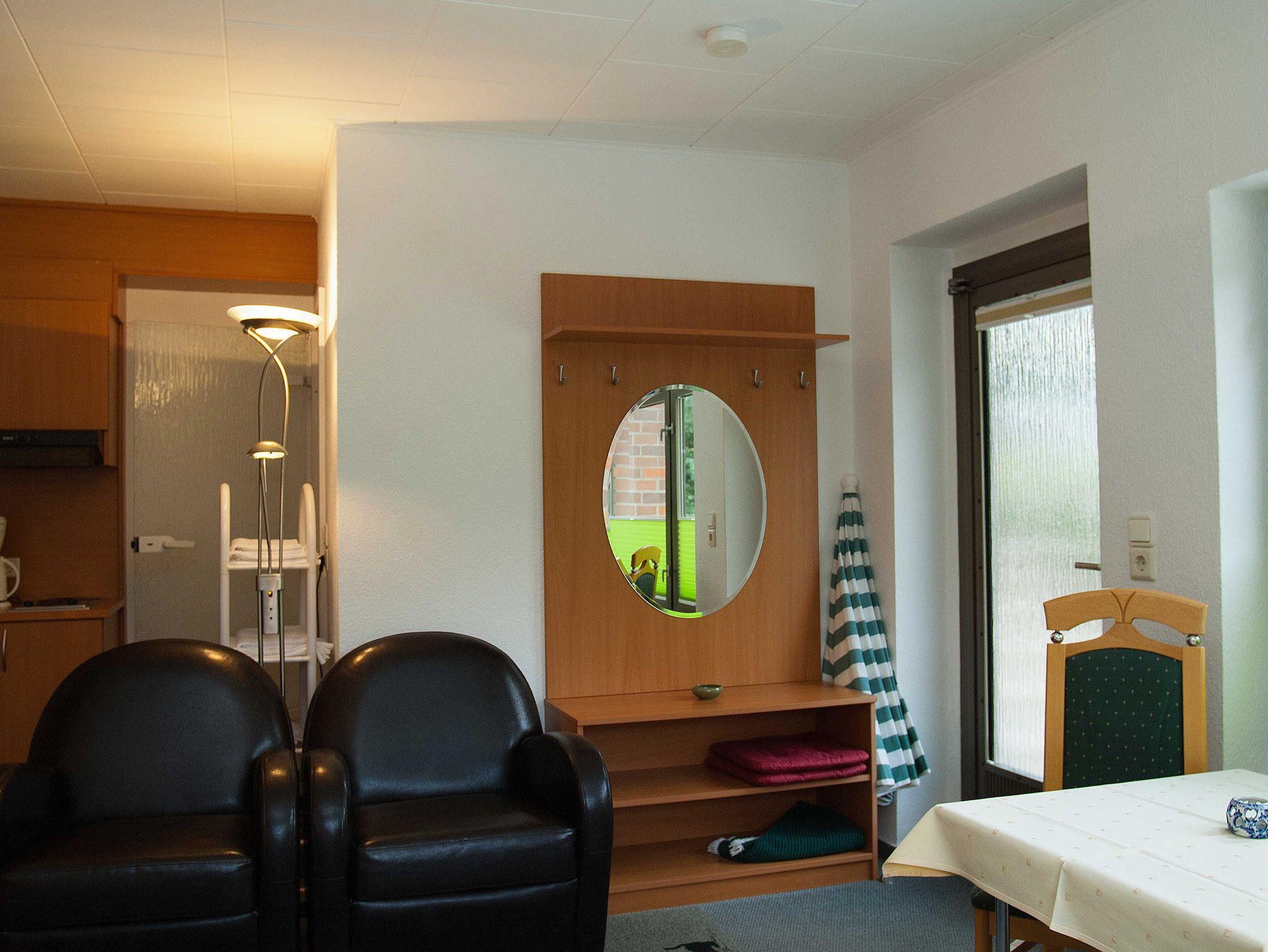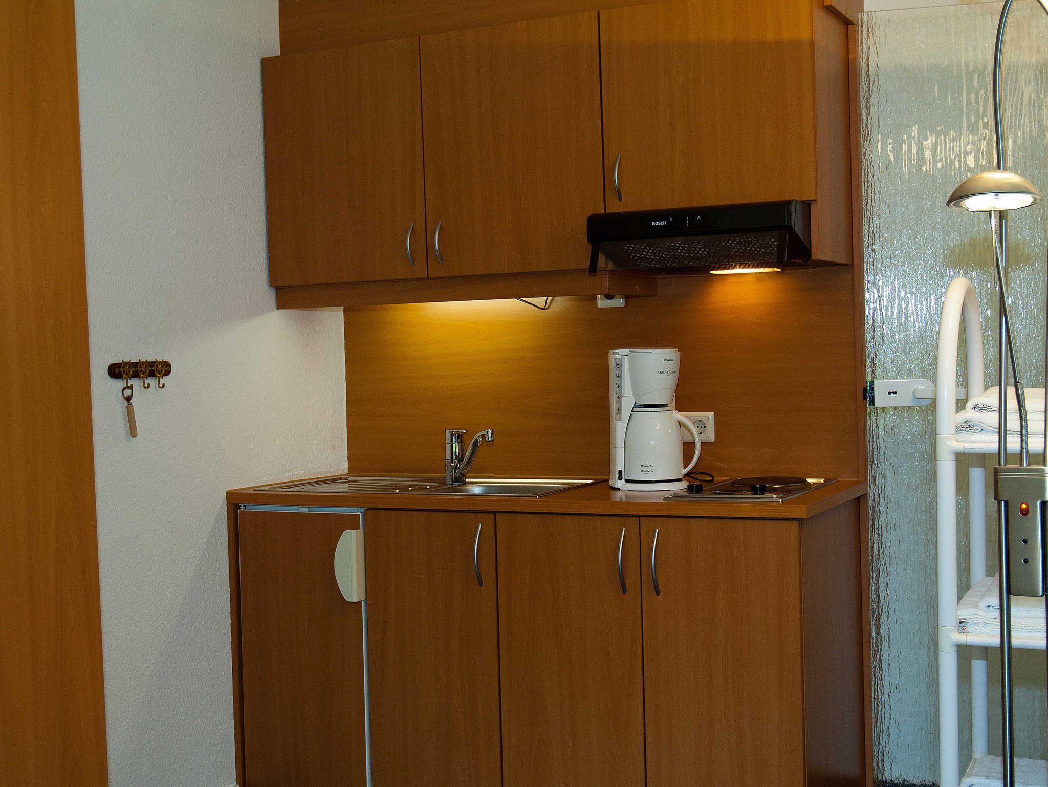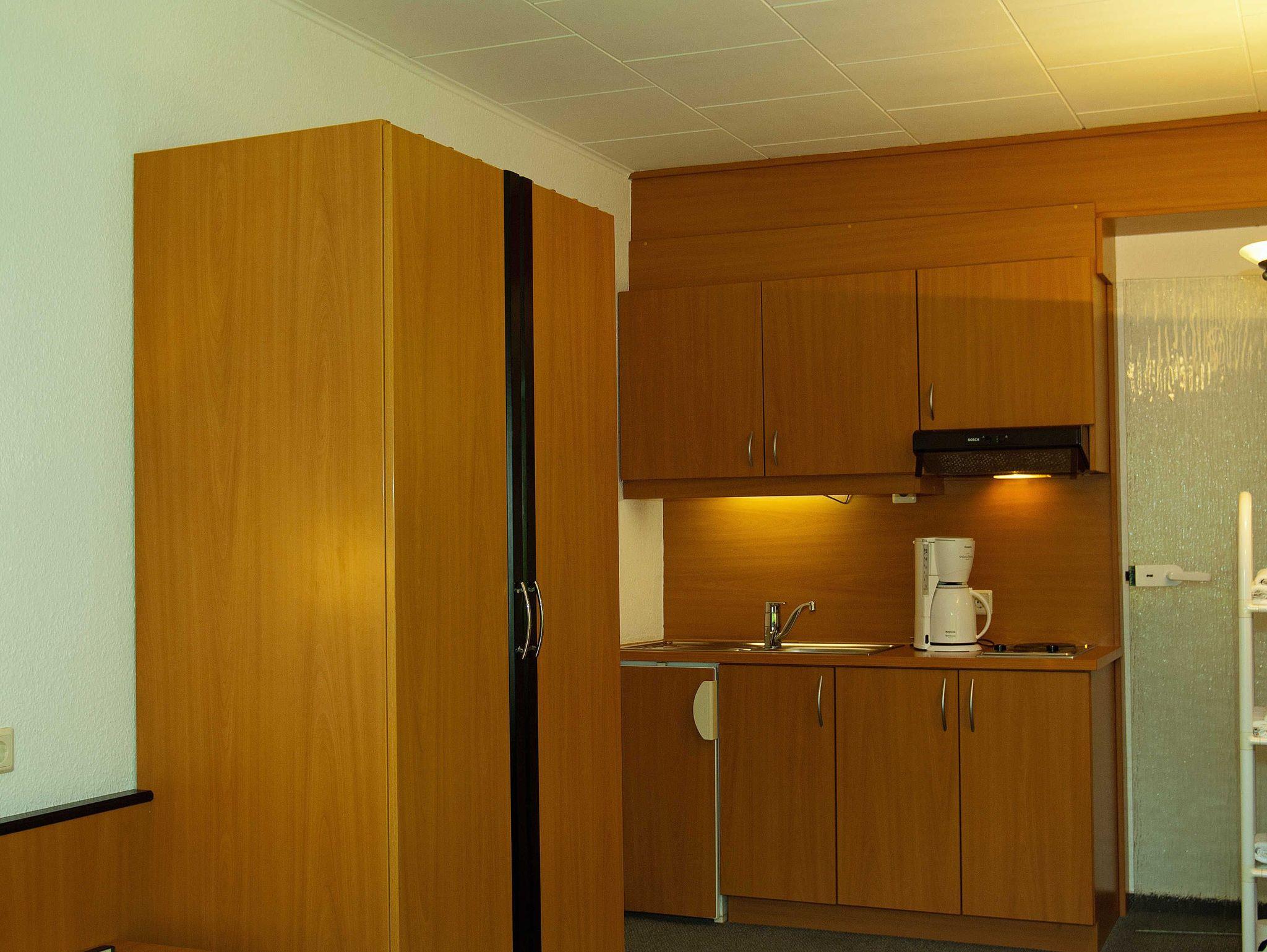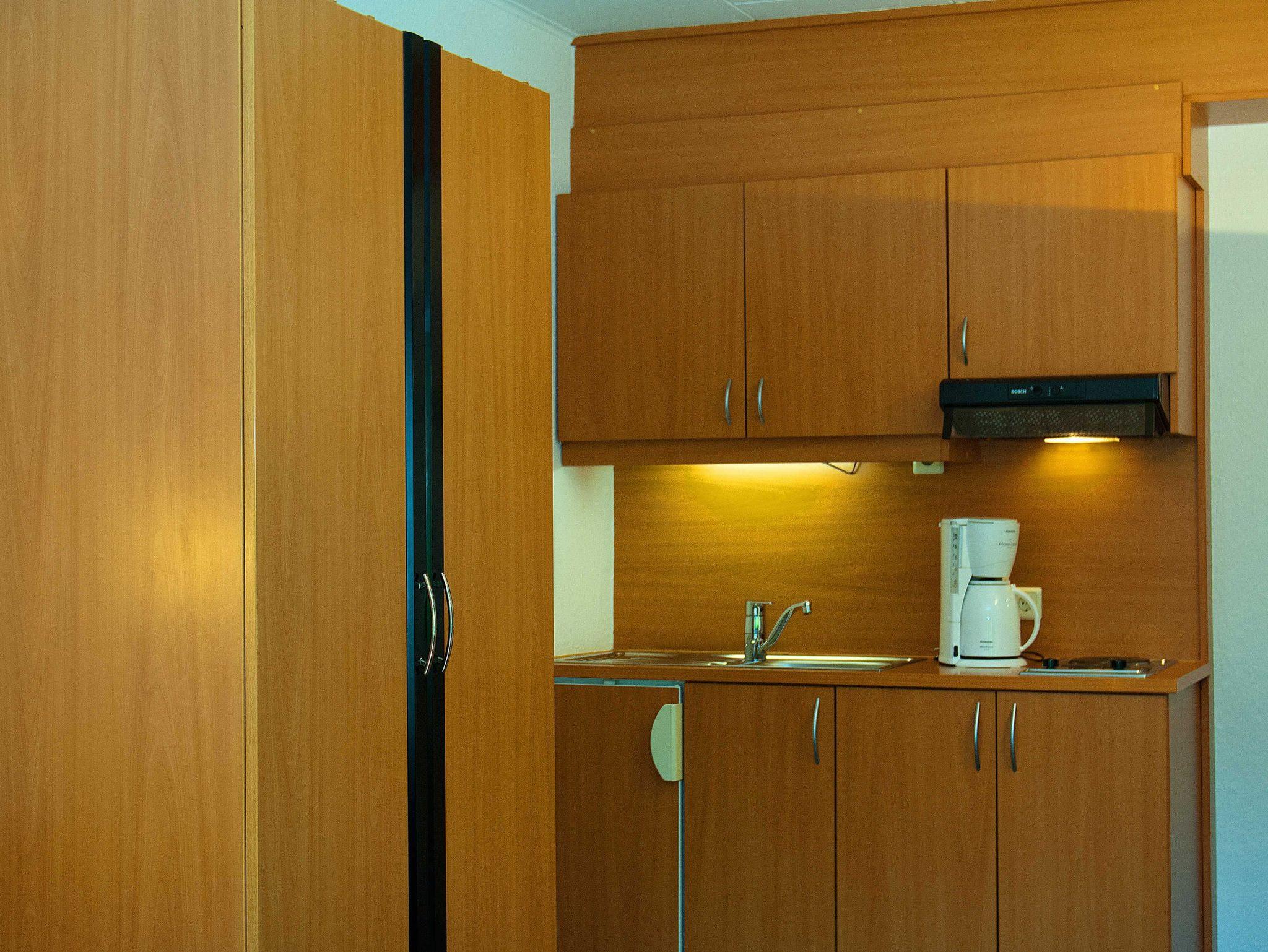 Dieses Doppelzimmer „Ostsee“ (25m²) hat eine kleine Küchenzeile. Im Wohnbereich befindet sich ein Schrank, ein kleiner Tisch mit je zwei Stühlen und ein Doppelbett (2 m x 1.80 m). Die kleine Küche ist mit Kühlschrank (ohne Gefrierfach) und 2-Platten-Ceranfeld (ohne Backofen), ausgestattet. Kochutensilien, Kaffeemaschine, Eierkocher, Wasserkocher, ein Toaster, ausreichend Geschirr und Besteck, sind ebenso vorhanden.