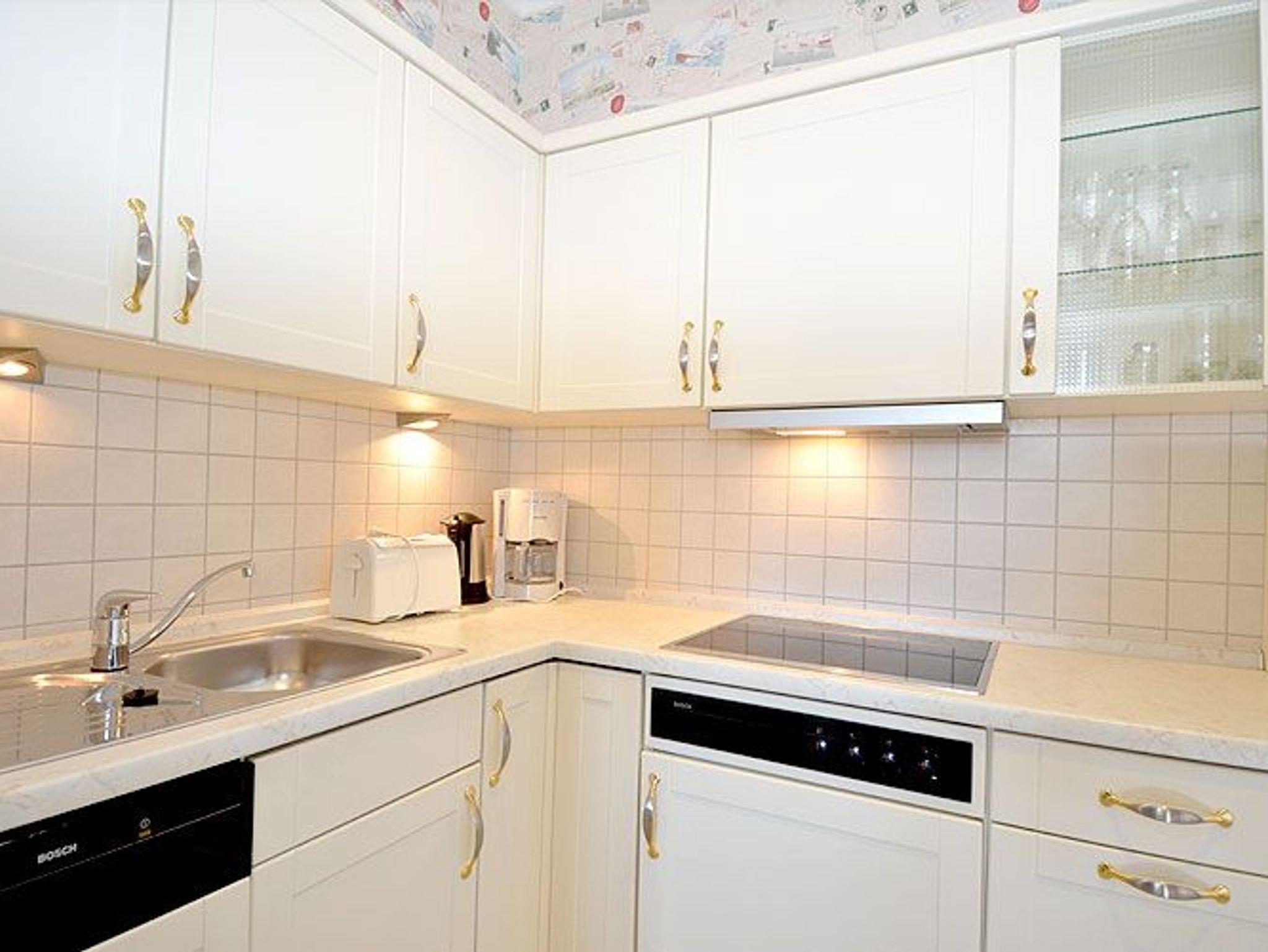 Die separate Küche ist ausgestattet mit einem Kühlschrank mit Gefrierfach, einem 4-Platten-Ceranfeld, einer Spülmaschine, einer Mikrowelle mit Grillfunktion und diversem Kleininventar, das die Küchenausstattung komplettiert.