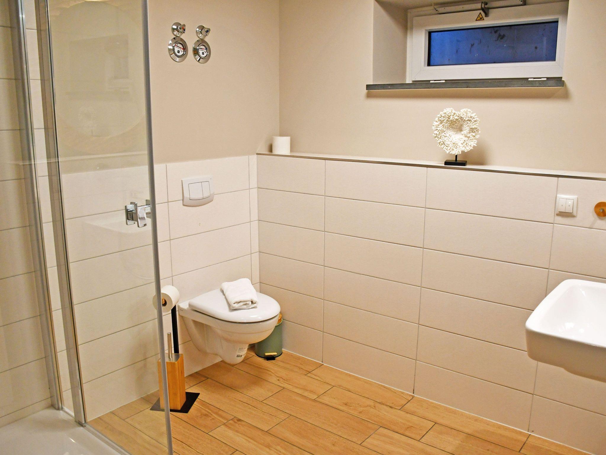 Das Bad ist mit Dusche und WC ausgestattet und verfügt über Tageslicht.