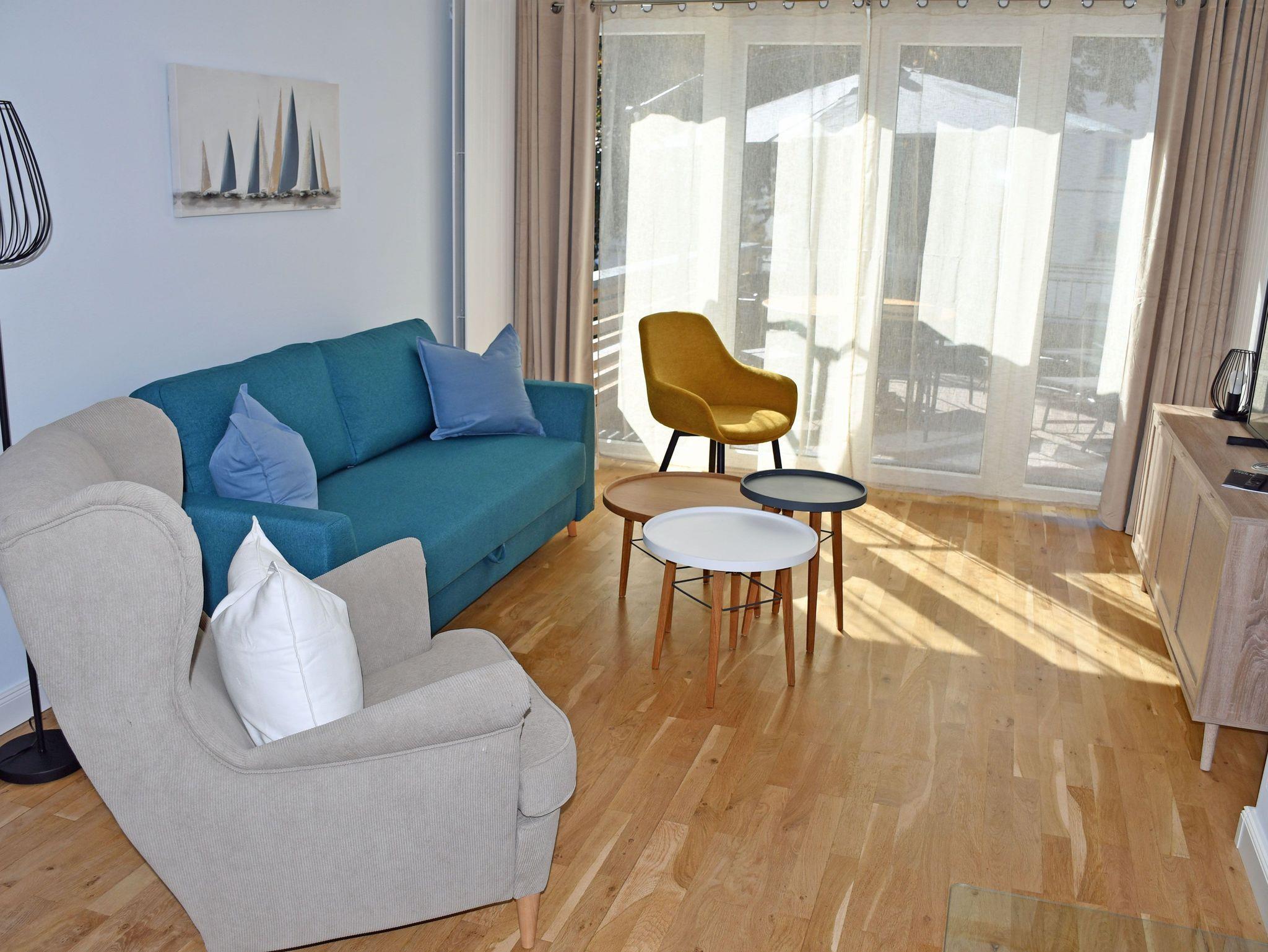 Das Wohnzimmer verfügt über einen Flachbild-TV, eine Sitzcouch, Sessel, Tisch, eine Essecke und eine Schlafcouch (1,60 m). Ein kleiner Kaminofen wird die Attraktivität der Ferienwohnung besonders in der dunklen Jahreszeit erheblich steigern. Auf der Schlafcouch können zwei Aufbettungen hergestellt werden.