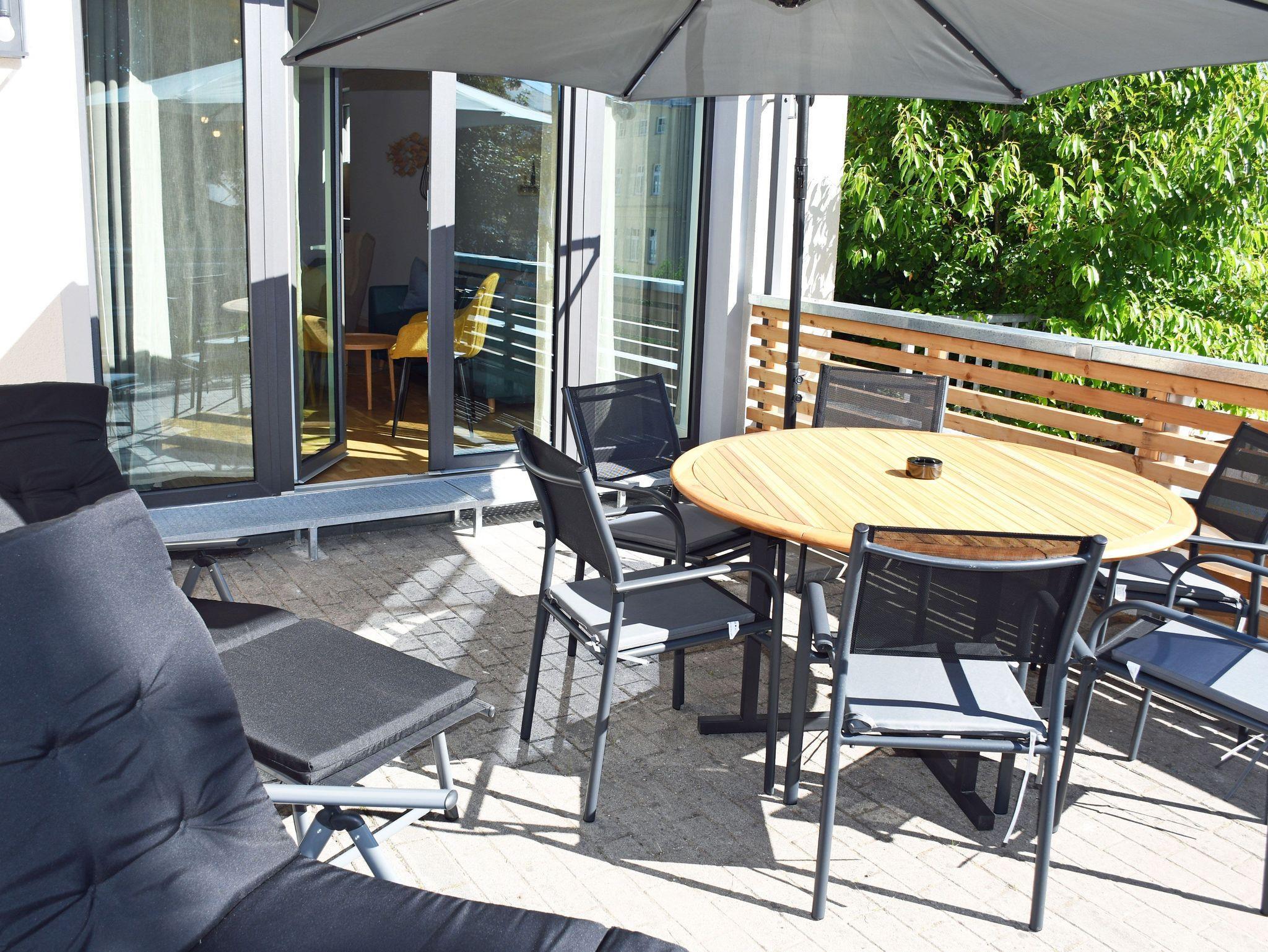 Direkt vom Wohnzimmer gelangen Sie zur Terrasse mit Gartenmöbeln die Richtung Süd-West gelegen ist.