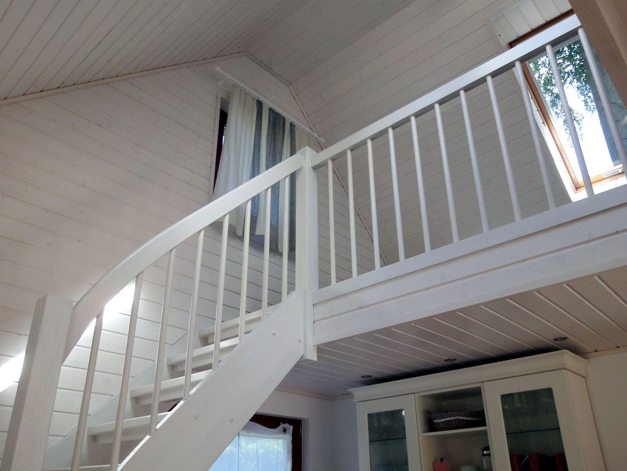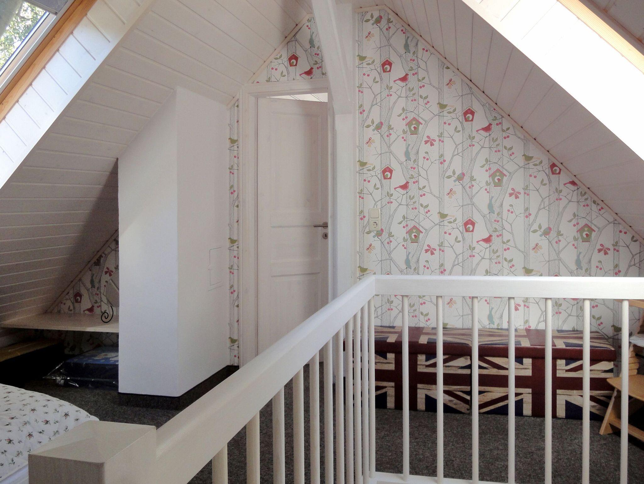 Im Obergeschoss warten unter leichten Dachschrägen ein Schlafzimmer mit einem Doppelbett (180x200 cm), Fernseher und freistehender Badewanne sowie die offene Galerie mit einem weiteren Doppelbett (180x200cm) auf Sie. So ist das Ferienhaus Rotkäppchen für zwei Erwachsene und zwei Kinder ideal, kann aber natürlich auch mit 4 erwachsenen Personen gebucht werden.