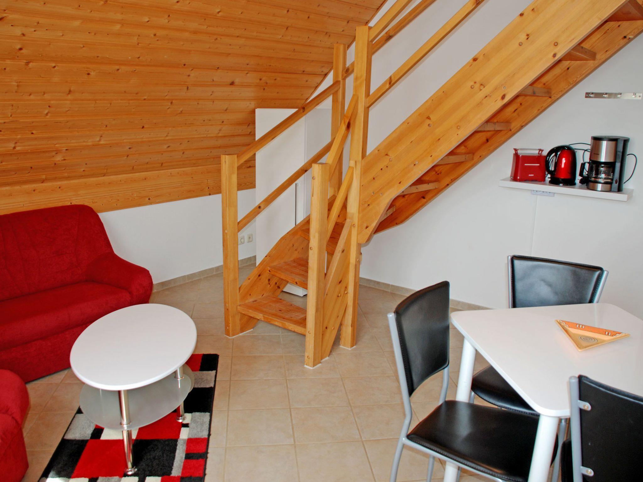 Diese modern eingerichtete Ferienwohnung liegt im Obergeschoss und bietet auf 42 qm Platz für max. 4 Gäste und hat Internet WLAN. Über den separaten Eingang in Hausflur gelangen Sie in den Flur mit Garderobe und Kleiderschrank. Im gemütlichen Wohnzimmer stehen eine Polstersitzgruppe mit Tisch und Sesseln und ein Schrank mit TV - Gerät. Hier steht auch ein Esstisch mit Stühlen. Im ersten Schlafzimmer stehen ein bequemes Doppelbett (durchgehende Matratze) mit Nachttischen und Leselampen sowie ein Kleiderschrank. Über eine Holztreppe im Wohnbereich gelangt man in den ausgebauten Dachboden, hier stehen zwei Einzelbetten mit Leselampen und zwei kleine Schränke.