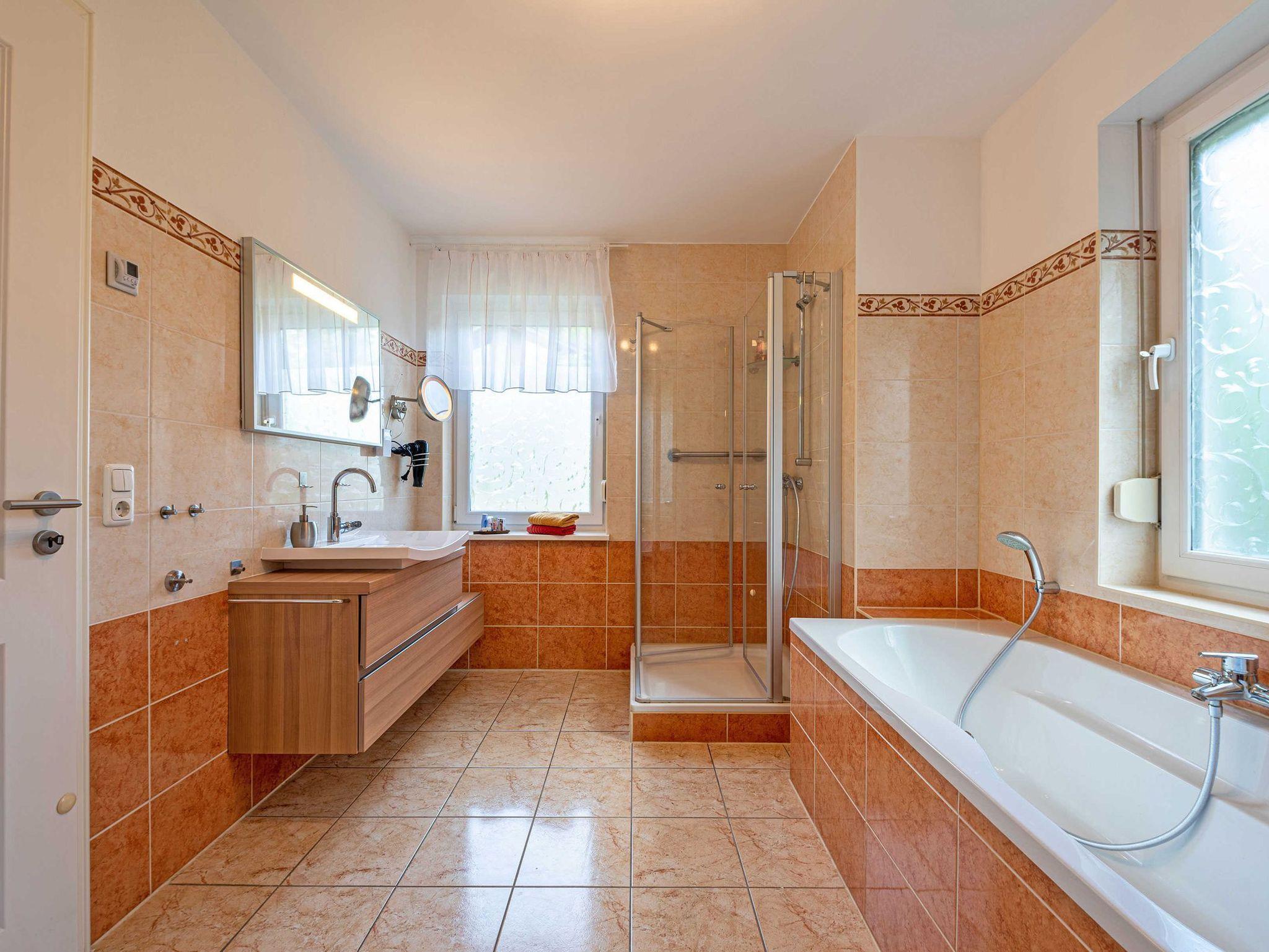 Im Erdgeschoss steht Ihnen ein großzügiges Duschbad mit separater Badewanne zur Verfügung, im Obergeschoss gibt es ein weiteres Duschbad.