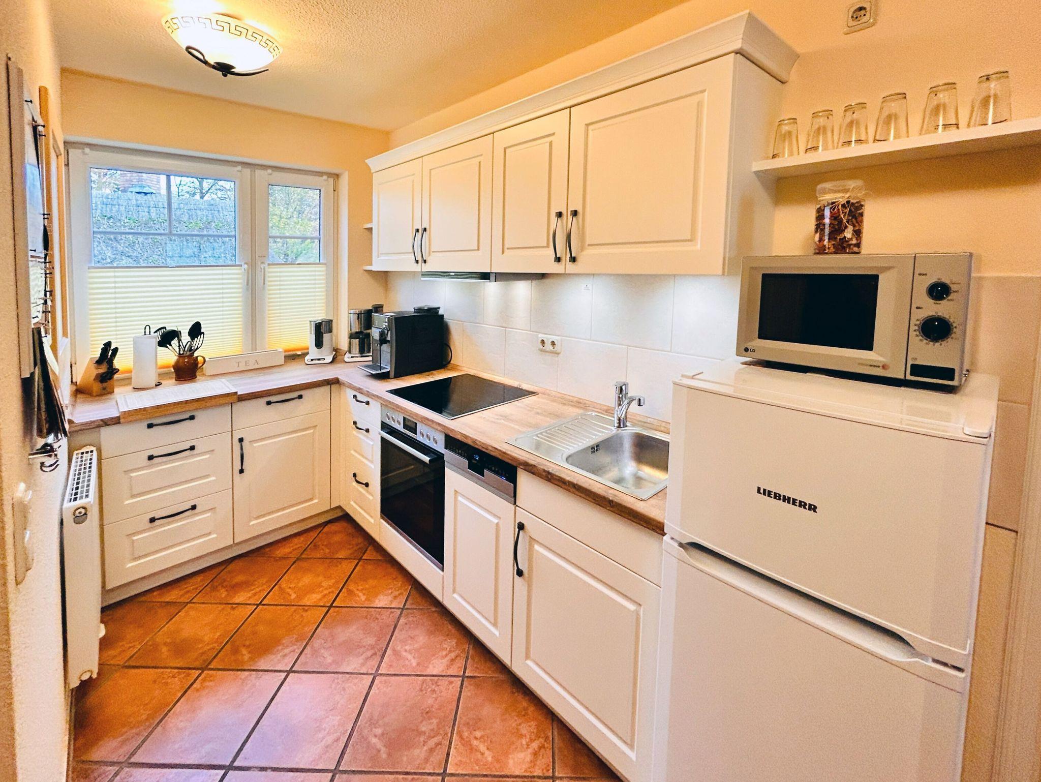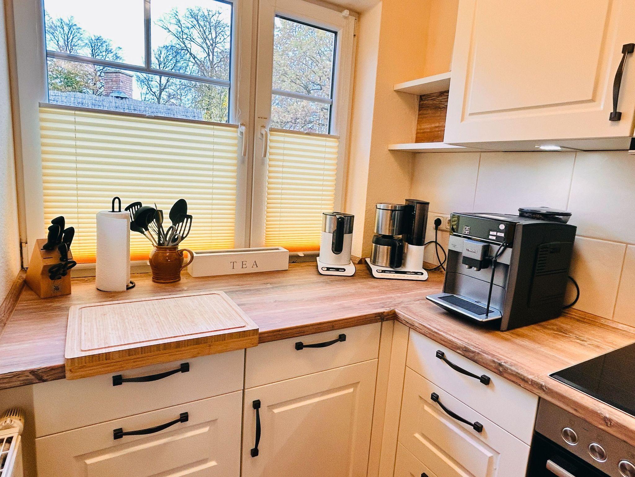 Die separate Küche im Landhausstil wurde im Herbst 2024 neu eingebaut. Sie ist durch ihre sehr geräumige Aufteilung und eine großzügige Arbeitsfläche für jeden Hobbykoch ein Traum. In der Küche befinden sich eine Spülmaschine, eine Kühl-Gefrierkombination, ein 4-Platten-Induktionsfeld, ein Backofen, ein Kaffeevollautomat und diverse Kleingeräte, die die Ausstattung komplettieren. Bis zum Edeka-Einkaufsmarkt mit Bäcker sind es nur wenige Gehminuten.