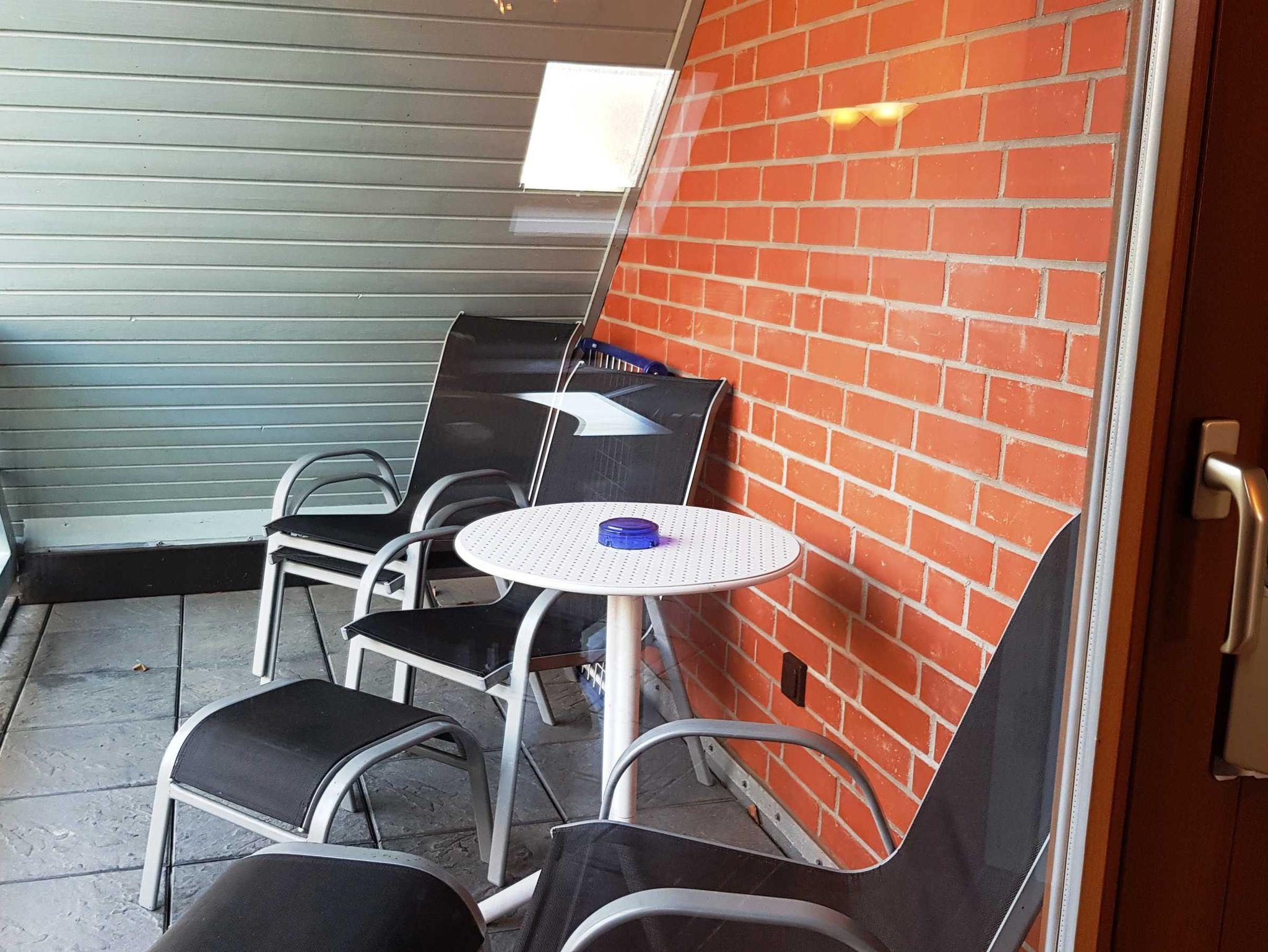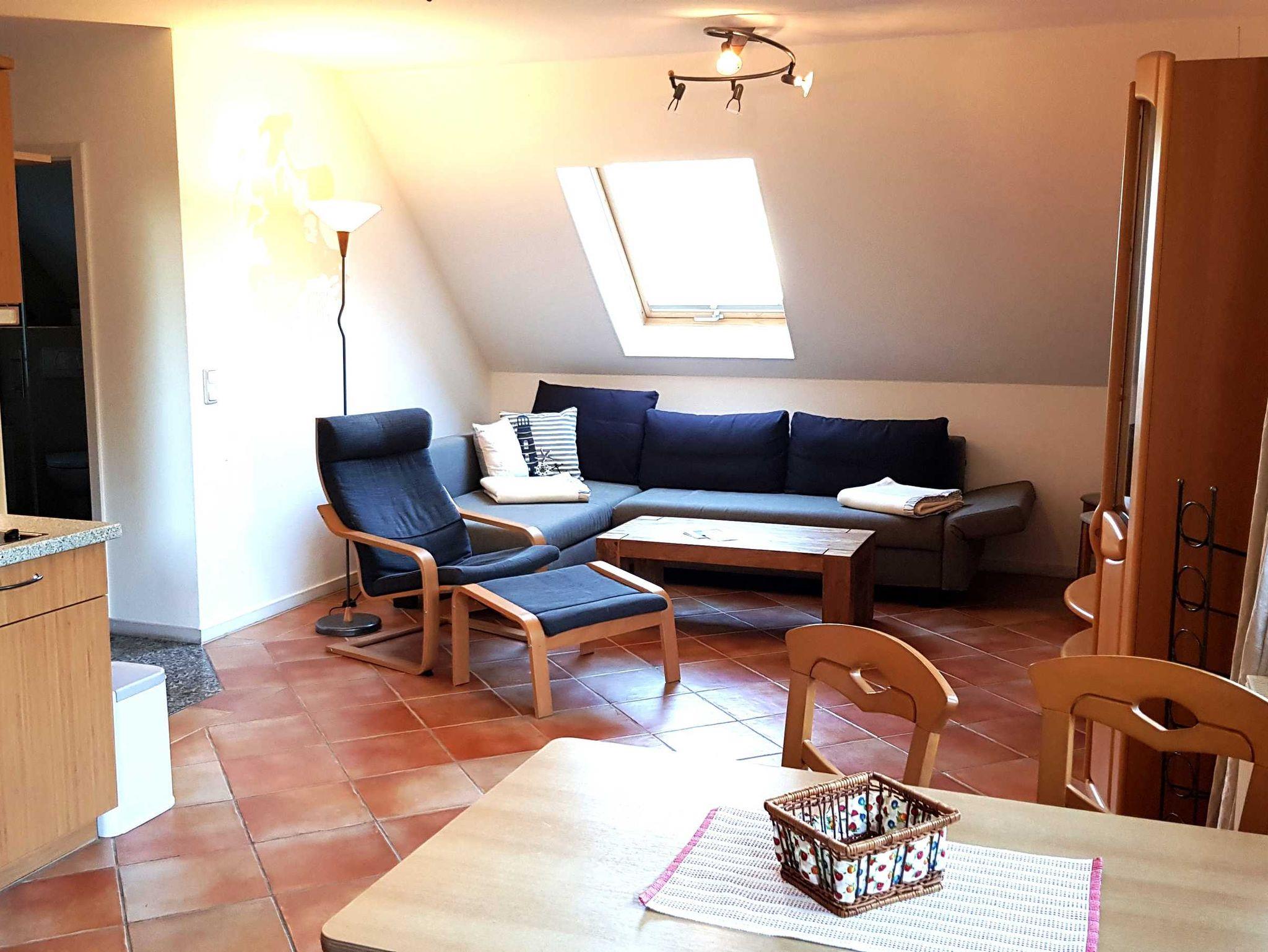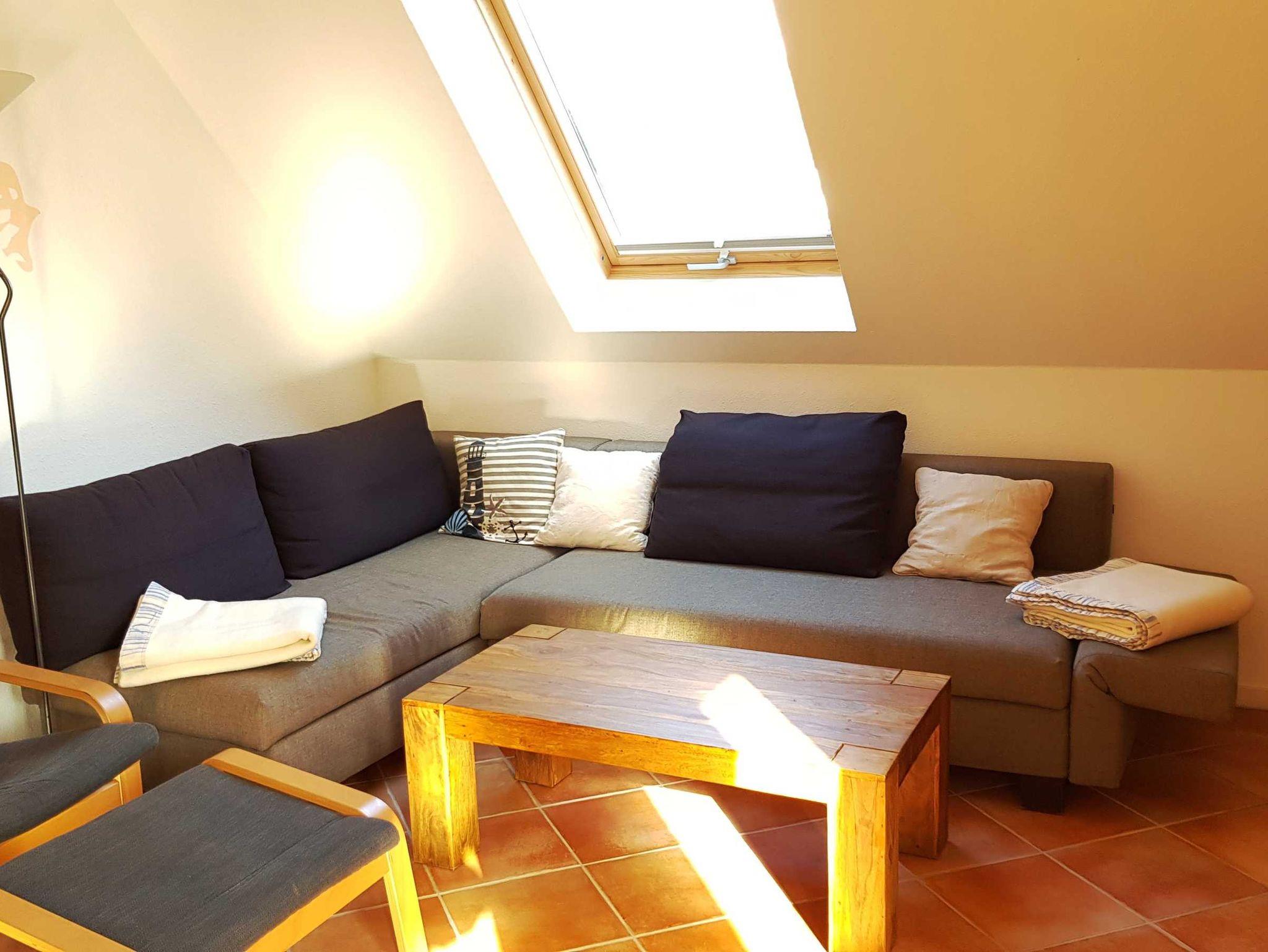 Sie liegt im Ober- und Dachgeschoss, hat eine Größe von 52m² und einen Balkon mit Morgensonne. Im Wohnbereich finden Sie eine Couch und einen Sessel, einen separaten Essbereich, einen Flachbild-TV und eine Stereoanlage.