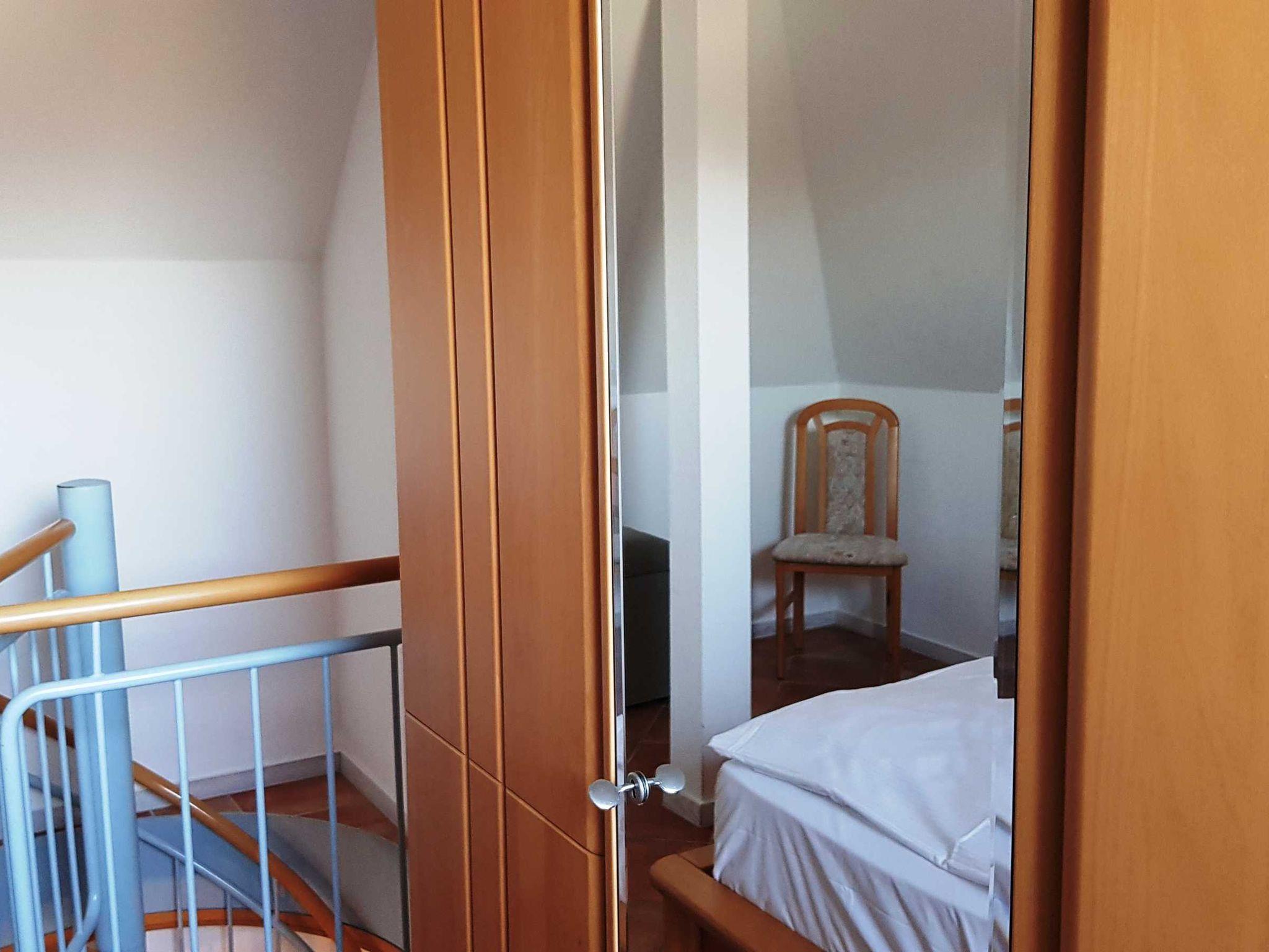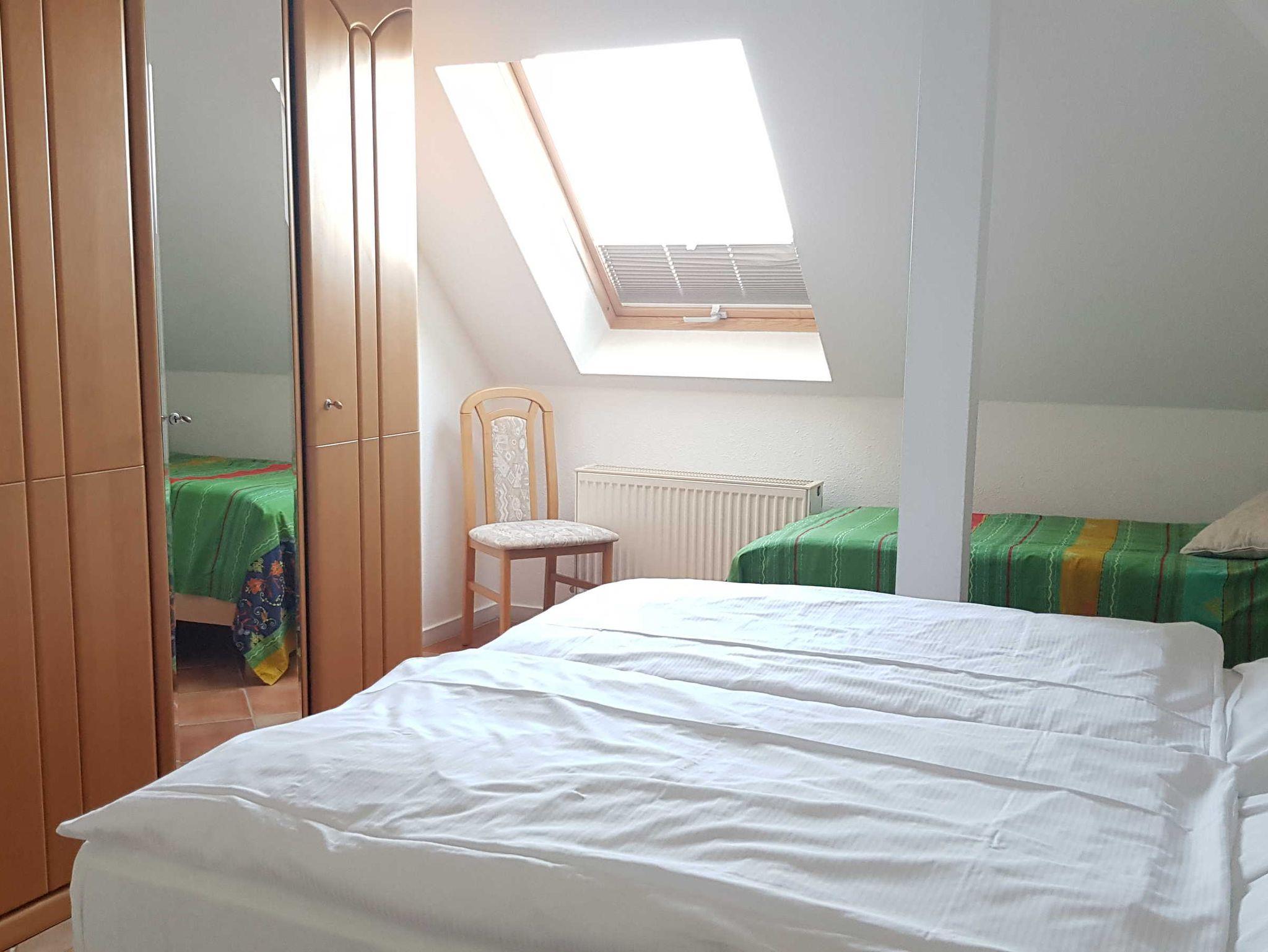 Das Schlafzimmer befindet sich im Dachgeschoss, welches über eine Spartreppe erreichbar ist.