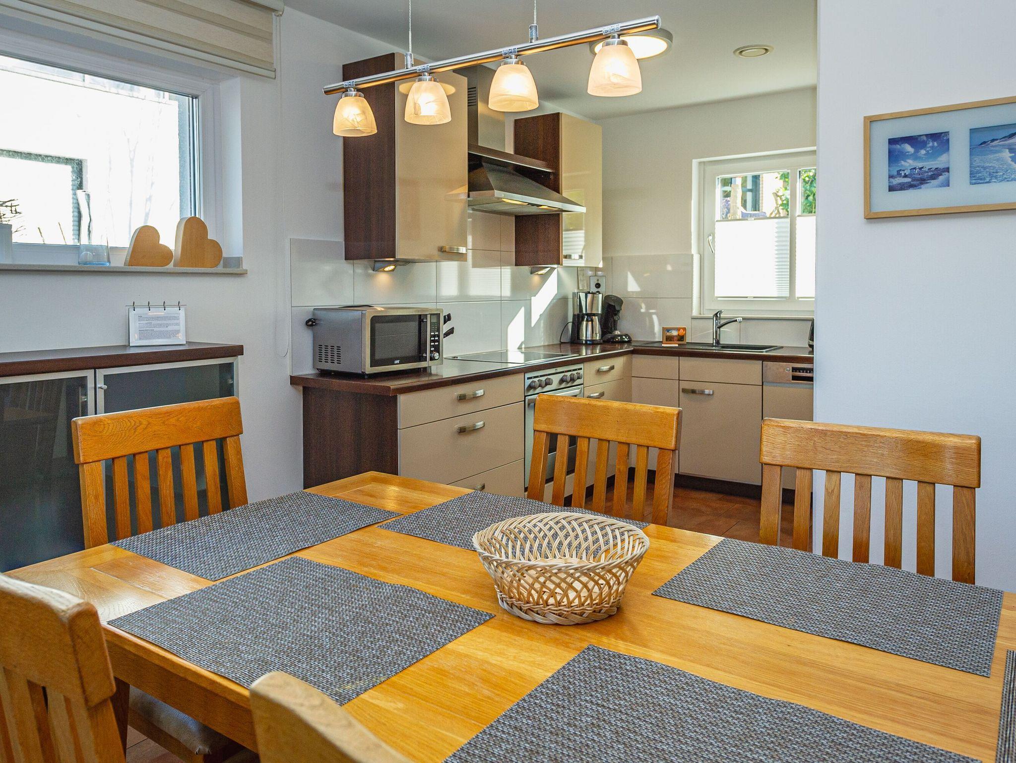 Die hochwertige Nobilia-Einbauküche verfügt über ein Ceran-Kochfeld, einen Backofen auf Augenhöhe, einen Kühl-/Gefrierschrank, einen Geschirrspüler sowie eine Kaffeemaschine, eine Senseo-Padmaschine, einen Toaster, Mikrowelle, Wasserkocher und all die anderen Dinge, die man braucht, um sich selbst zu „bekochen“.