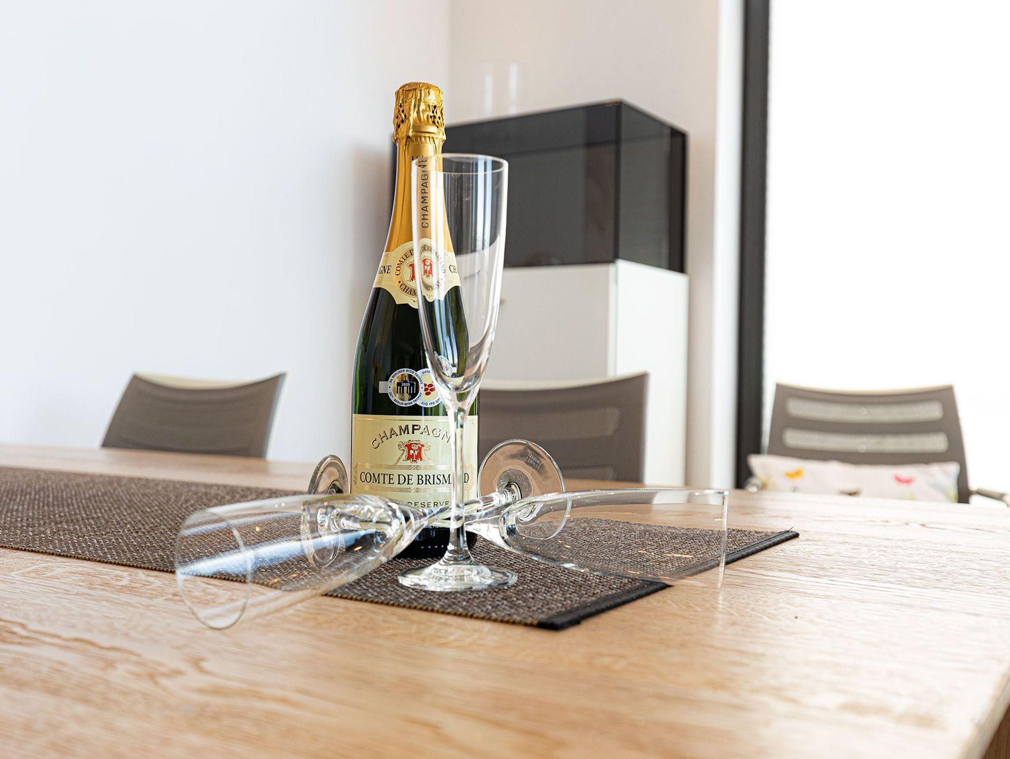 Vom Eingangsbereich aus gelangen Sie zunächst in den weitläufigen Wohn- und Essbereich mit Eichenholzdielung in maritimer Optik. Bodentiefe Fenster ermöglichen eine freie Sicht auf das Meer. Die offene und hochwertig ausgestattete Luxusküche mit professionellem Equipment lässt keine Wünsche offen. Der große Esstisch aus Wildeiche bietet Ihnen und Ihren Gästen ausreichend Platz für ein gemütliches Zusammensein.