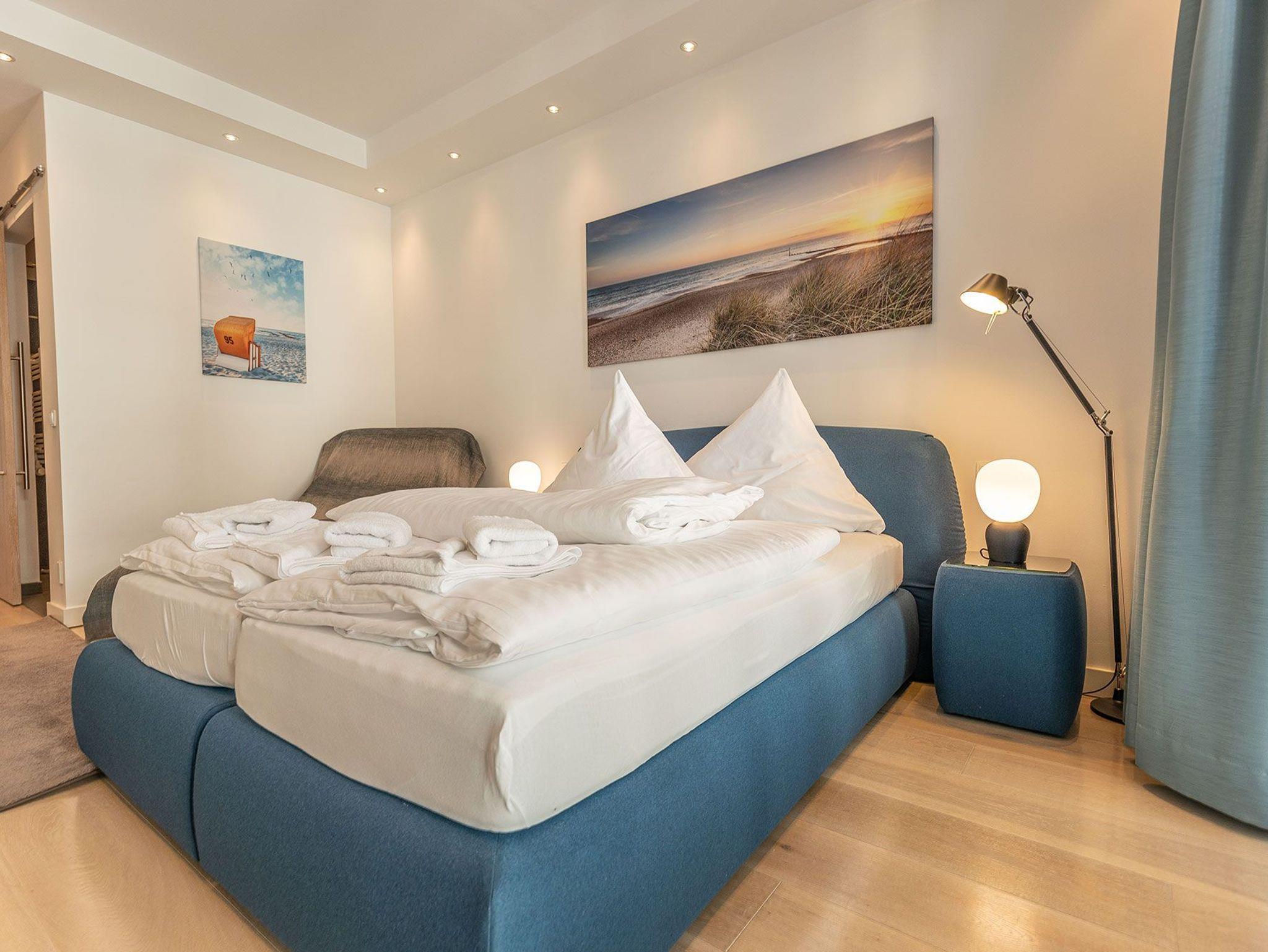 Das Appartement Ocean Blue befindet sich in der 2. Etage der Villa Claire, ist rund 110 Quadratmeter groß und verspricht bis zu fünf Personen einen Urlaub der Spitzenklasse. Für die Einrichtung wurden ausschließlich exquisite Möbel namhafter Marken, wie Rolf Benz und Hülsta, verwendet. Sofort beim Eintreten verspürt man das behagliche Gefühl dieses frischen und modernen Ambientes. Kamin und Fußbodenheizung sorgen für Gemütlichkeit und die dimmbare Beleuchtung für stimmungsvolle Stunden.