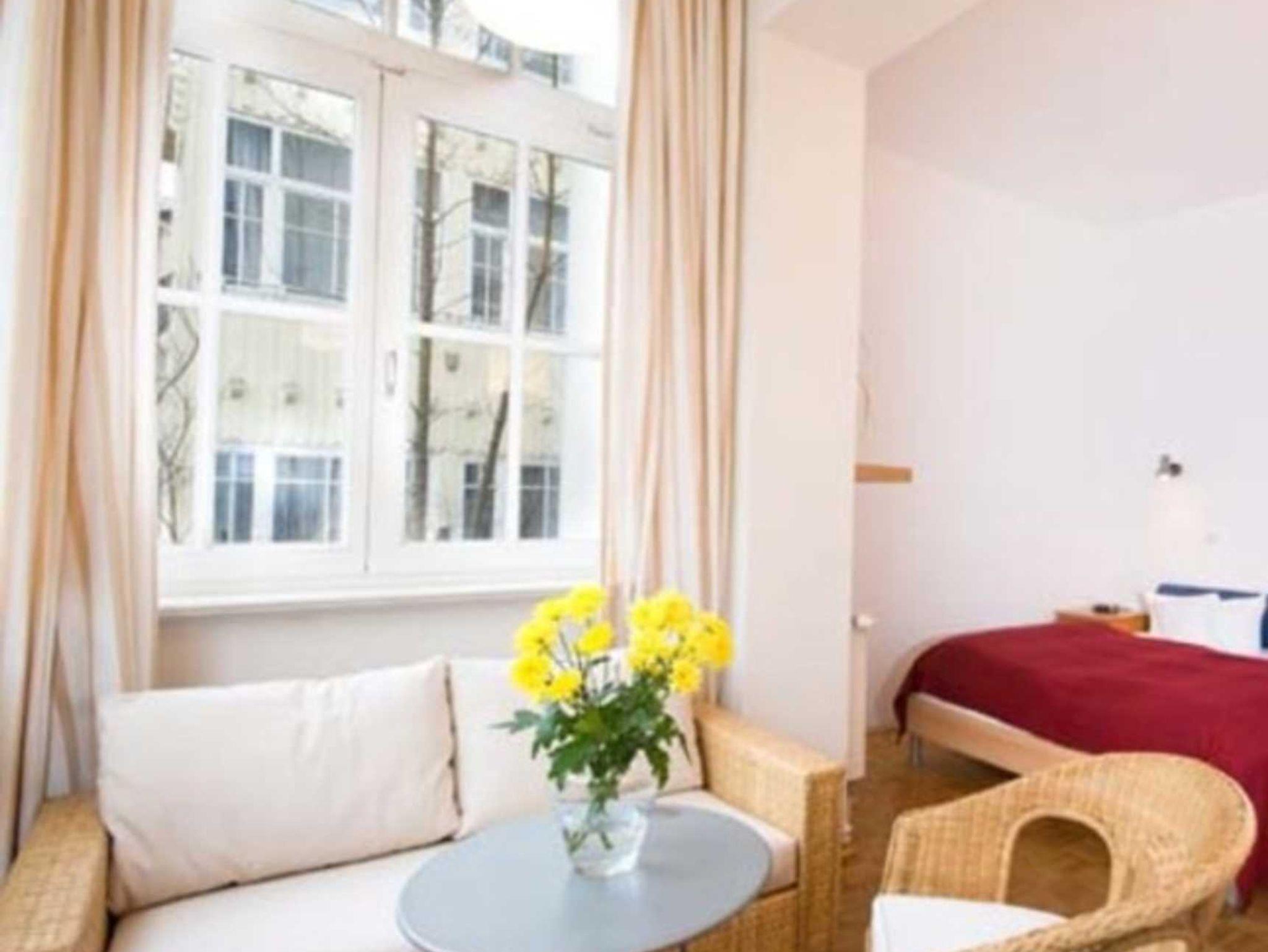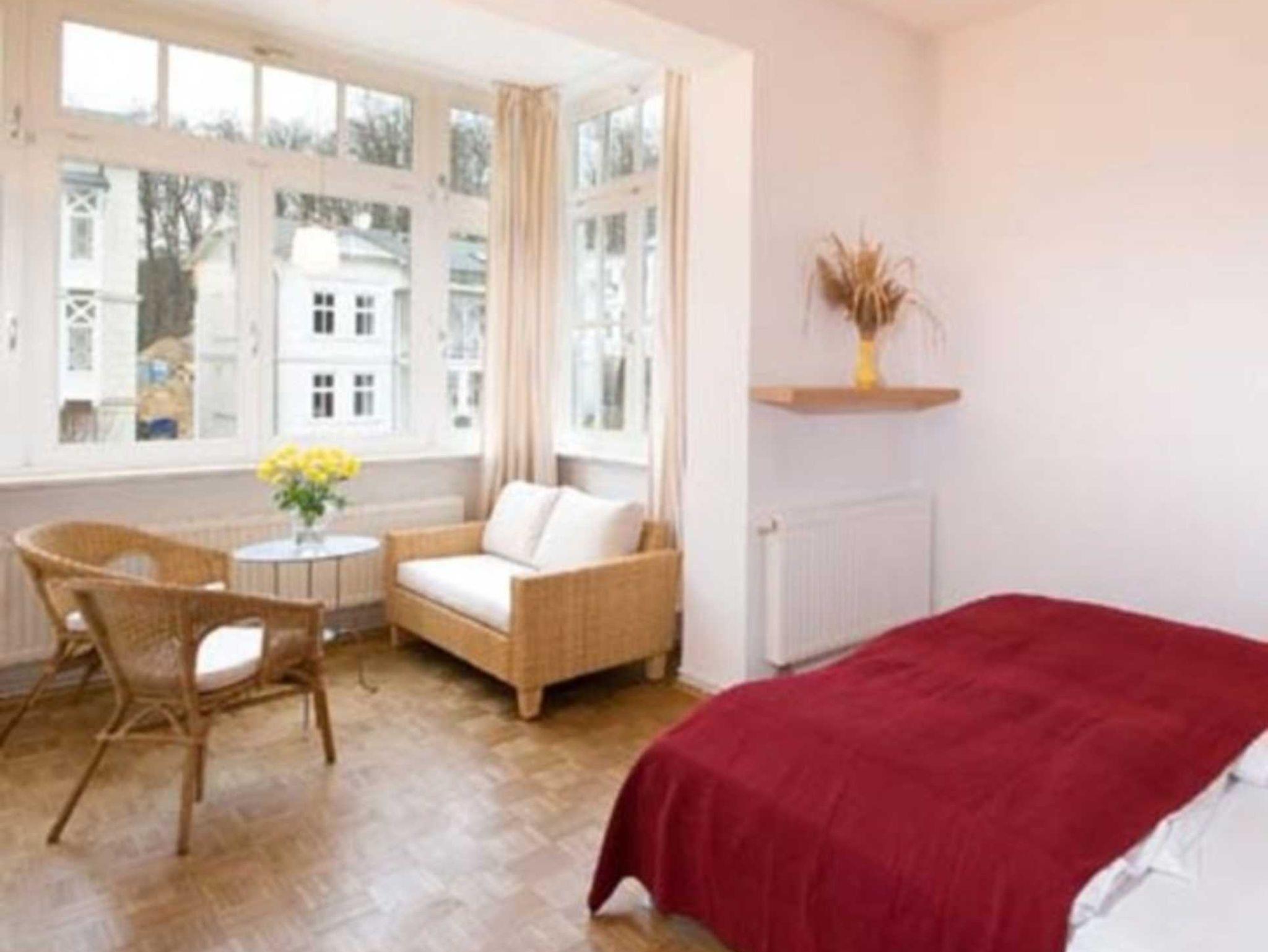Die große Fensterfront des Wintergartens zeigt nach Osten und liegt in der Nachmittags- und Abendsonne. Sie haben einen weiten Blick zwischen den Häusern der Wilhelmstraße hindurch bis zum Meer am Horizont. Die Wohnung ist vom Vermieter mit Bettwäsche, Hand- und Geschirrtüchern ausgestattet. Die Betten sind bezogen. Wäschewechsel gegen Gebühr.