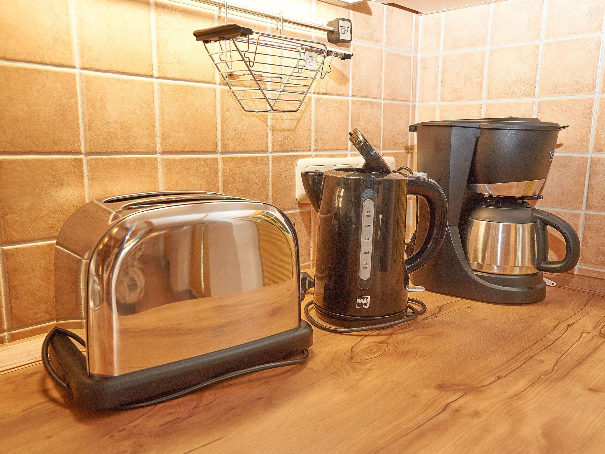Zwei Sofas vor dem großformatigen Flachbild-TV, kostenfreies W-LAN und der Kaminofen laden zum Relaxen ein. Der große Esstisch ist für 4 Personen geeignet. Die harmonisch im Wohnbereich integrierte Küchenzeile ist ausgestattet mit einem 4-Zonen-Cerankochfeld, einem Kühlschrank mit Gefriermöglichkeit, einer Spülmaschine, einer Mikrowelle mit Grill, Kaffeemaschine, Toaster, Wasserkocher und diversem Kleininventar, das die Ausstattung komplettiert. Auch Ihre Waschmaschine wurde hier integriert.