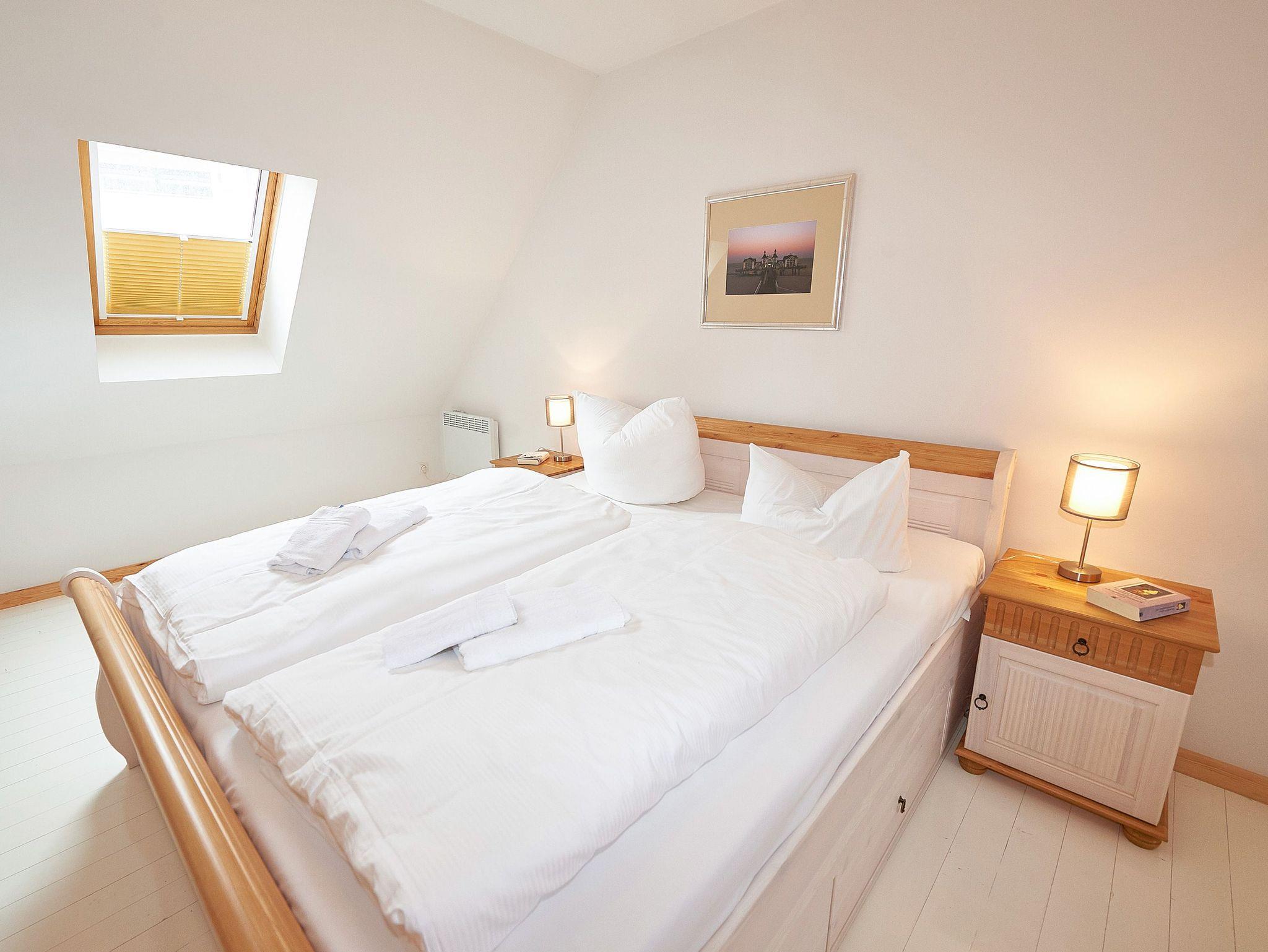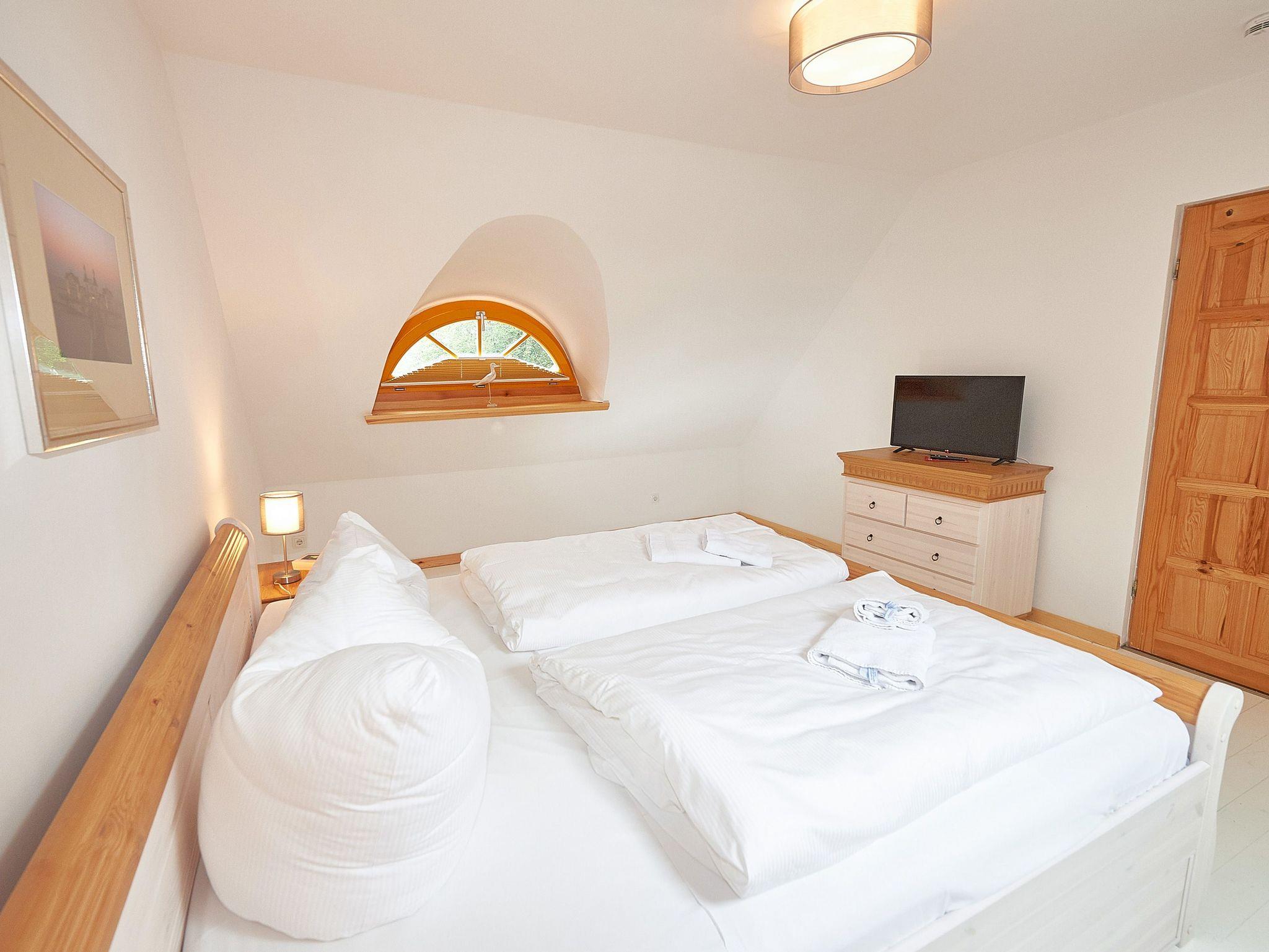 Die beiden Schlafzimmer erwarten Sie im Obergeschoss. Während das größere mit einem Doppelbett und einem zweiten TV-Gerät ausgestattet ist, verfügt das kleinere über zwei Einzelbetten sowie genügend Stauraum für Ihre Garderobe.