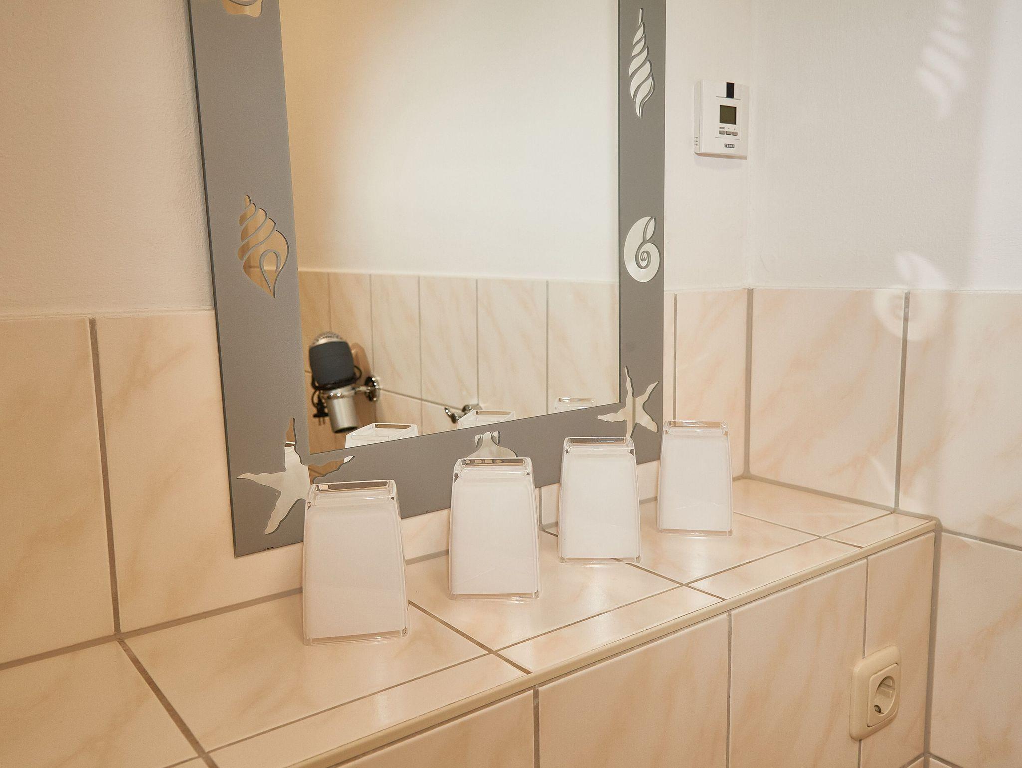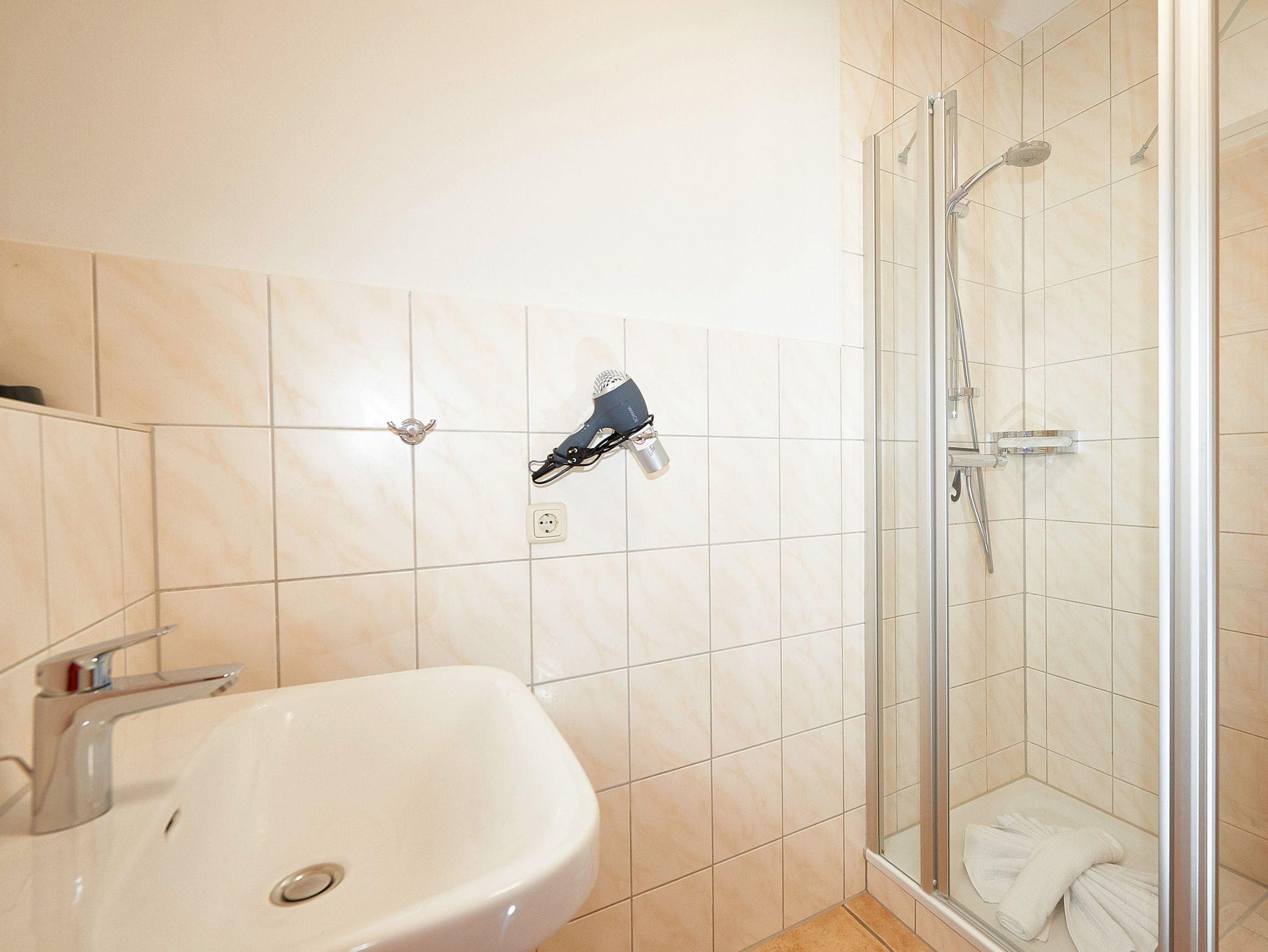 Das Badezimmer befindet sich ebenfalls im Erdgeschoss und bietet Dusche/WC, einen beheizbaren handtuchtrockner sowie einen waschtisch inklusive Fön.
