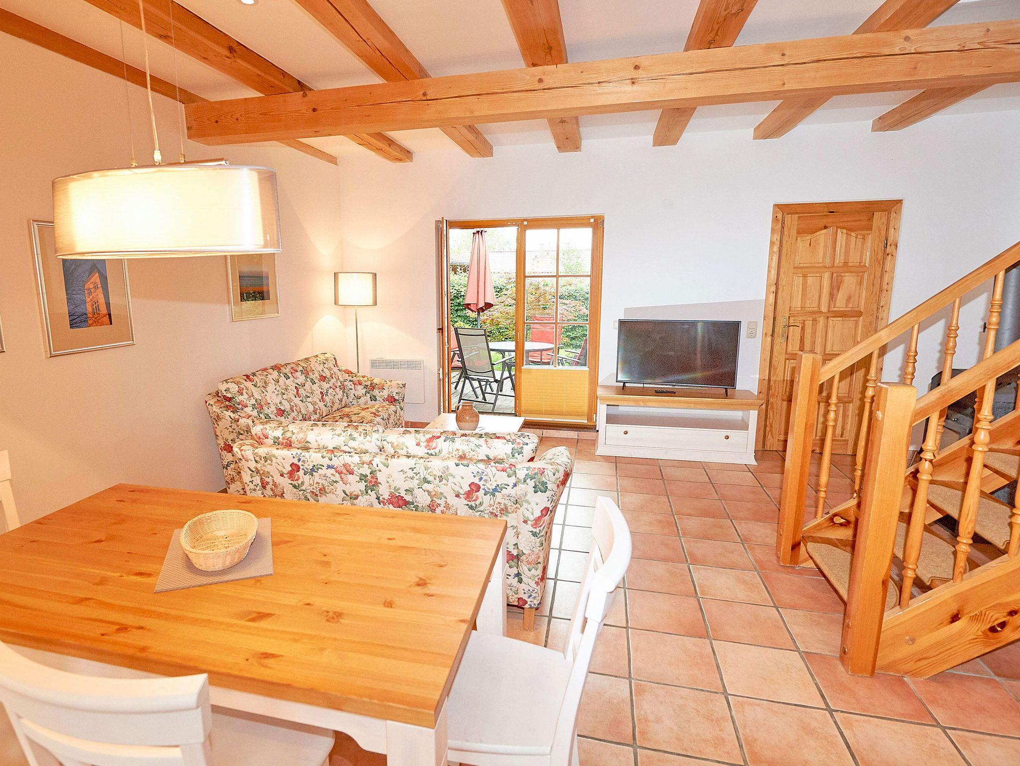 Die Haushälfte 3 erstreckt sich über zwei Ebenen und rund 100 m² Wohnfläche. Im Erdgeschoss finden Sie Ihr geräumiges Wohnzimmer, das durch die offenen Balken besonders gemütlich wirkt. Die dem Wohnzimmer vorgelagerte Terrasse zur Westseite ist mit Sonnenliegen und Sitzgruppe ausgestattet.