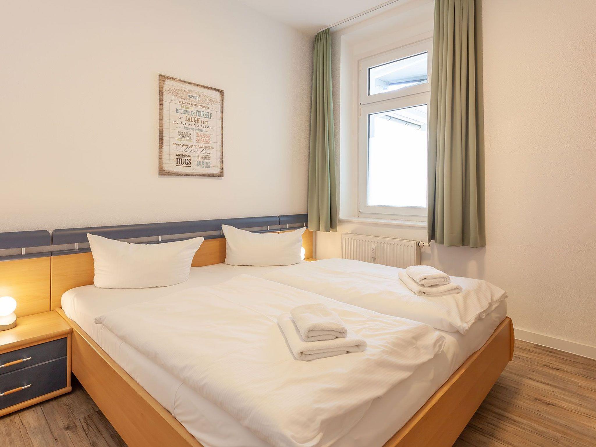 Zwei Schlafzimmer mit je einem Doppelbett und einem geräumigen Kleiderschrank bieten Platz für 4 Personen. Eine Aufbettung zur 5. und 6. Person ist auf der ausziehbaren Schlafcouch im Wohnzimmer möglich. Das Badezimmer überzeugt mit einem geräumigen Duschbad und einem separaten WC mit Handwaschbecken.