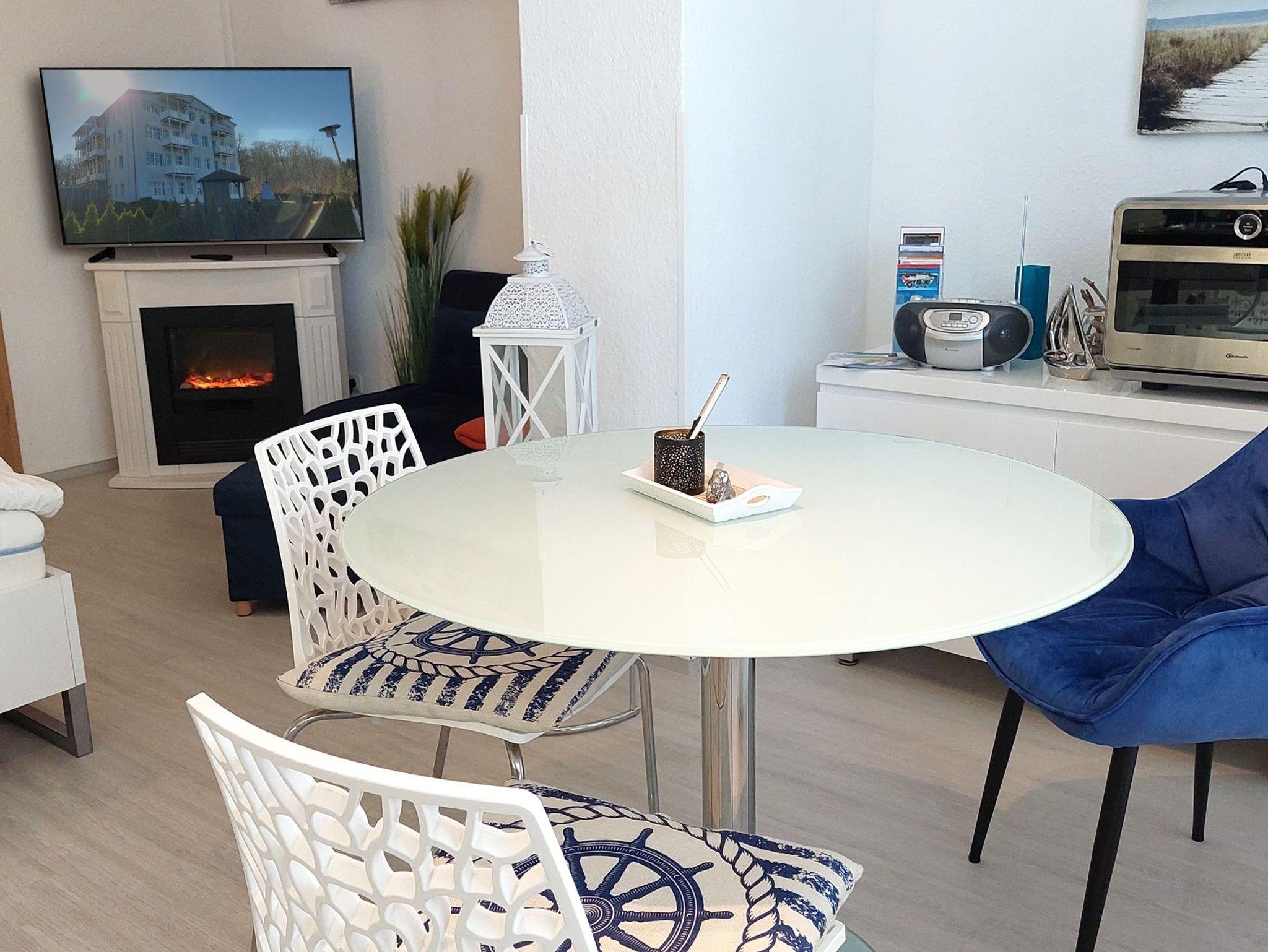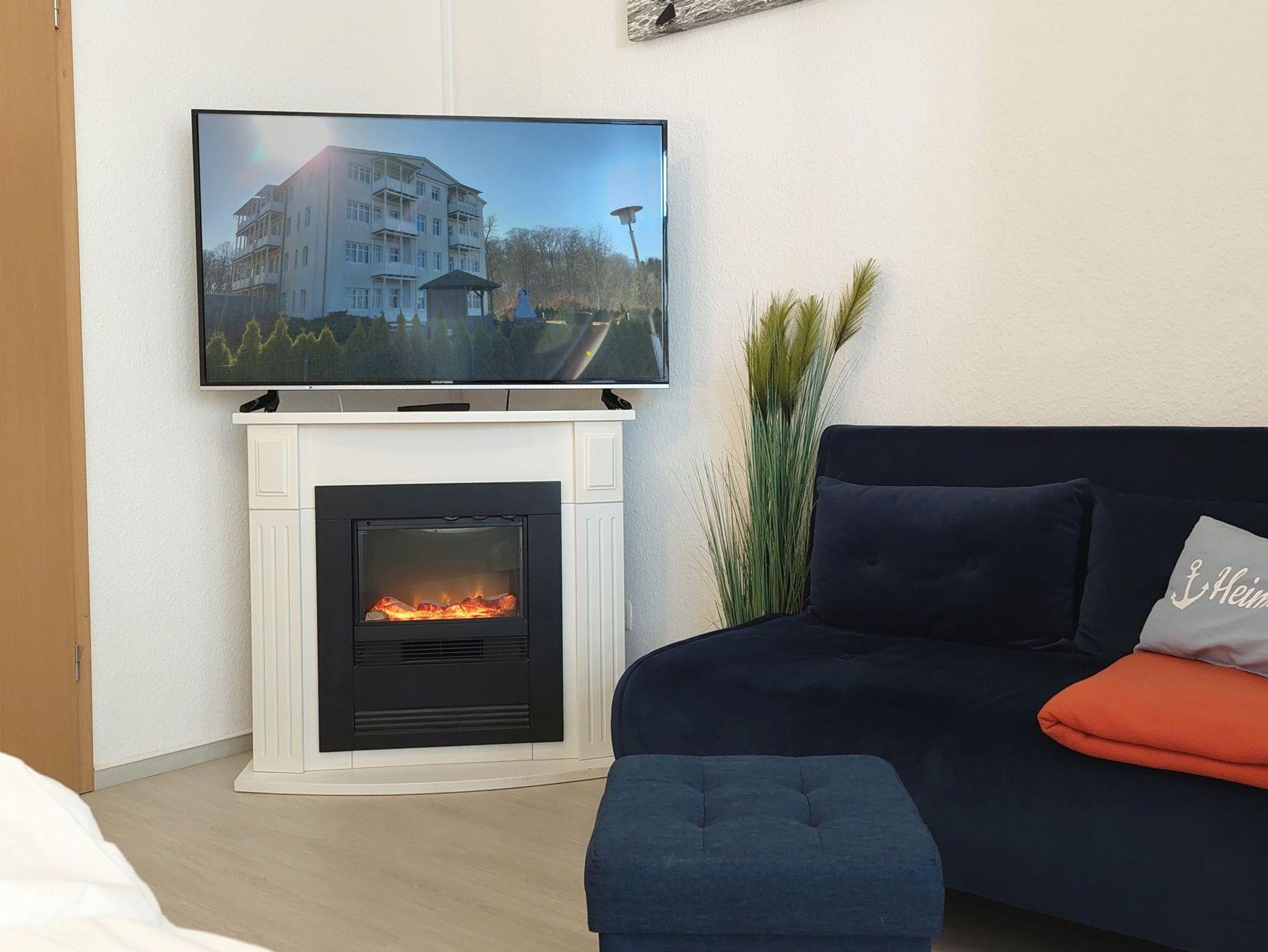 Für gute Unterhaltung bei jeder Wetterlage sorgen ein großer Smart-TV samt stabilem WLAN, eine kleine Musikanlage und ein Elektro-Kamin.
