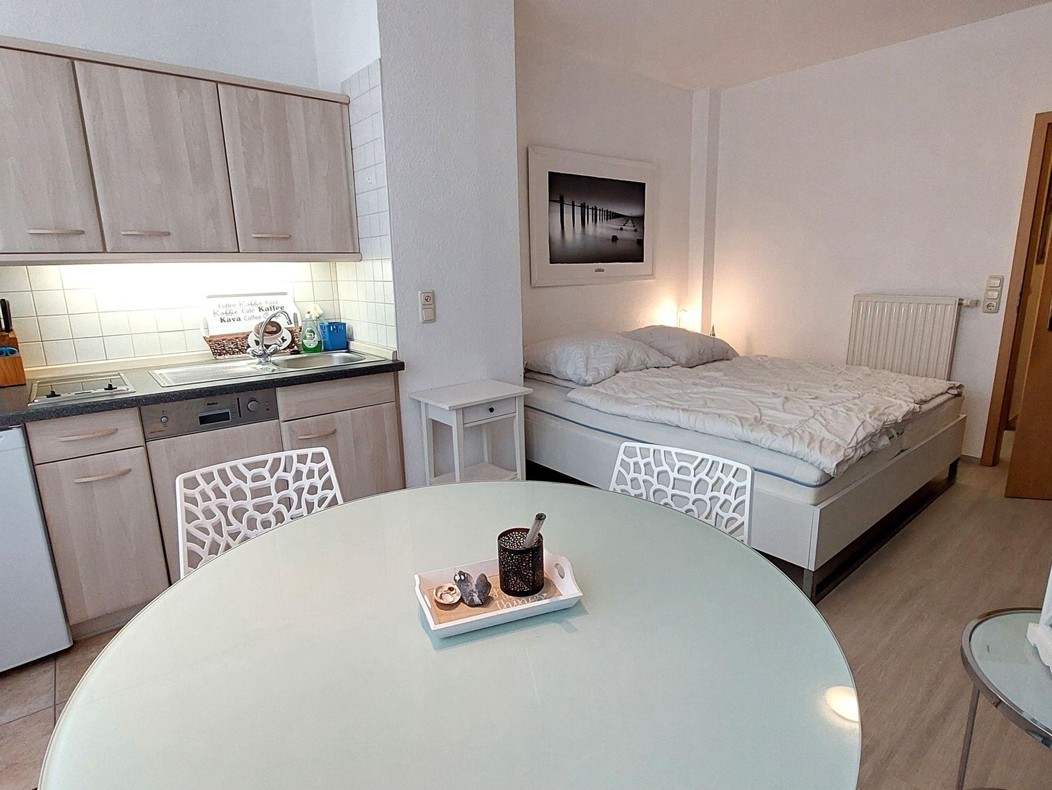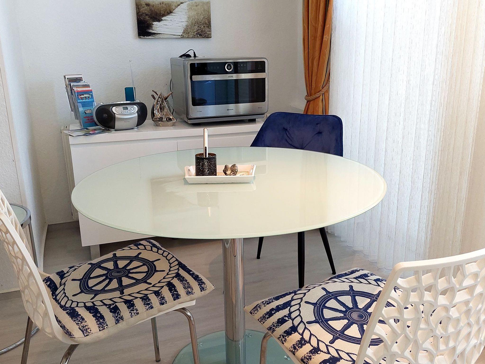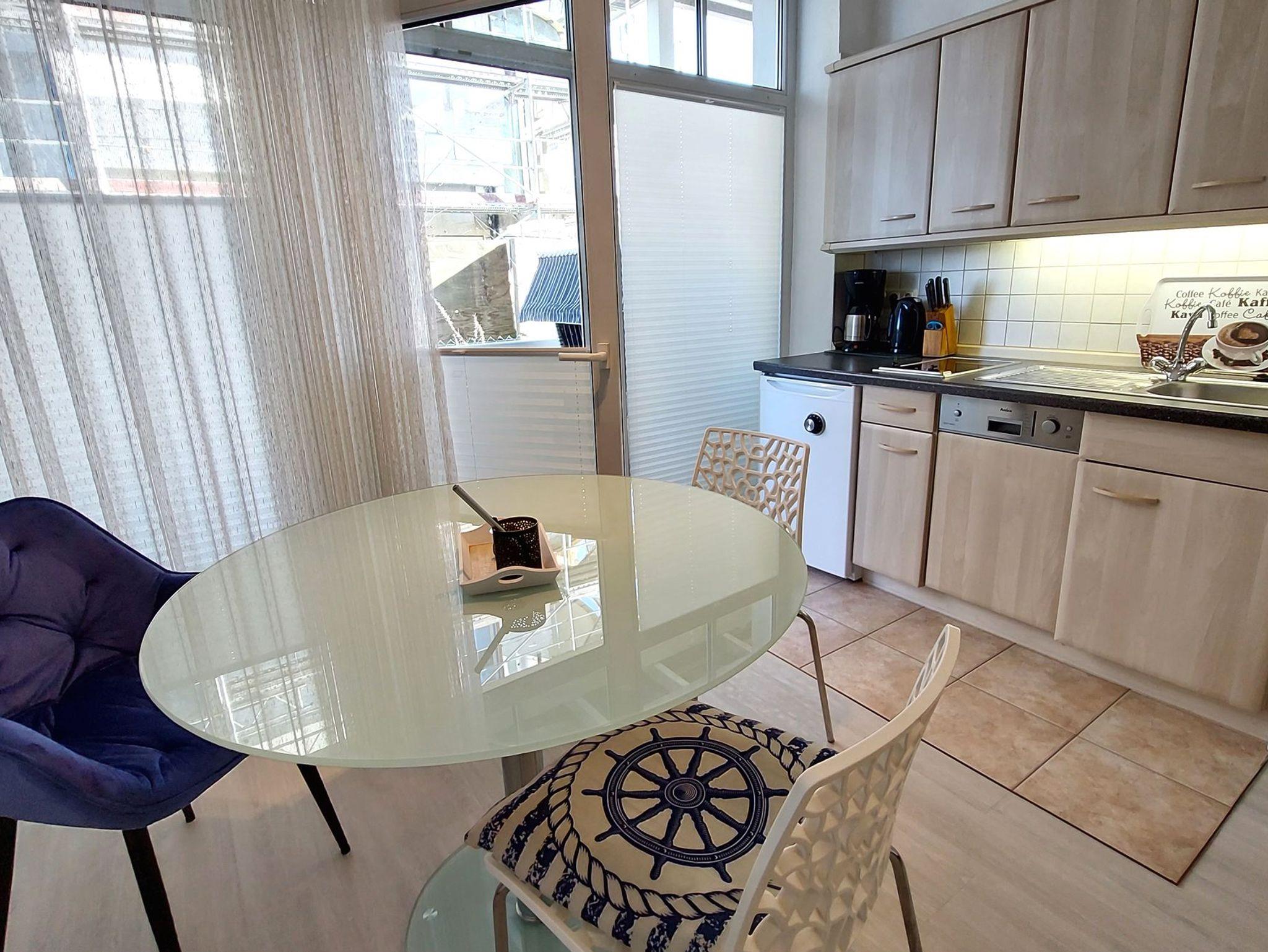 Es gibt eine moderne Küchenzeile mit 2-Platten-Cerankochfeld, Geschirrspüler und Kühlschrank. Ein Backofen (mit Mikrowellenfunktion) und viele weitere Küchenhelfer sorgen dafür, das man sich auch im Urlaub bequem selbst verpflegen kann. Der Esstisch bietet Sitzgelegenheiten für 3 Personen.