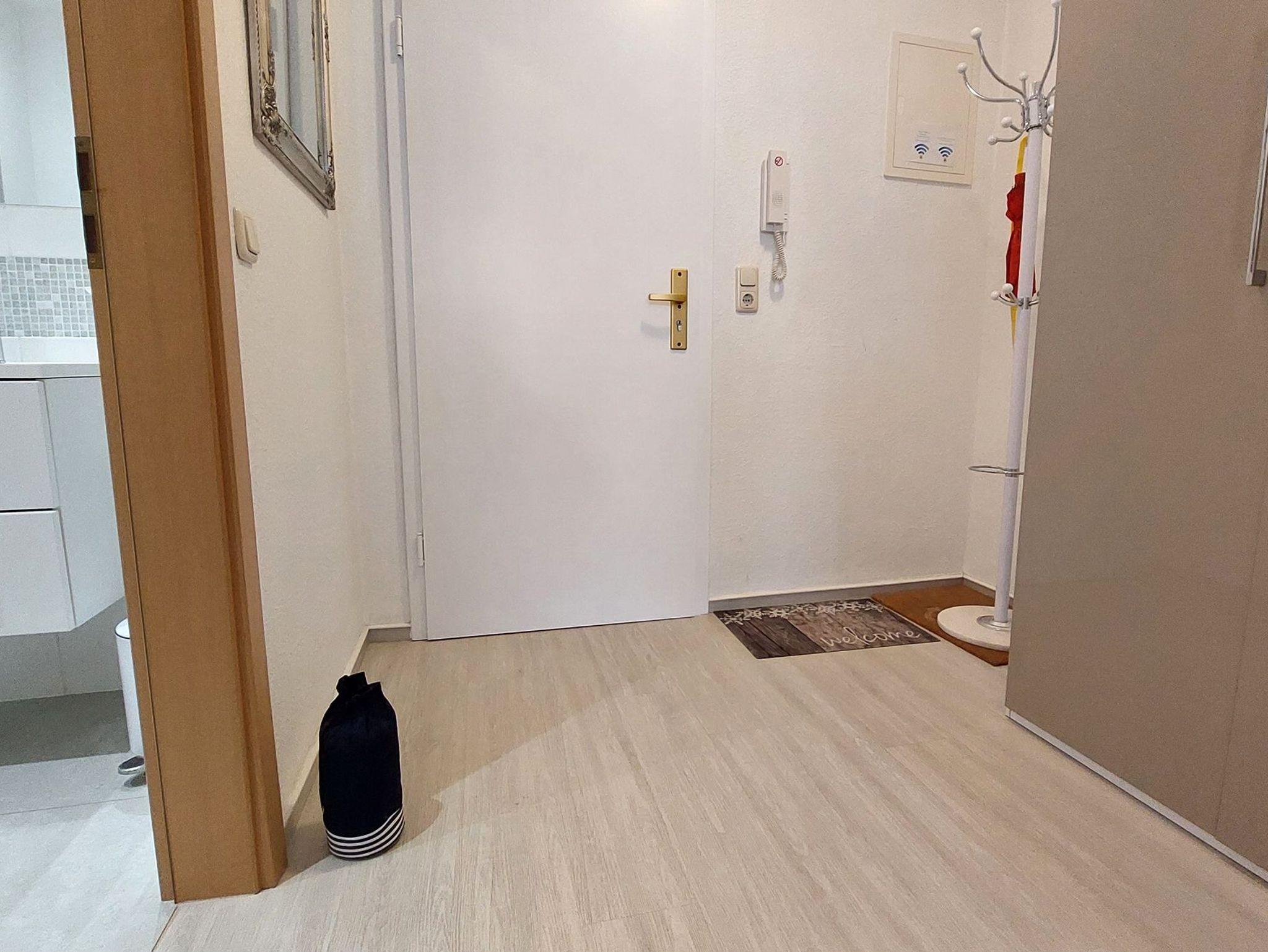 Der Flur bietet eine Garderobe, einen großen Kleiderschrank und Zugang zum Bade- und Wohnzimmer.