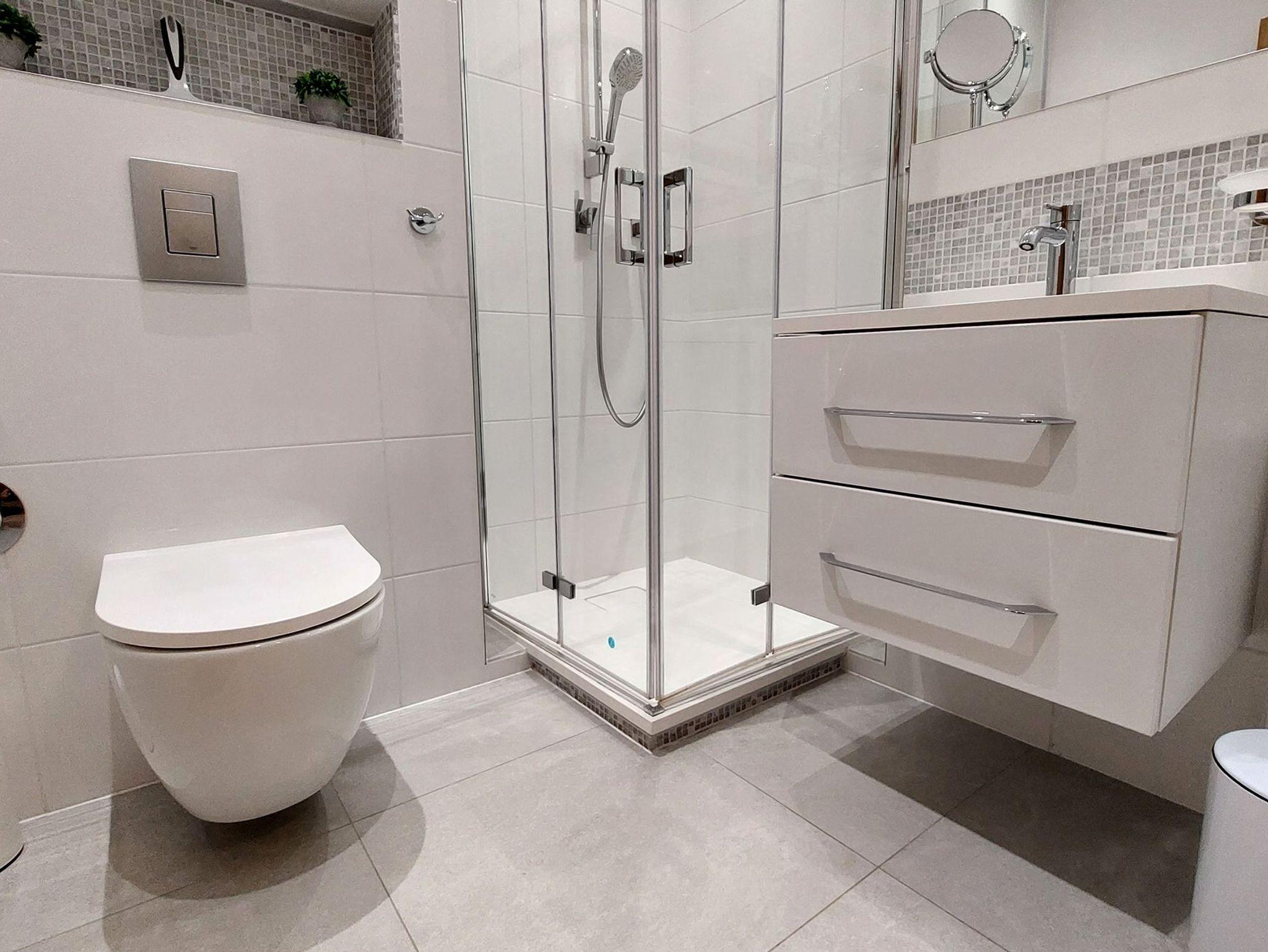 Das Bad verfügt über WC, Dusche, Waschbecken sowie Fön und Kosmetikspiegel.