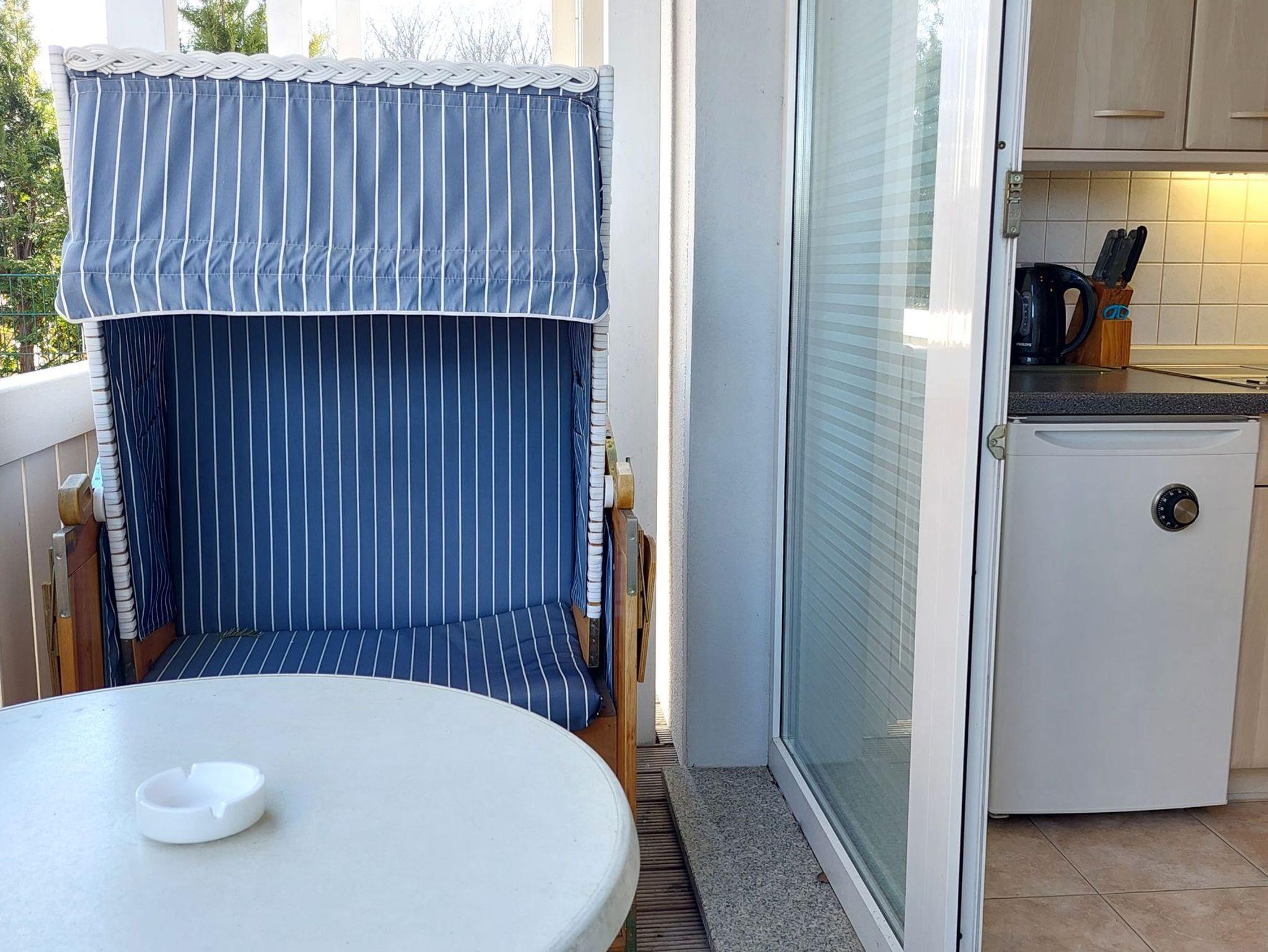 Vom Küchenbereich gelangen Sie auf den möblierten und umfriedeten Balkon. Dieser bietet nicht nur einen eigenen Strandkorb sondern auch noch einen kleinen seitlichen Blick zu Meer.