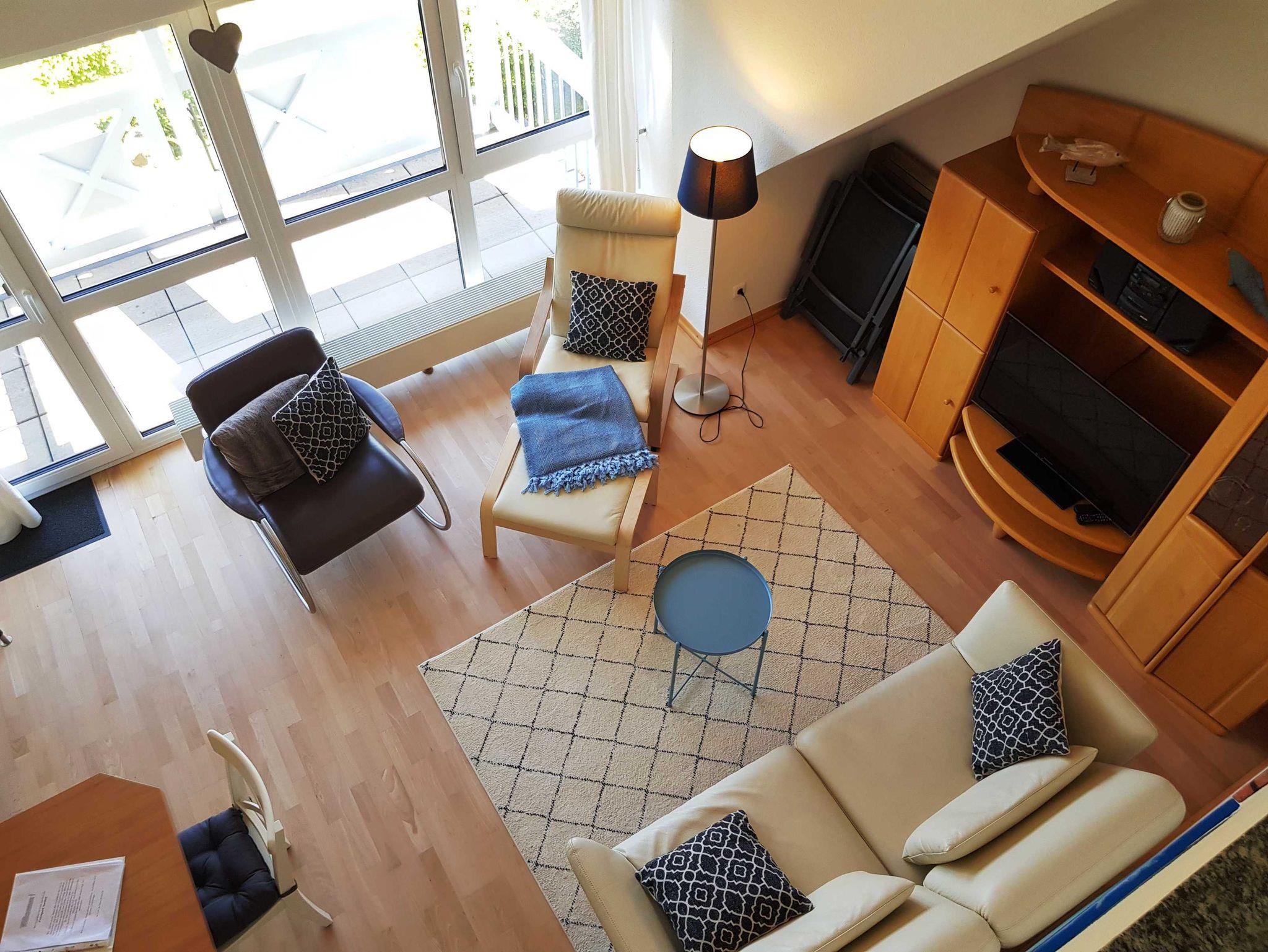 Die Wohnung 06 im Haus Granitz ist eine 3-Zimmer-Maisonette-Wohnung mit Galerie, die bis zu 4 Personen Platz und Komfort bietet. Sie befindet sich im Ober- und Dachgeschoss und hat eine Größe von ca. 54 qm. Sowohl vom Balkon, als auch aus dem Wohnraum hat man einen schönen Blick auf den Neuensiener See (und falls die Sonne scheint, auf spektakuläre Sonnenuntergänge). Der Wohnbereich ist mit einer hochwertigen Multifunktionscouch sowie einem Schwingsessel (beide mit Lederbezug) möbliert. Durch die Angliederung der Bereiche Kochen und Essen ist die Wohnung sehr großzügig. Die Küche ist mit Backofen, Geschirrspüler und Kühlschrank (mit Gefrierfach) ausgestattet, die nötigen Küchenutensilien (neues Geschirr und Besteck) sind in ausreichender Zahl vorhanden. Vom Wohnraum aus erreicht man über eine Wendeltreppe die Galerie, die über einen zum Bett (ca. 190 x 90 cm) ausziehbaren Sessel (als 4. Schlafgelegenheit) verfügt. Daran schließt sich ein Hauptschlafzimmer mit Doppelbett (ca. 200 x 180 cm) sowie ein zusätzliches kleines Schlafzimmer (Koje) mit einem Bett (ca. 200 x 90 cm) an. Selbstverständlich sind die Matratzen sowie die Kopfkissen und Bettdecken neuwertig. Komplettiert wird die Wohnung durch ein in Marmor und Granit gehaltenes Duschbad (mit Duschbatteriethermostat) im Obergeschoss.