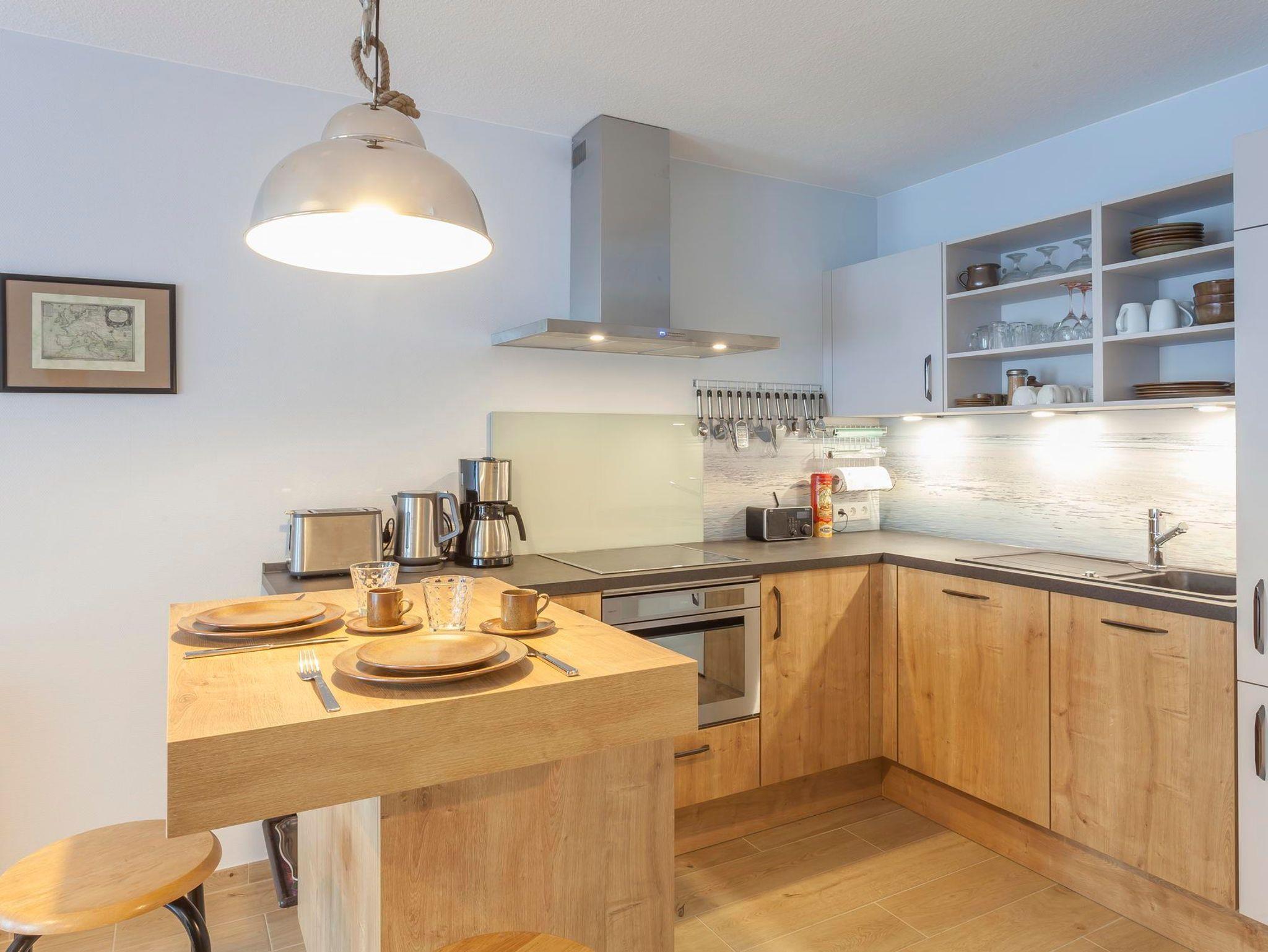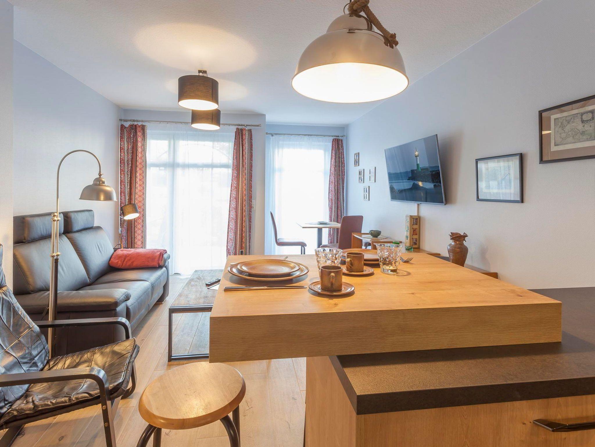Das kombinierte Wohn- und Esszimmer verfügt über eine Ledersitzgarnitur, einen großformatigen Flachbild-TV, eine sehr gut ausgestattete Küchenzeile und eine vorgelagerte Terrasse, auf der man im wohnungseigenen Strandkorb seinen Morgenkaffee genießen oder an lauen Sommerabenden entspannt draußen sitzen kann.