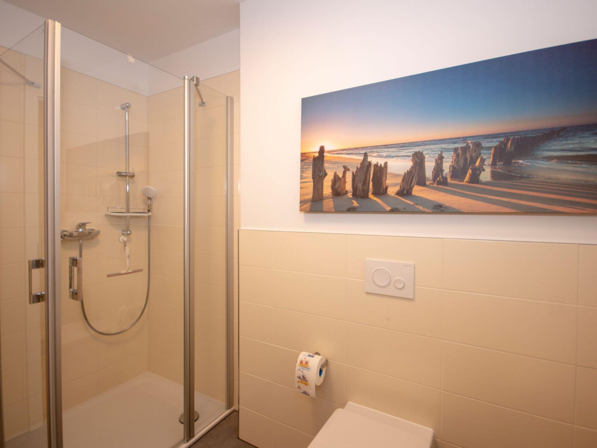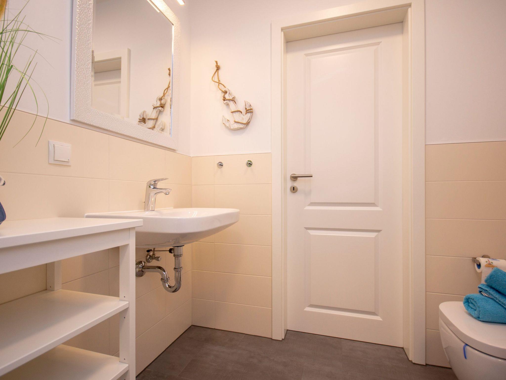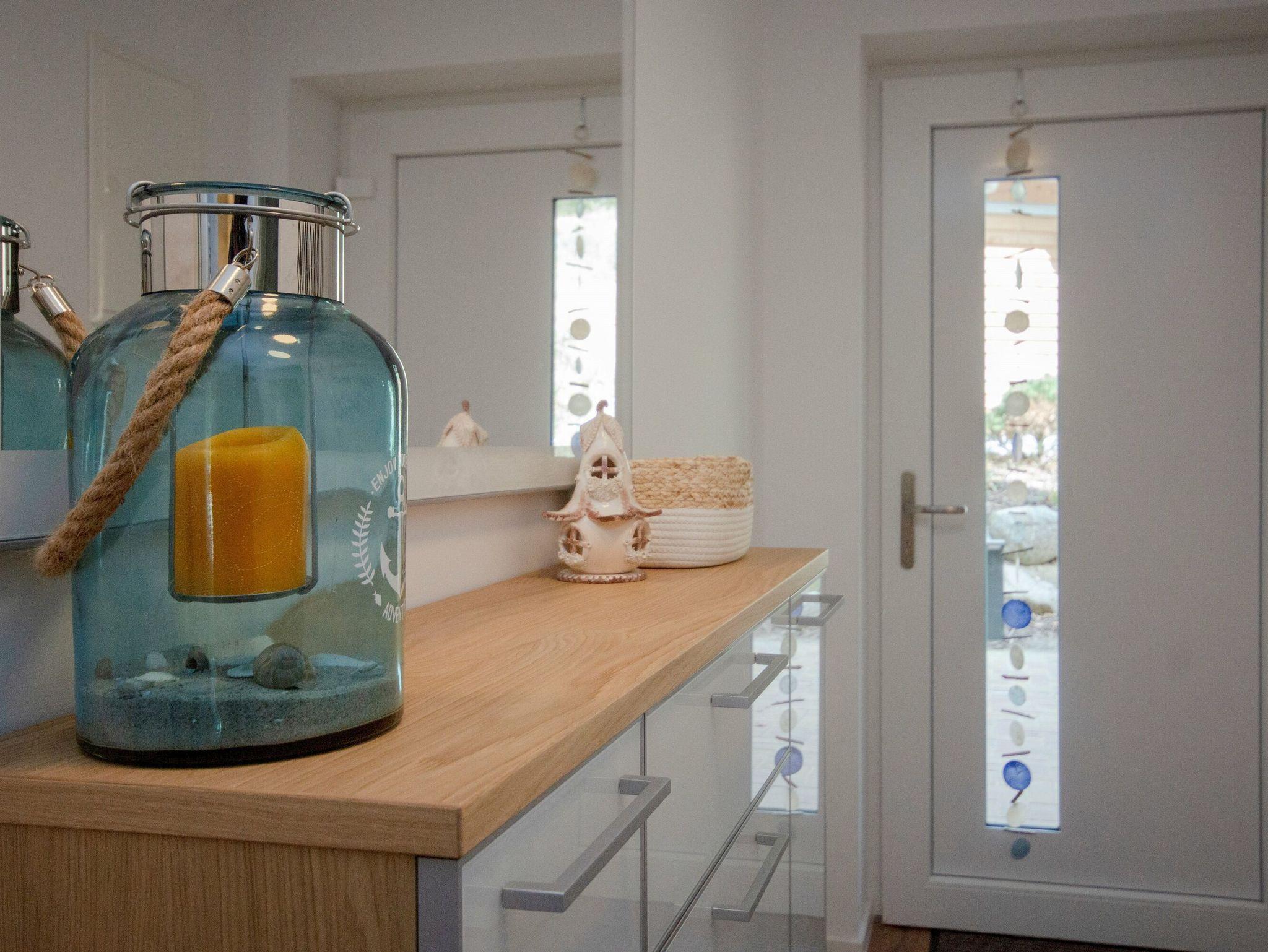Der helle Eingangsbereich führt Sie, umgeben von ausgewählter Dekoration, in alle weiteren Räume. Die beiden Schlafbereiche verfügen über je ein Doppelbett und elektrische Außenjalousien, die Ihnen erholsame Schlafstunden garantieren. Alle Fenster der Schlafbereiche und des Badezimmers sind mit hochwertigen Fliegengittern ausgestattet. Neben dem freundlichen Tageslichtbadezimmer mit ebenerdiger Glasdusche befindet sich ein zusätzliches Gäste-WC in dieser Ferienwohnung.